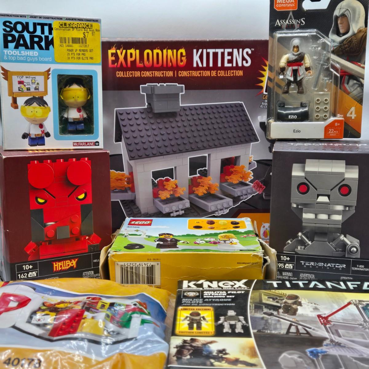 LOT 35: Various Block Building Toys Including Exploding Kittens and More NIB