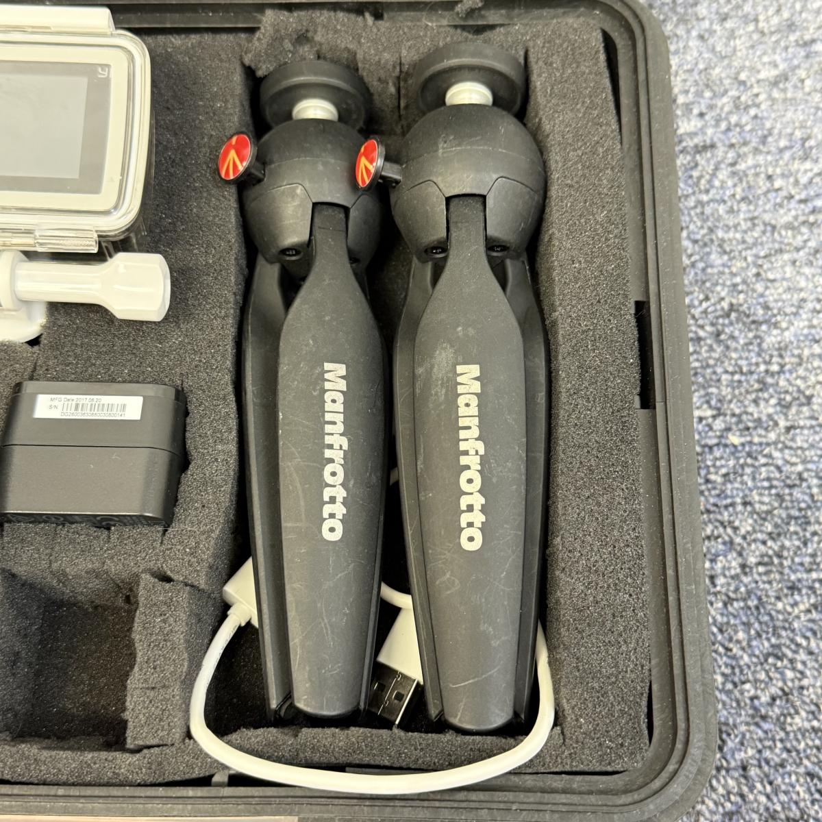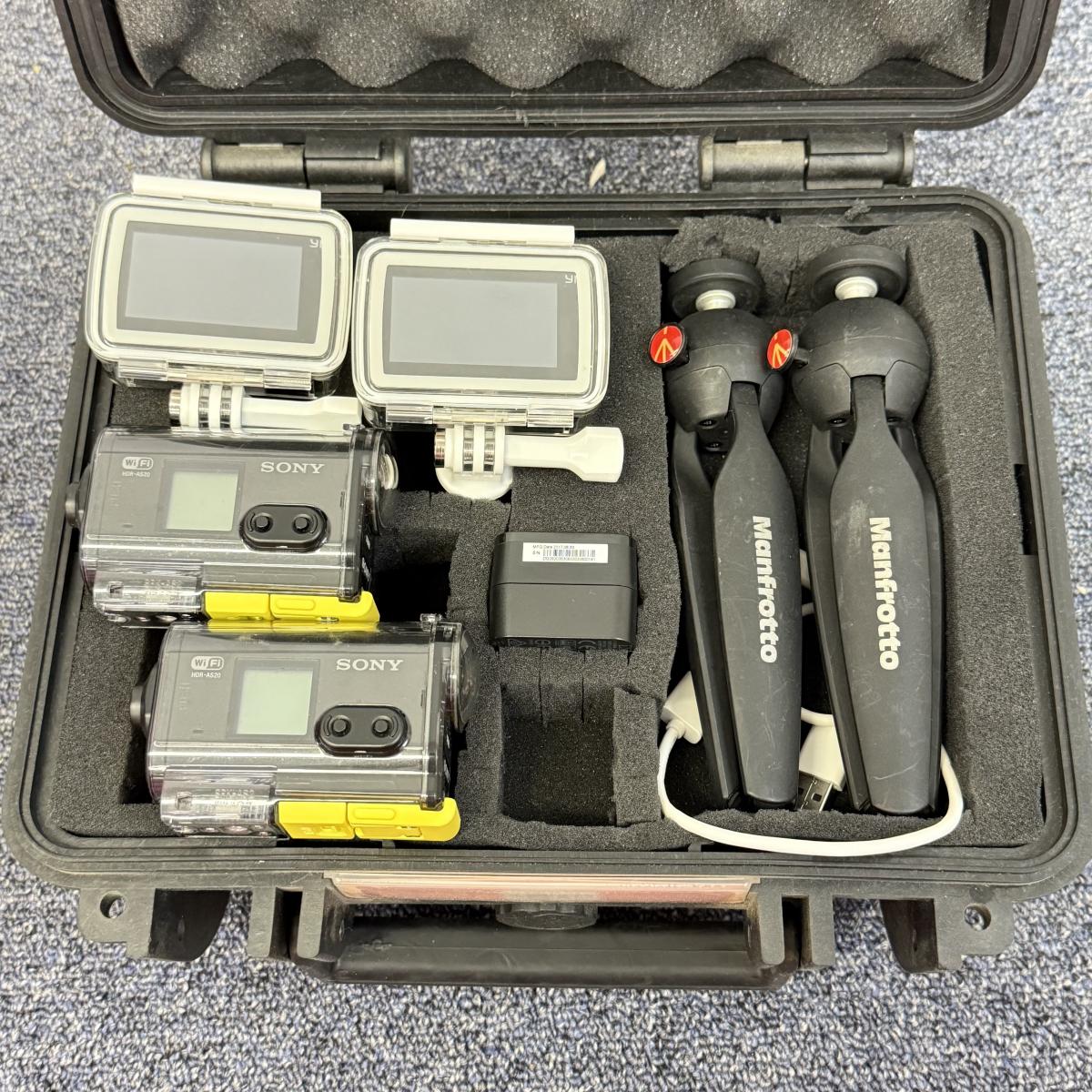 LOT 92: 2 Yi 4k Action Cameras Model YAS.1616.INT, 2 Sony Exmor R SteadyShot HDR-AS20 Cameras w/ Case & 2 Mini Manfrotto Tripods