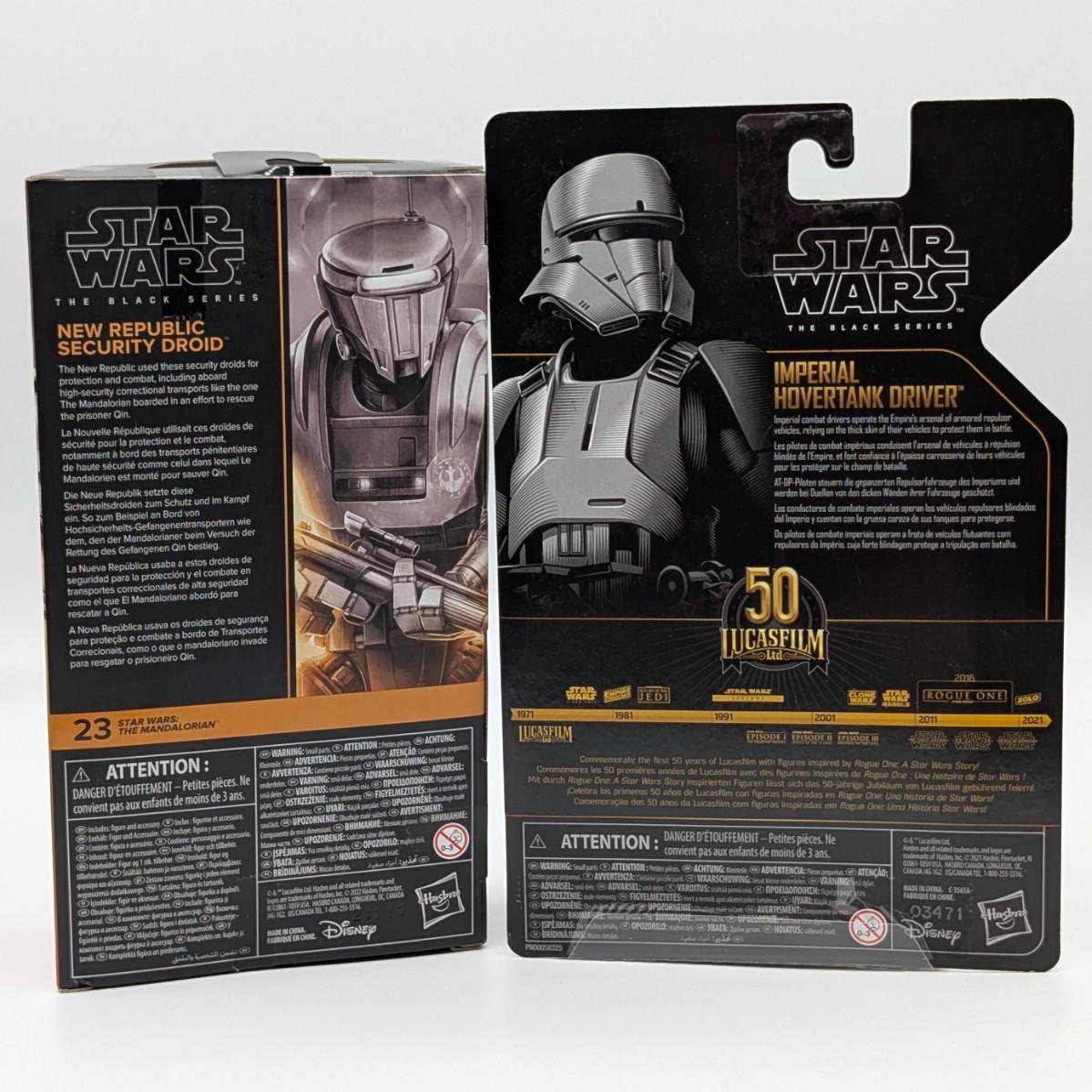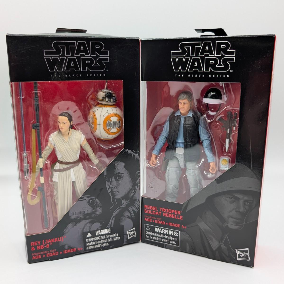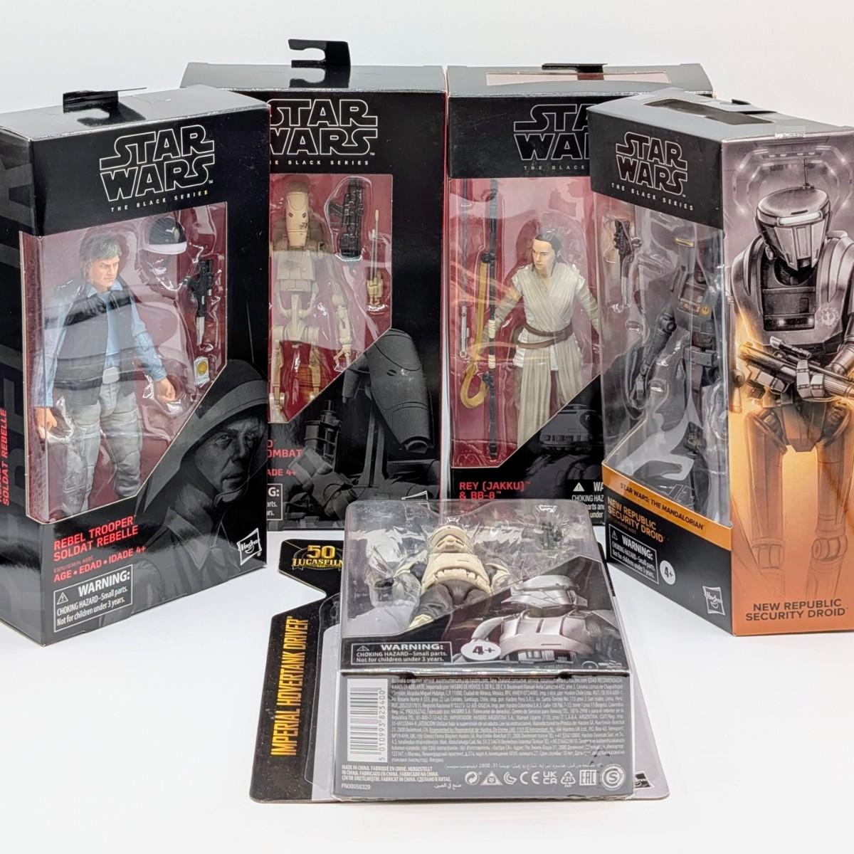 LOT 102: Hasbro Star Wars, The Black Series, NIB Imperial Hovertank Driver, Rebel Trooper, Battle Droid, Rey Jakku With BB-8, New Republic Security Droid & Imperial Hovertank Driver Action Figures.