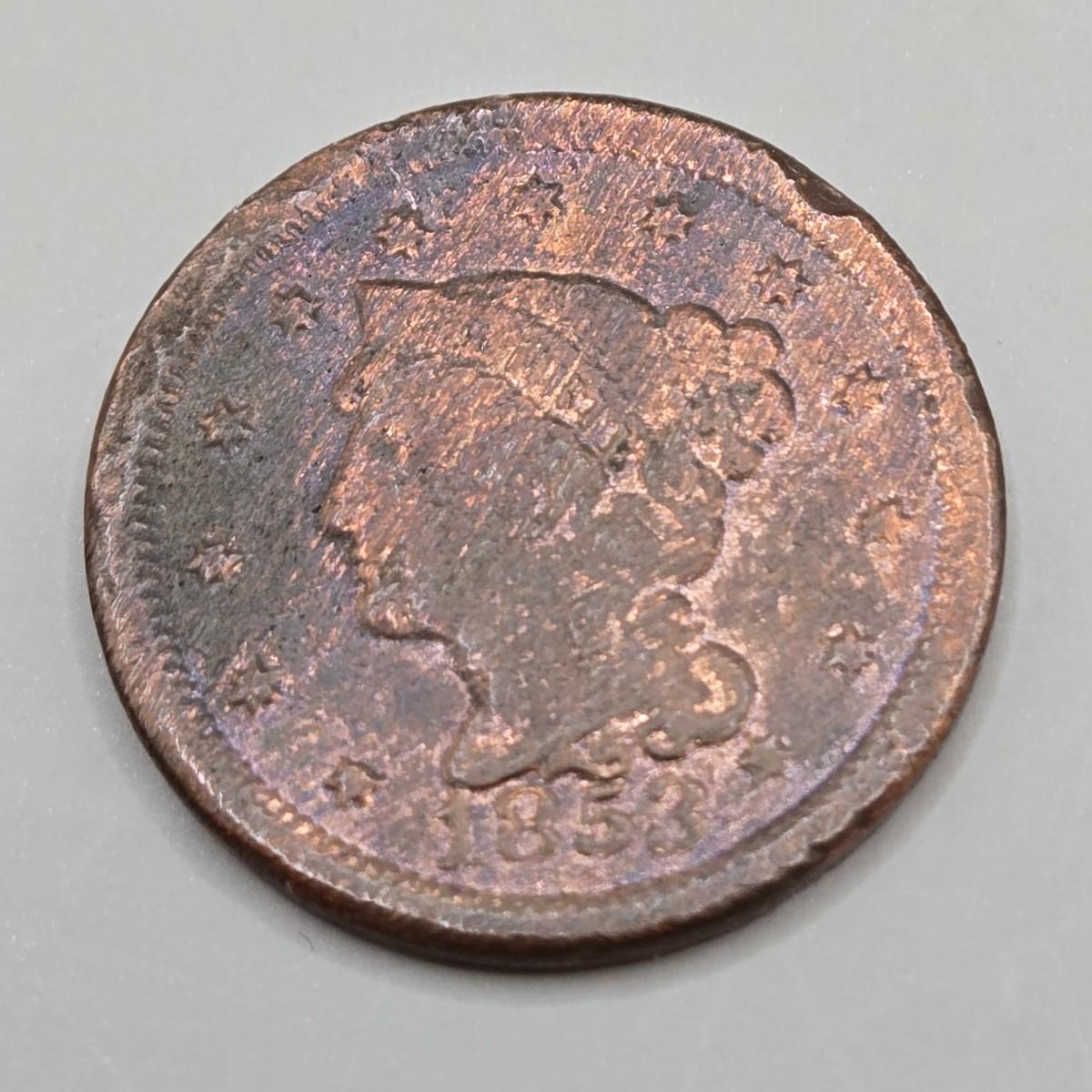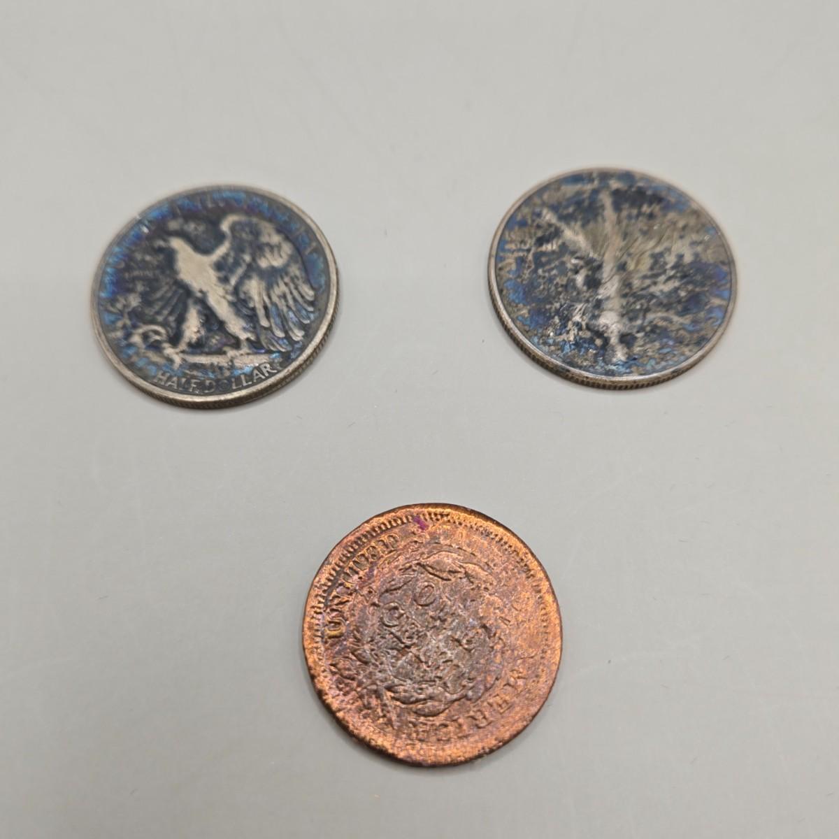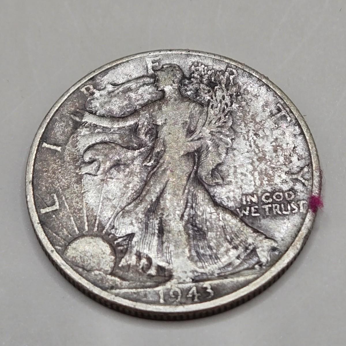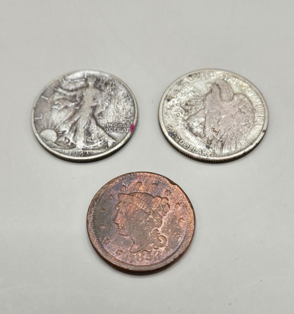 LOT 213J: Two 90% Silver Walking Liberty Half Dollars - 1941 and 1943 + 1853 Large Cent Coin
