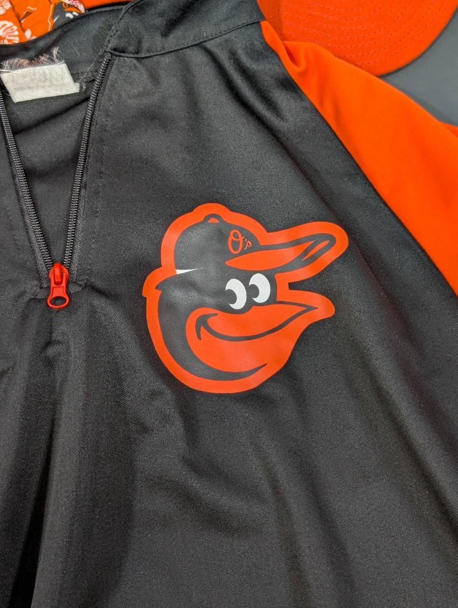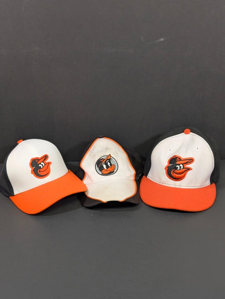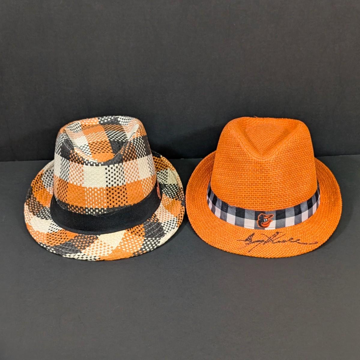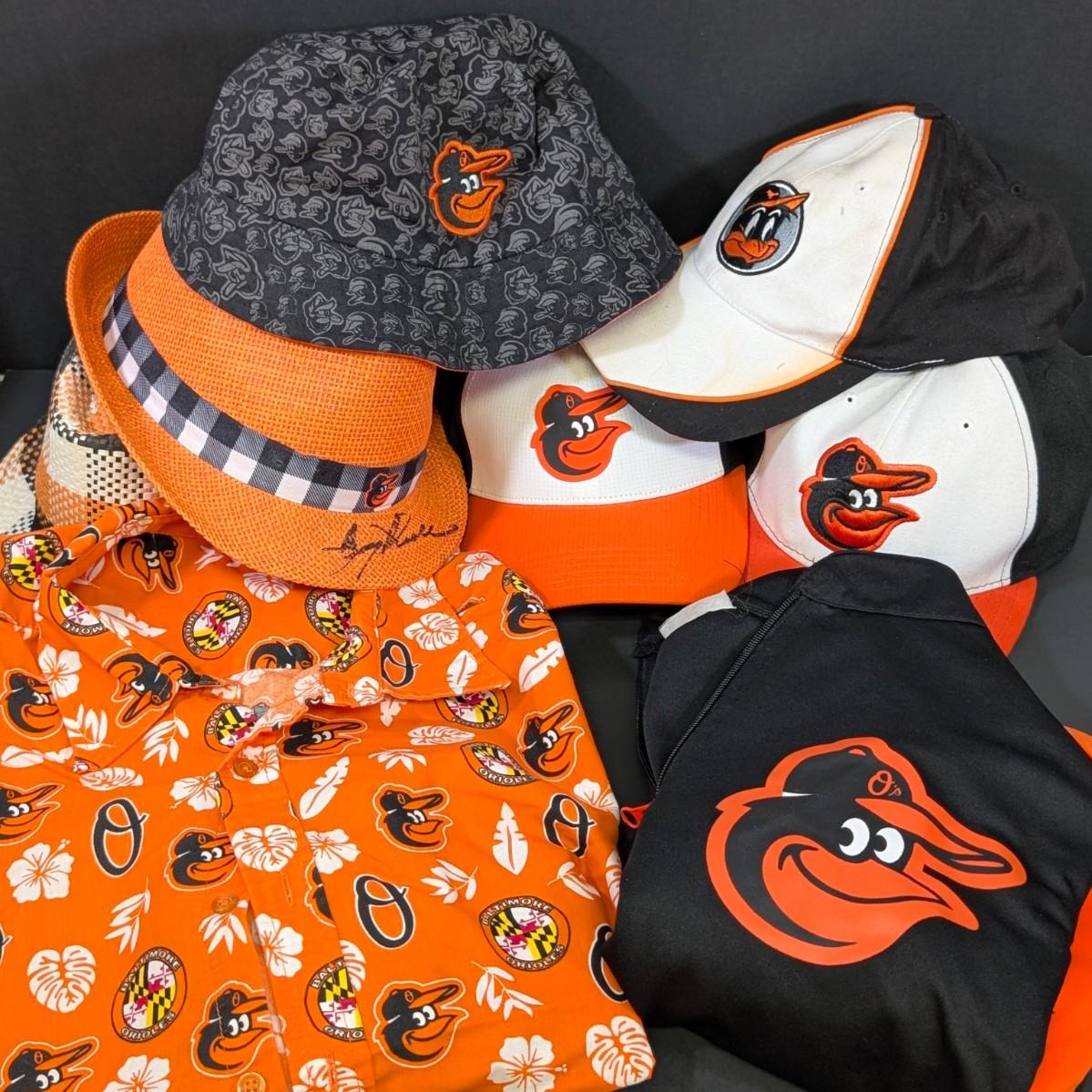LOT 228: Baltimore Oriole Gear, Button Down Shortsleeve Shirt, Pullover, Sweatshirt, 2 Straw Hats, One Signed & 3 Baseball Caps. No Visible Sizes, Button Down Appears Large And Pull Over Medium