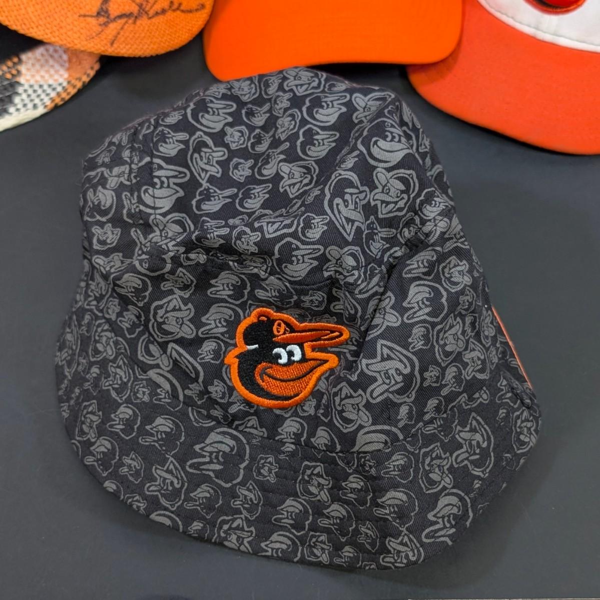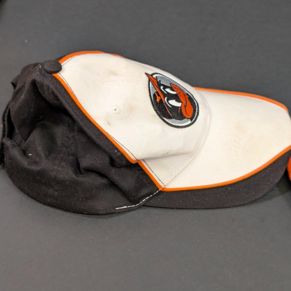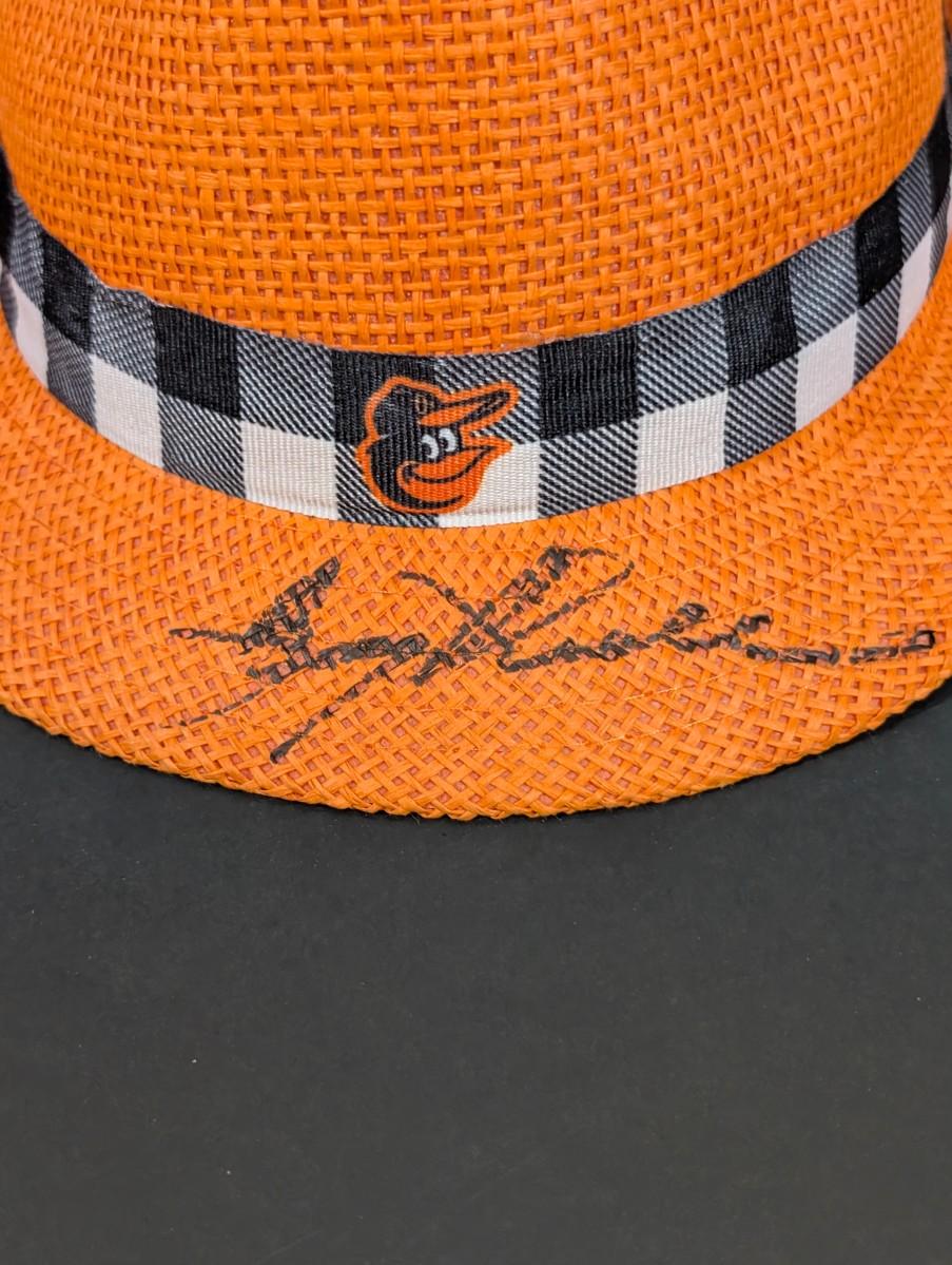 LOT 228: Baltimore Oriole Gear, Button Down Shortsleeve Shirt, Pullover, Sweatshirt, 2 Straw Hats, One Signed & 3 Baseball Caps. No Visible Sizes, Button Down Appears Large And Pull Over Medium