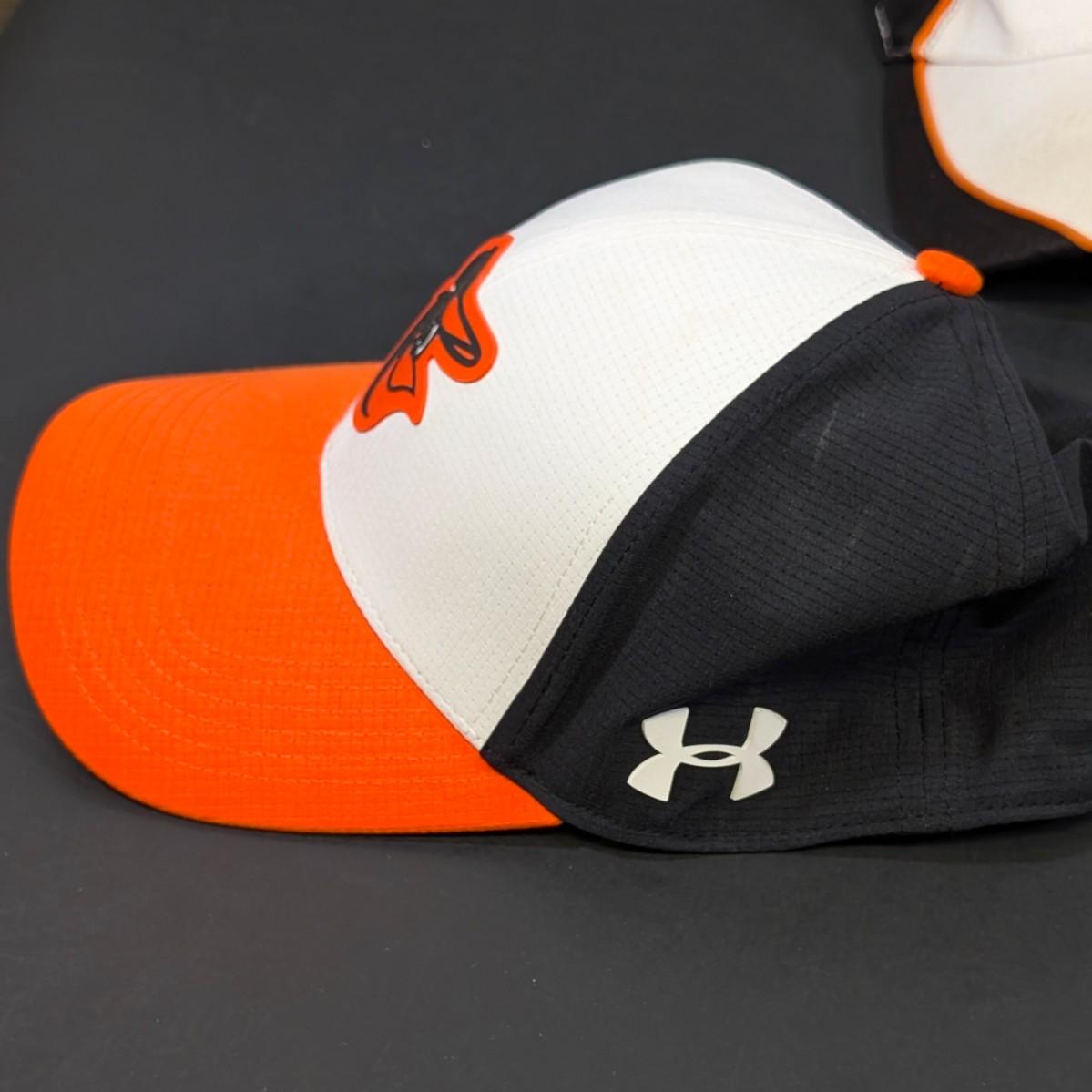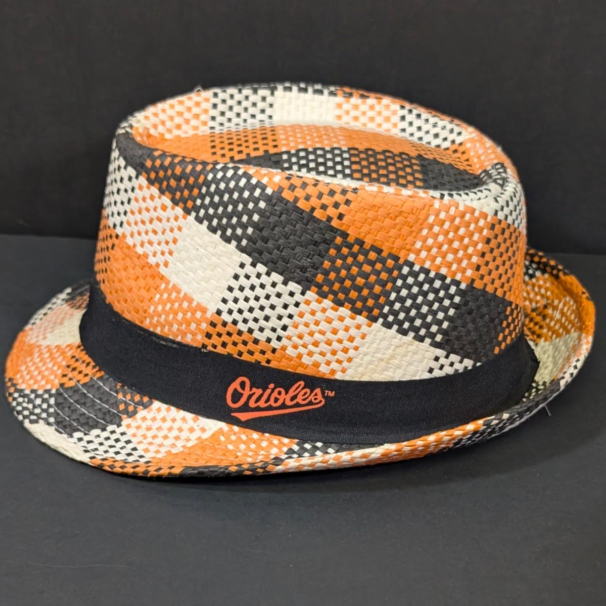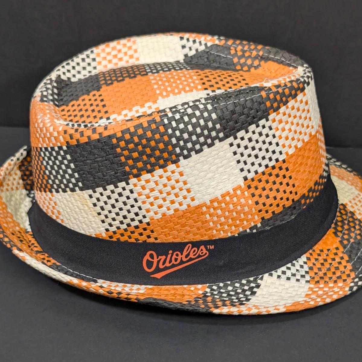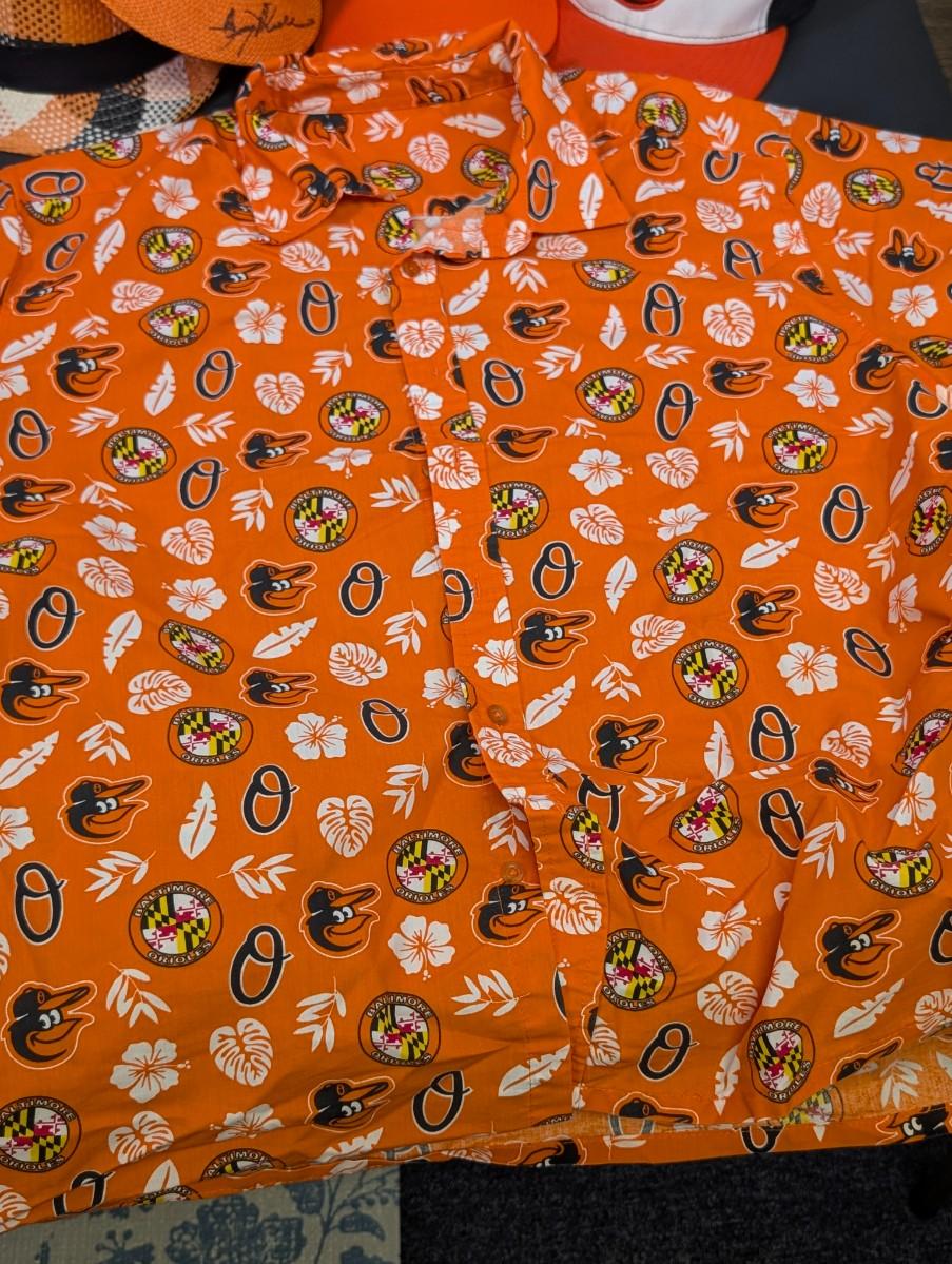 LOT 228: Baltimore Oriole Gear, Button Down Shortsleeve Shirt, Pullover, Sweatshirt, 2 Straw Hats, One Signed & 3 Baseball Caps. No Visible Sizes, Button Down Appears Large And Pull Over Medium