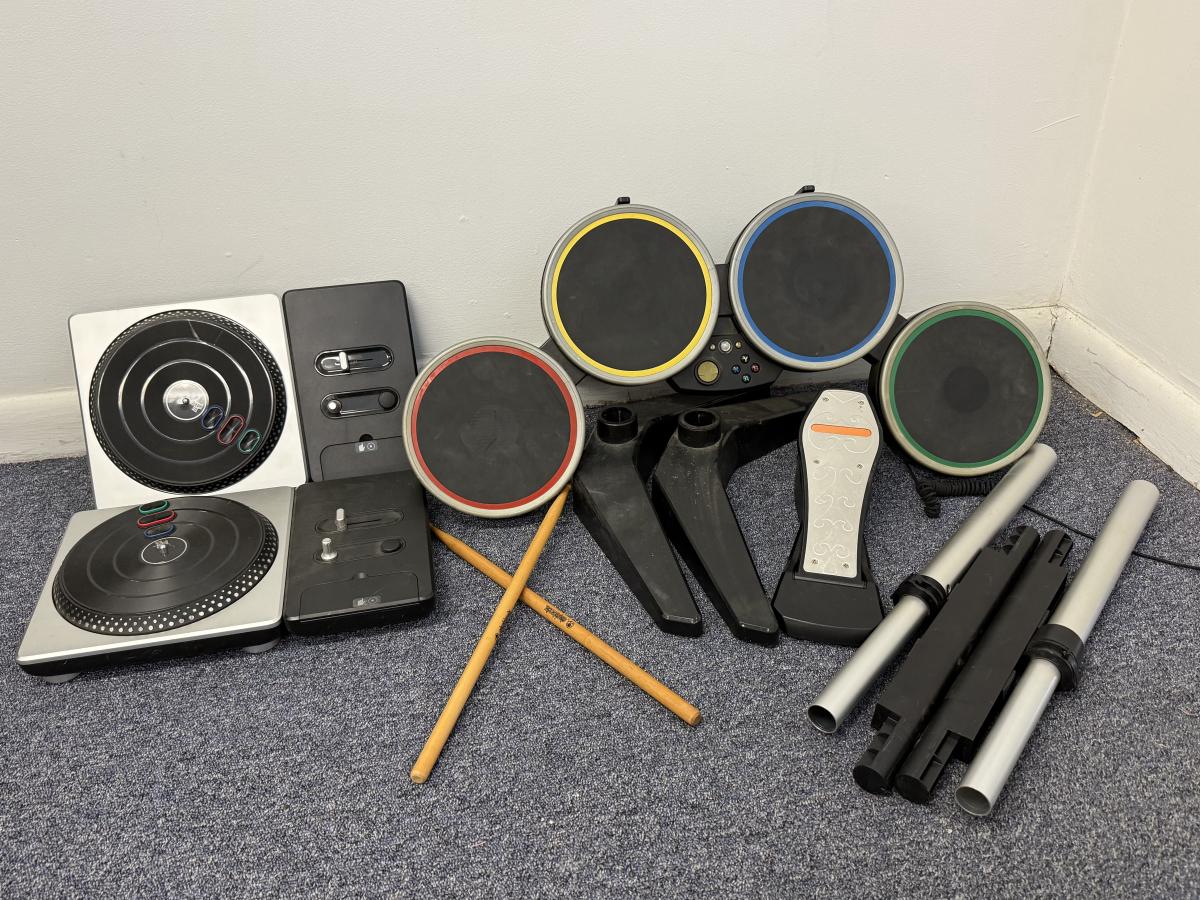 LOT 230: DJ Hero Turntables, XBOX Rockband Drum Kit & Variety of Video Games