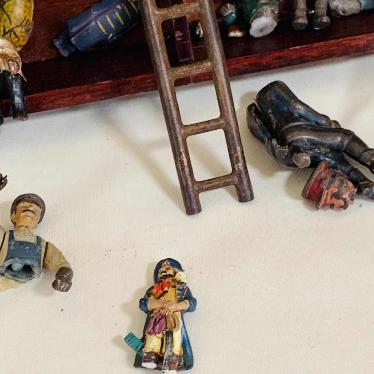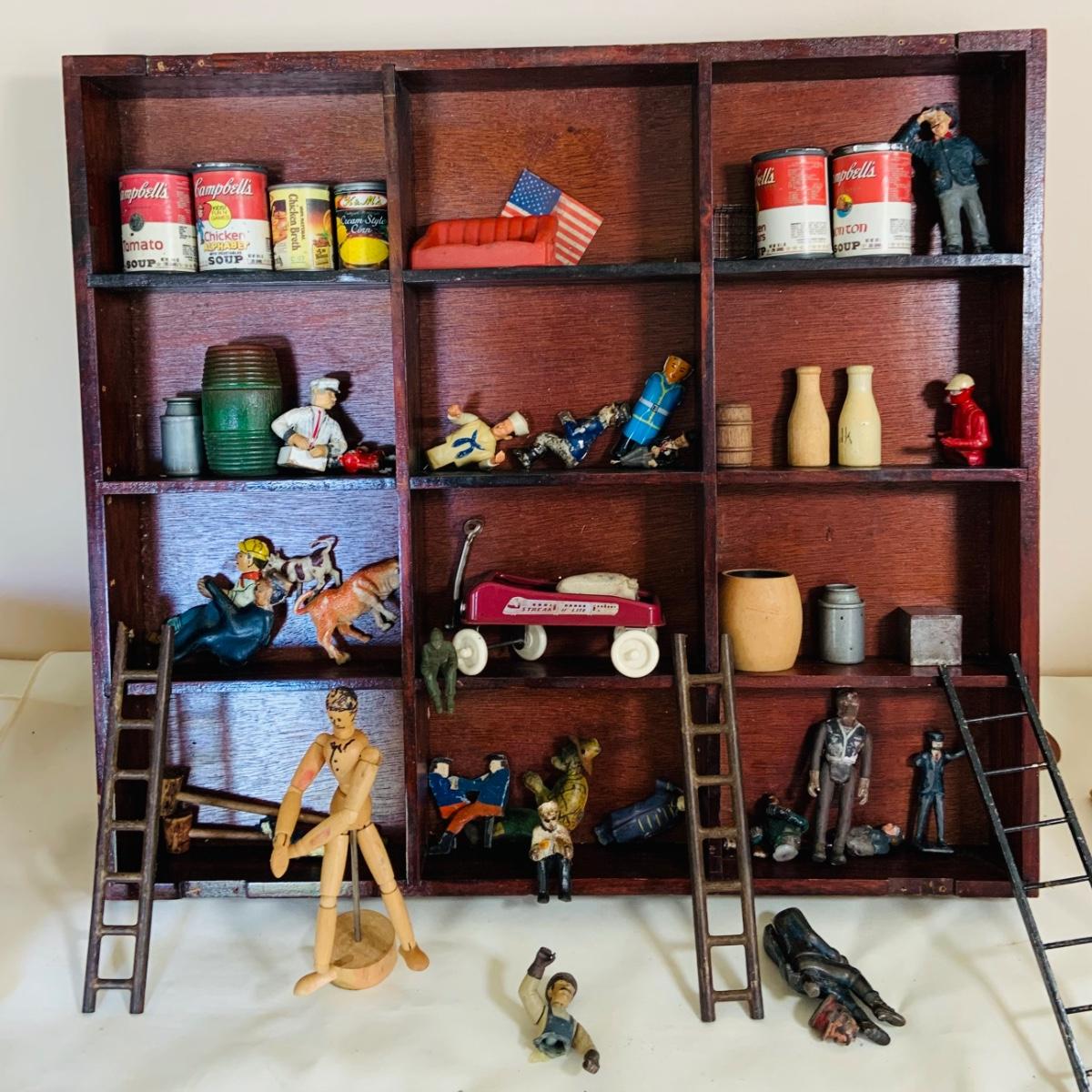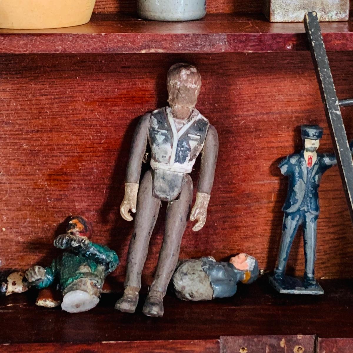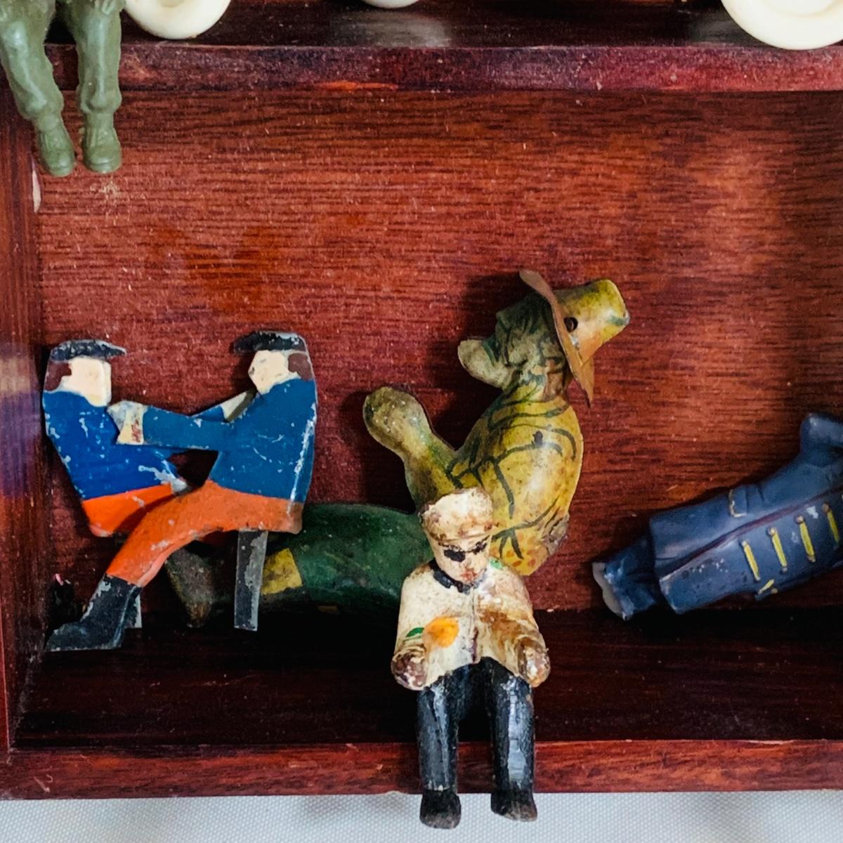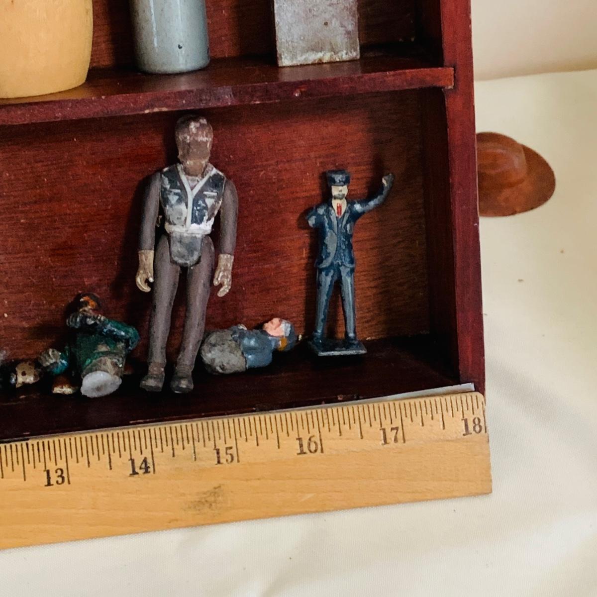 LOT 219: Vintage Display Shelf with Vintage Toy Bits, Pieces and Parts