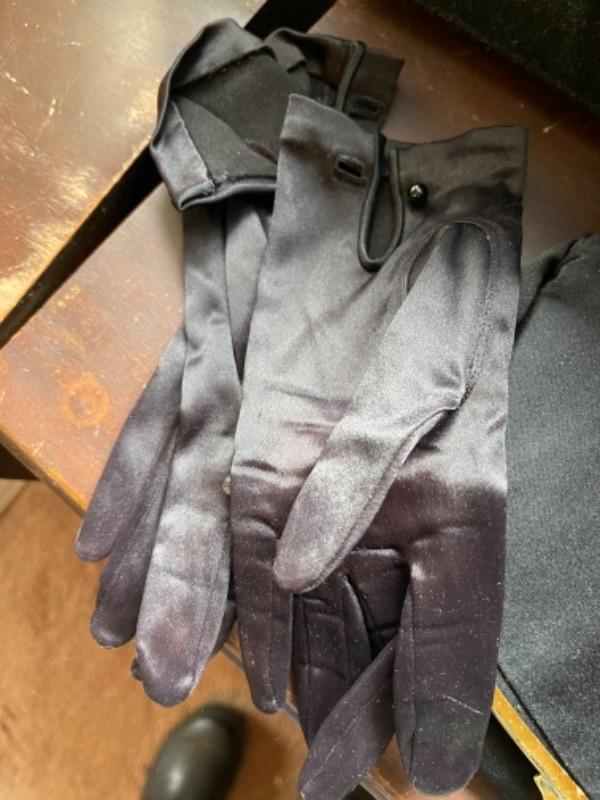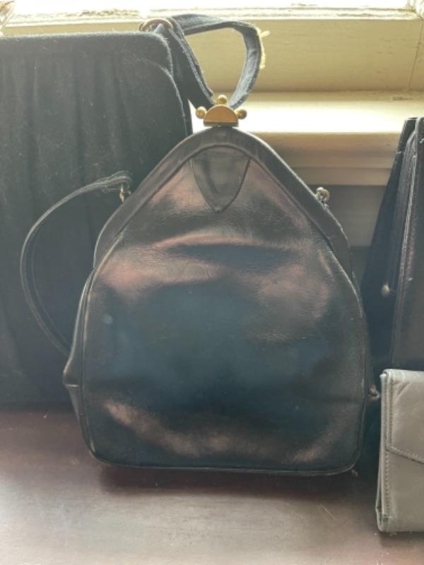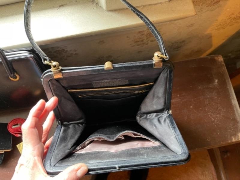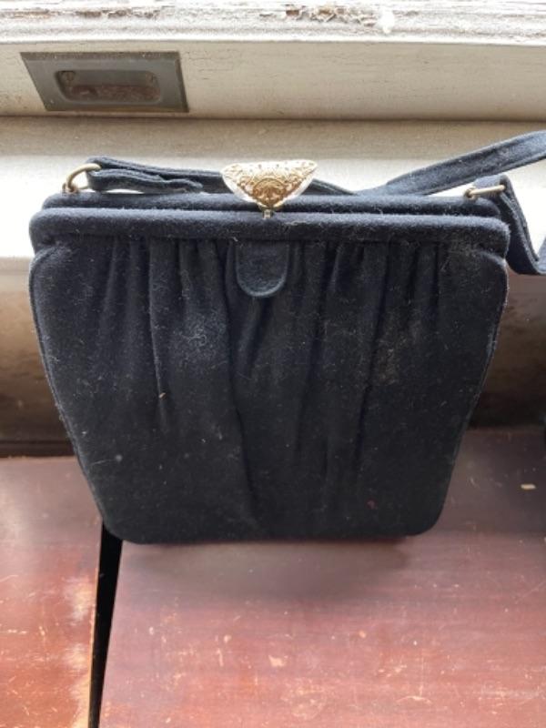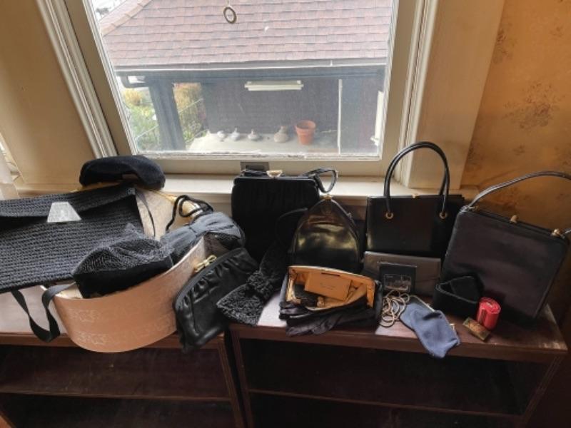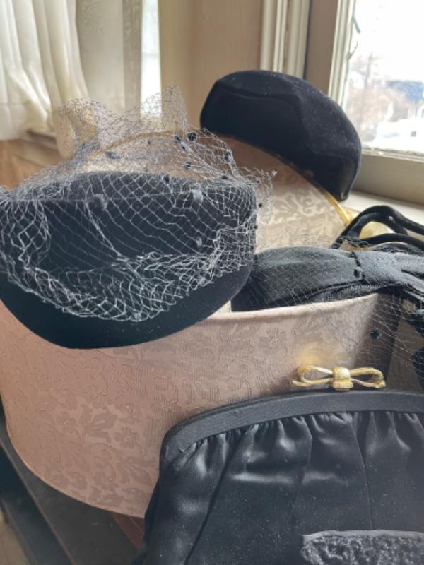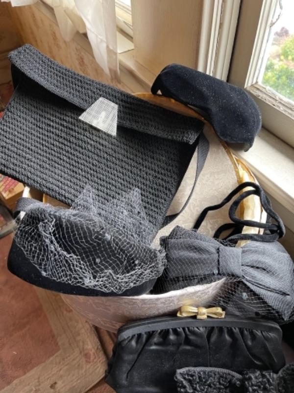 Lot 112B1. Vintage hatbox, leather purses, velvet hats, I Magnin evening clutch with mirror, compact and gloves--Was $125 - -NOW $85
