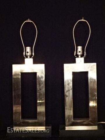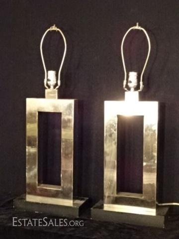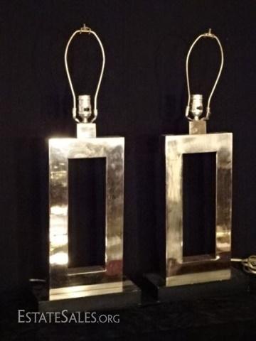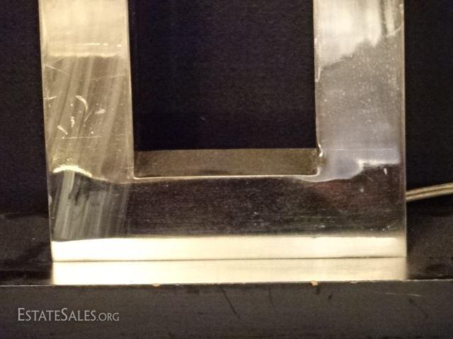 LOT 112C: PAIR MODERN CHROME TABLE LAMPS, RECTAGULAR OPEN BASES, GOOD CONDITION WITH SOME OXIDATION TO FINISH, 39"H, SKU387.23
