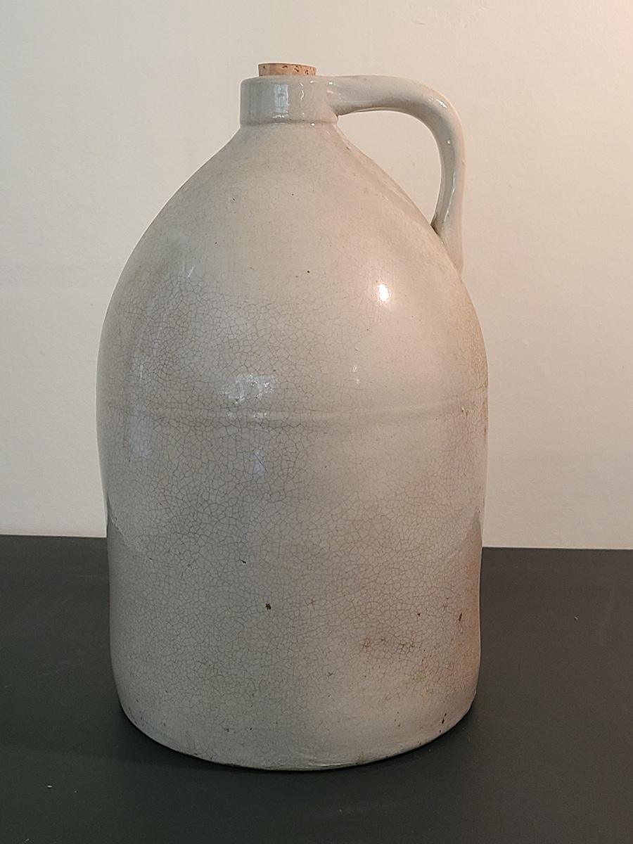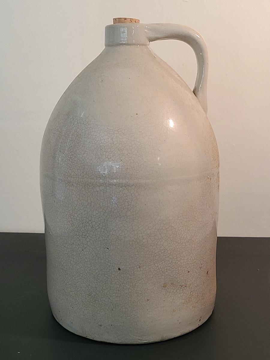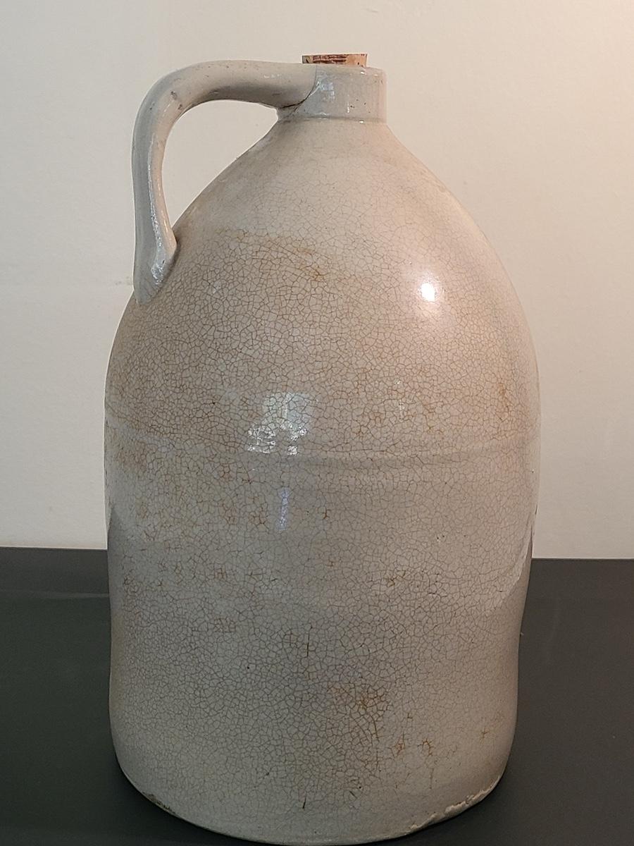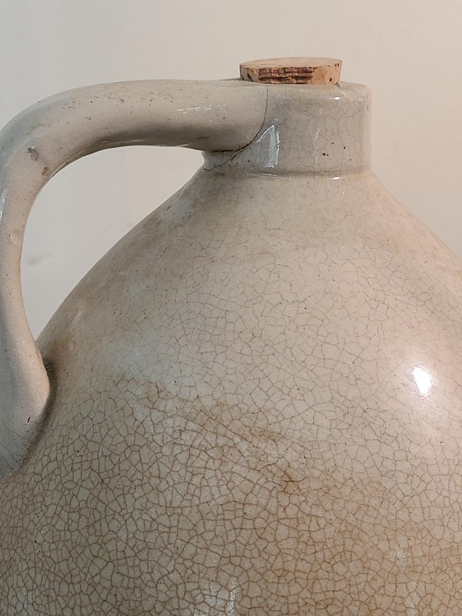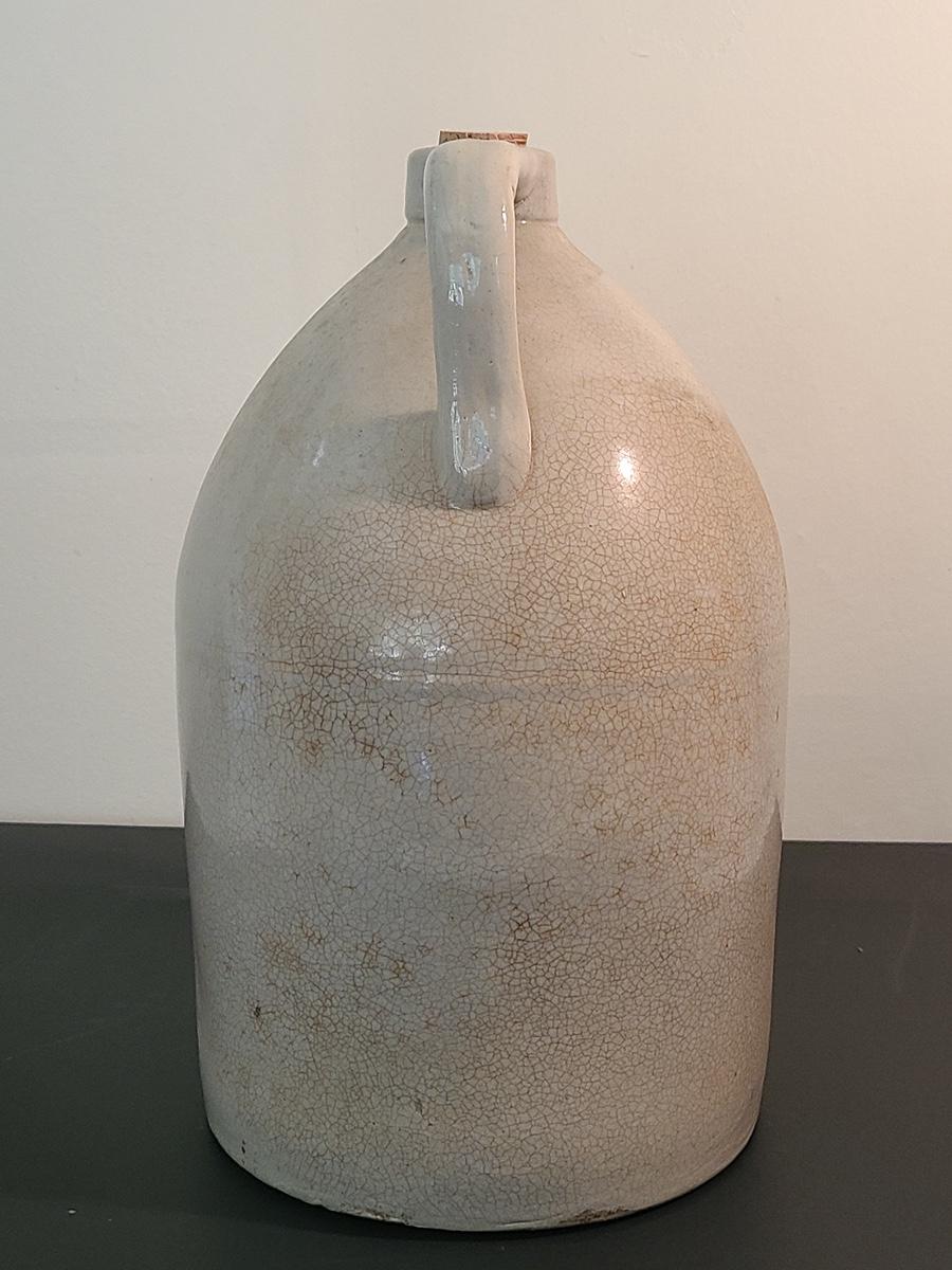 Not sure of the age or maker of this gorgeous 2 gallon jug. Perfect decor for any room. Does have faint firing line at the handle that does not go all the way through as pictures show, nick in lip, and crazing throughout, which adds to the character of this beauty. Pictures are the best representation of the item in the lot, the condition of the items in the lot, and the size if measurements were taken. All items are sold as-is, since they are pre-owned and antiques.