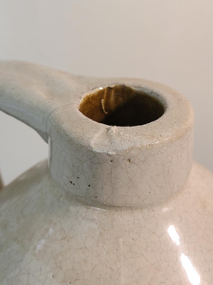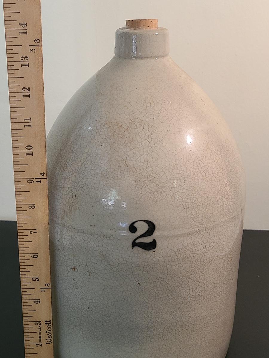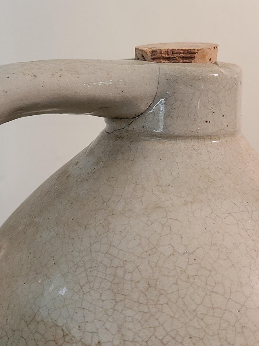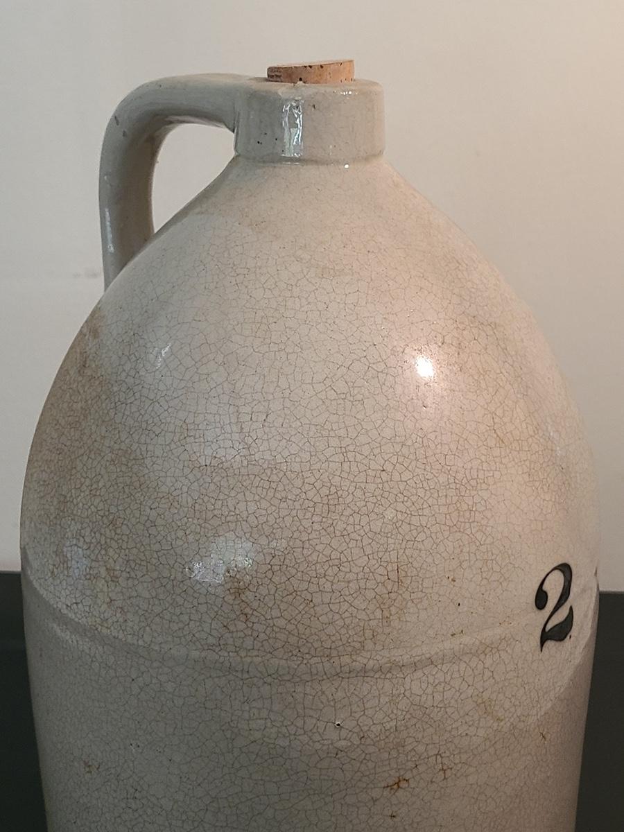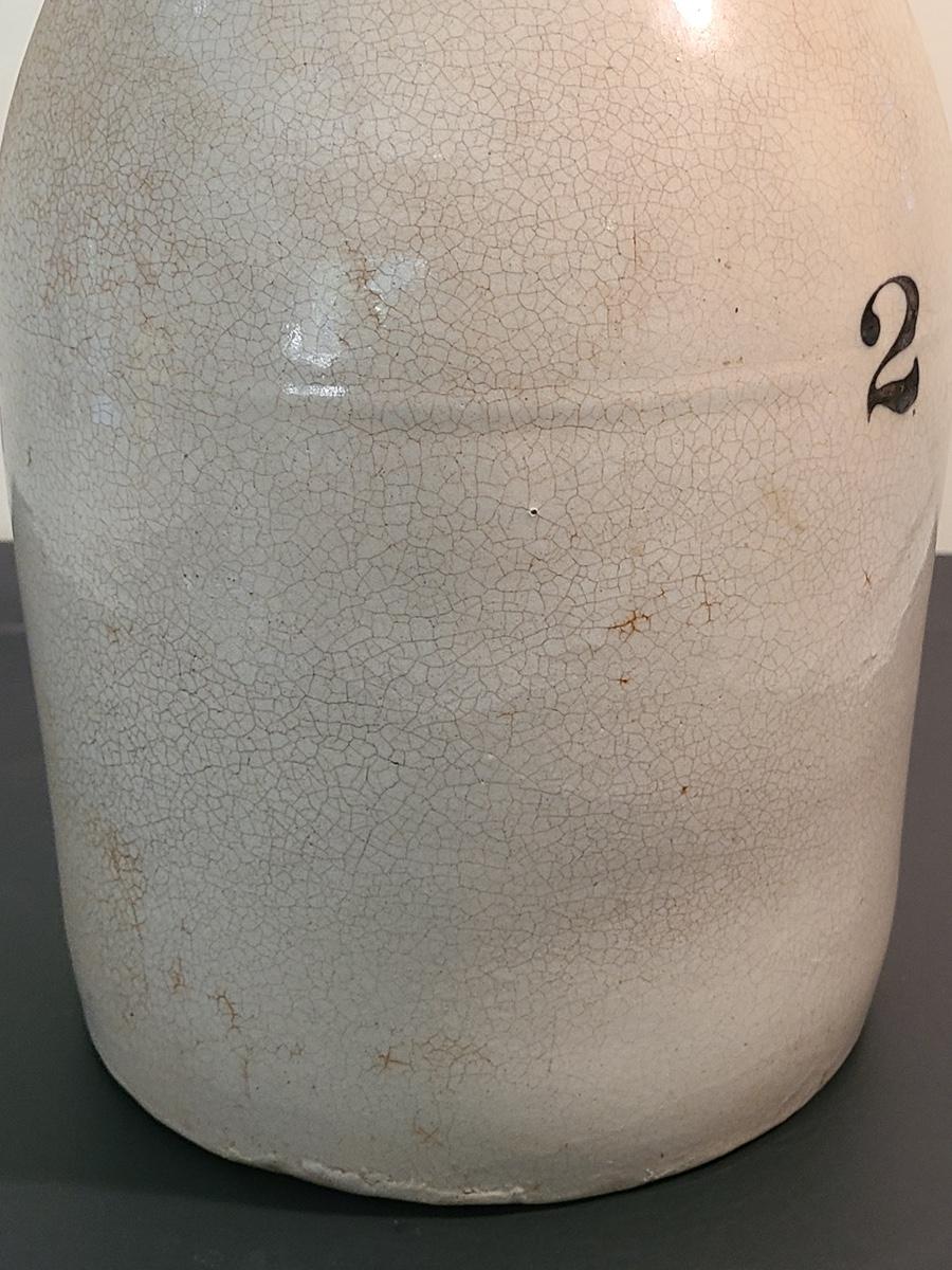 Not sure of the age or maker of this gorgeous 2 gallon jug. Perfect decor for any room. Does have faint firing line at the handle that does not go all the way through as pictures show, nick in lip, and crazing throughout, which adds to the character of this beauty. Pictures are the best representation of the item in the lot, the condition of the items in the lot, and the size if measurements were taken. All items are sold as-is, since they are pre-owned and antiques.