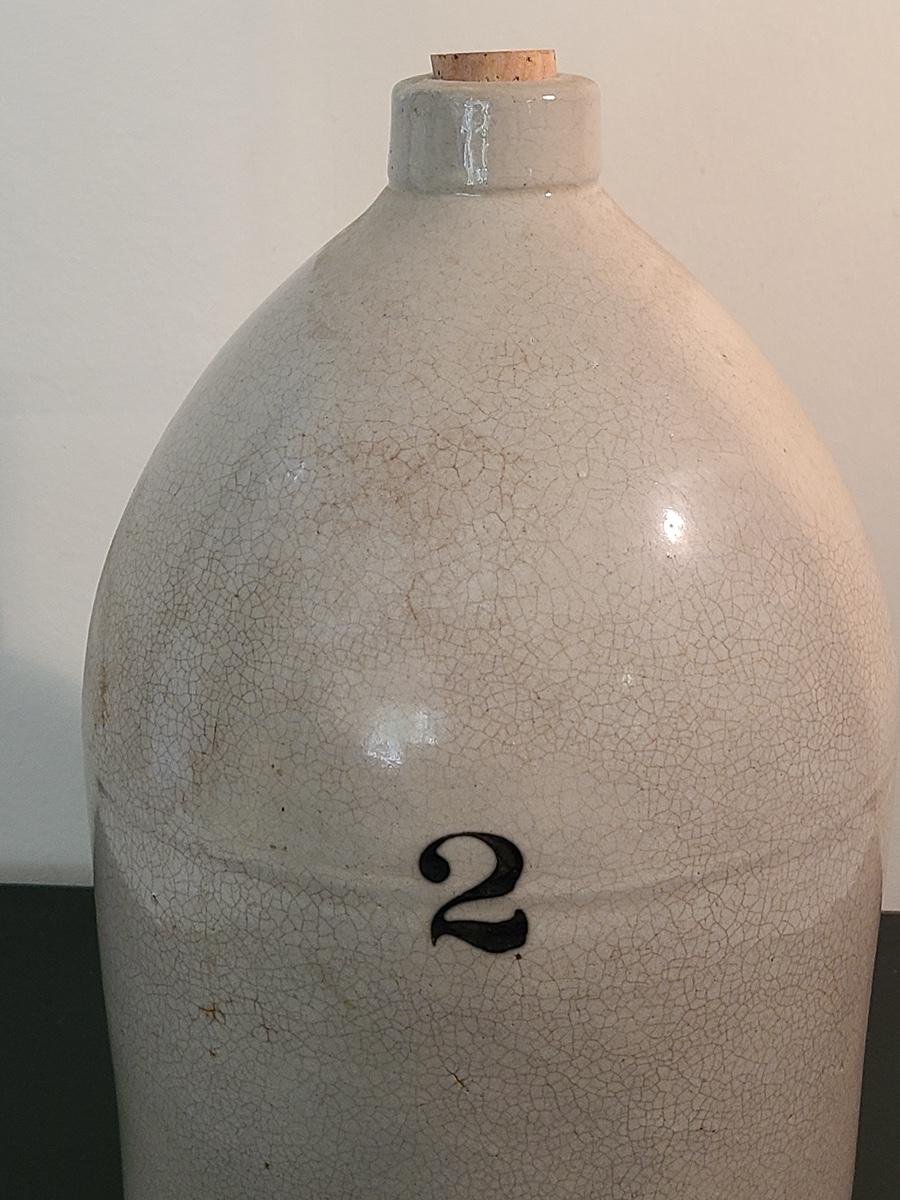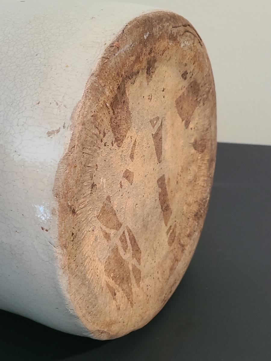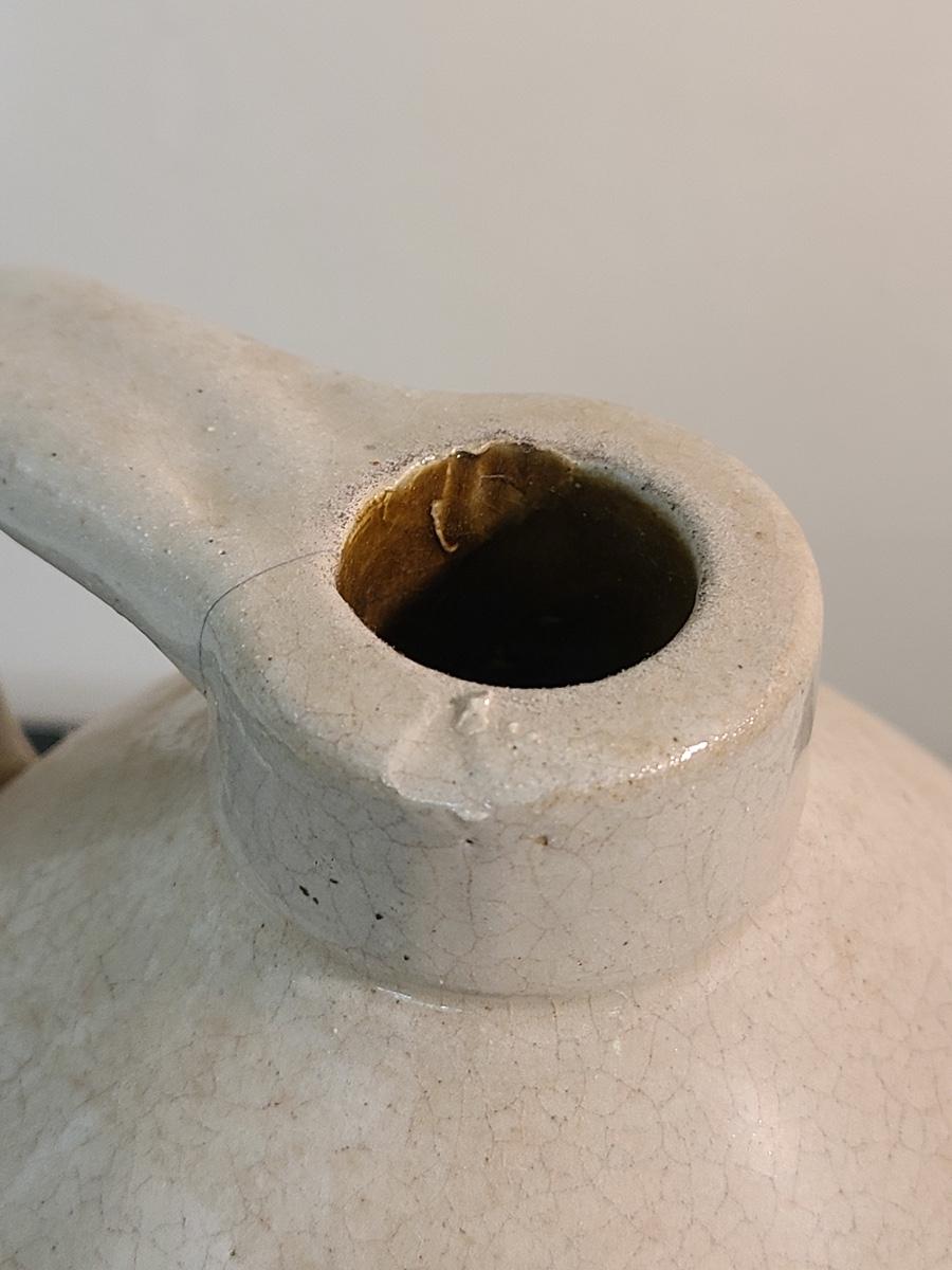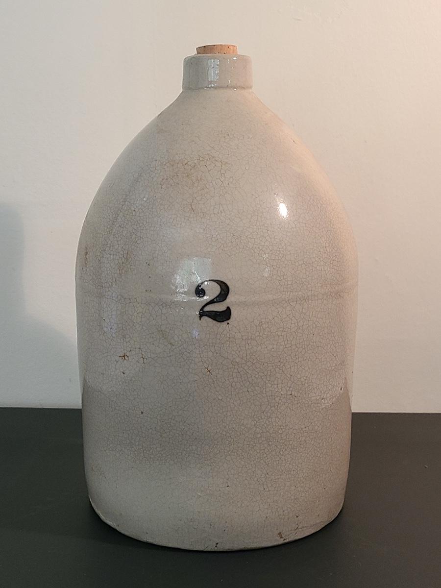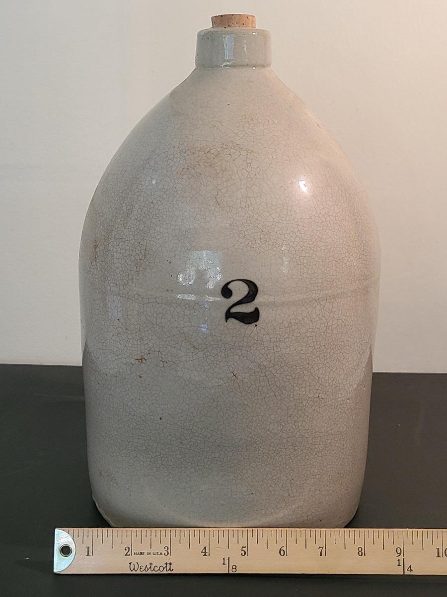 Not sure of the age or maker of this gorgeous 2 gallon jug. Perfect decor for any room. Does have faint firing line at the handle that does not go all the way through as pictures show, nick in lip, and crazing throughout, which adds to the character of this beauty. Pictures are the best representation of the item in the lot, the condition of the items in the lot, and the size if measurements were taken. All items are sold as-is, since they are pre-owned and antiques.