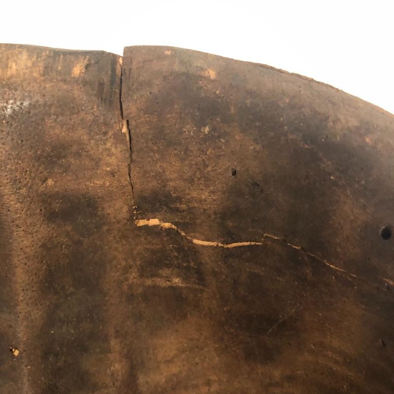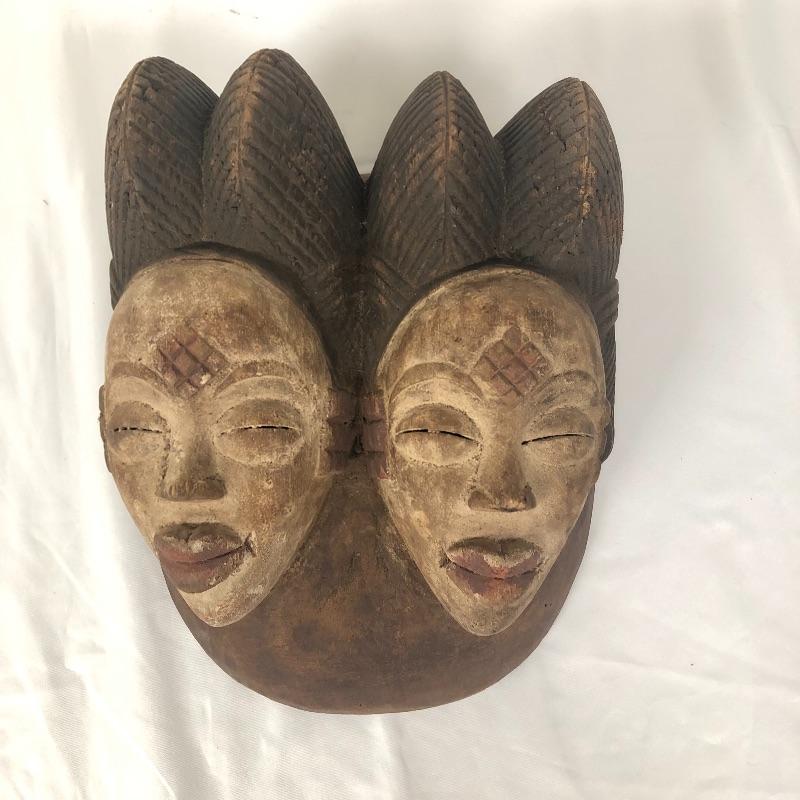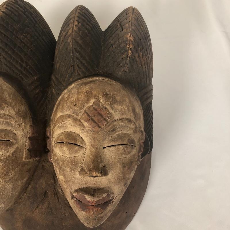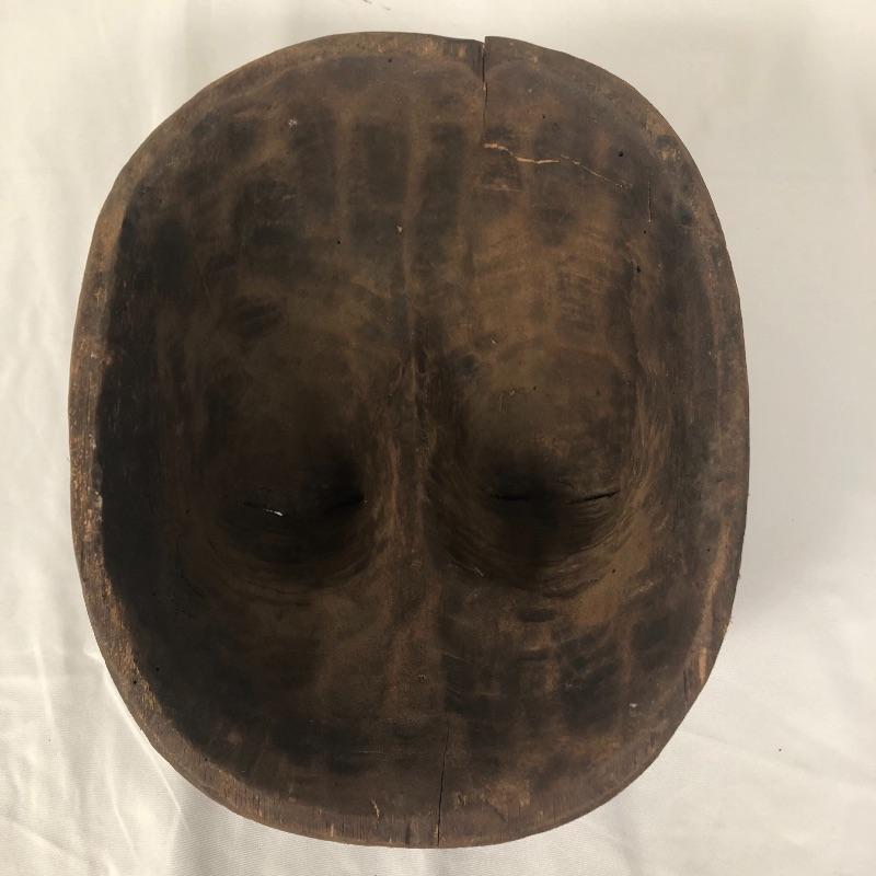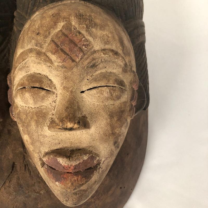 This beautiful mask is carved out of wood, with a smooth finish. It is stained or painted, and is slightly faded. It has a small crack in the back but otherwise no cracks or chips. It measures about 9.5” x 11” x 5.”
