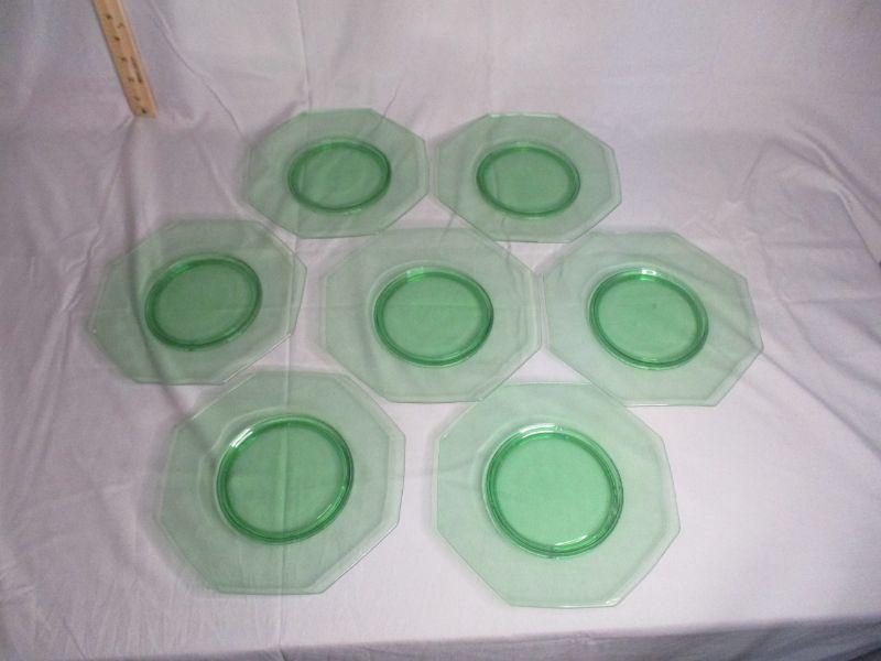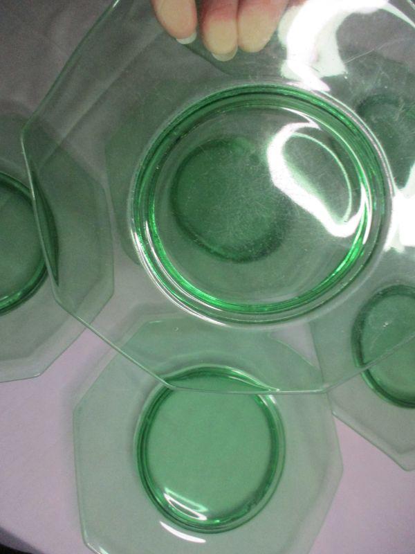 These plates are just green glass - they don't glow from uranium. Each plate is about 8" across and has significant surface scratches from the use of knives. The base of most of the plates also has chips.