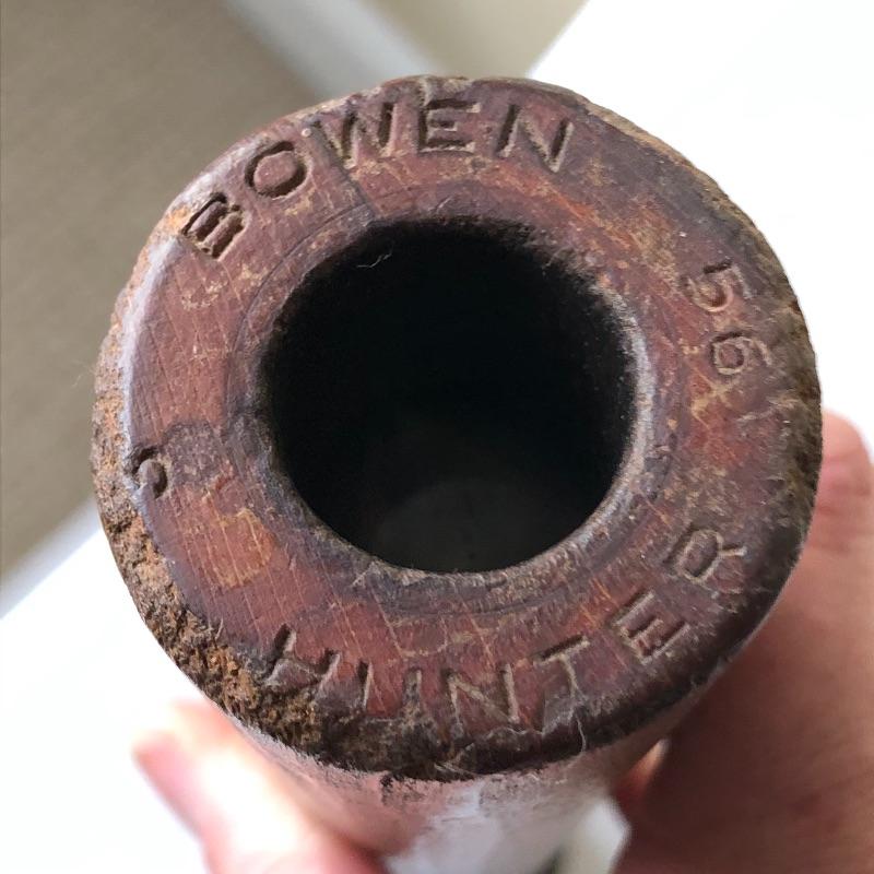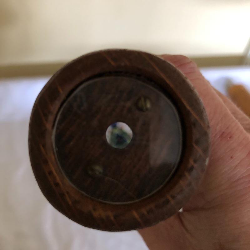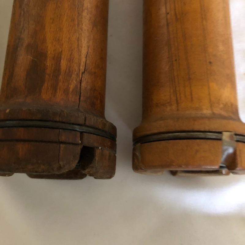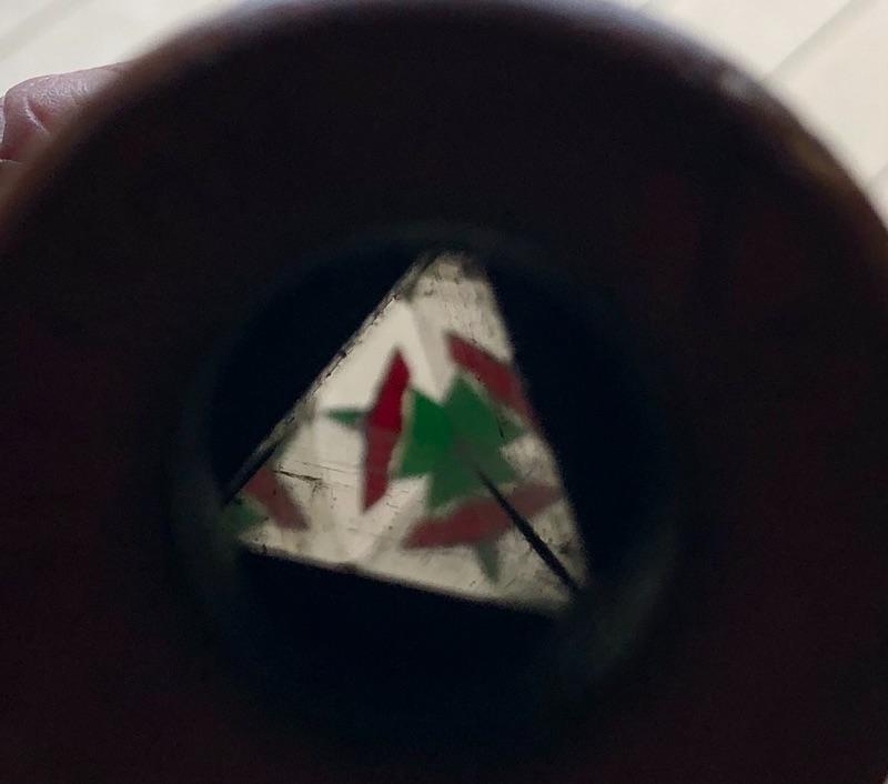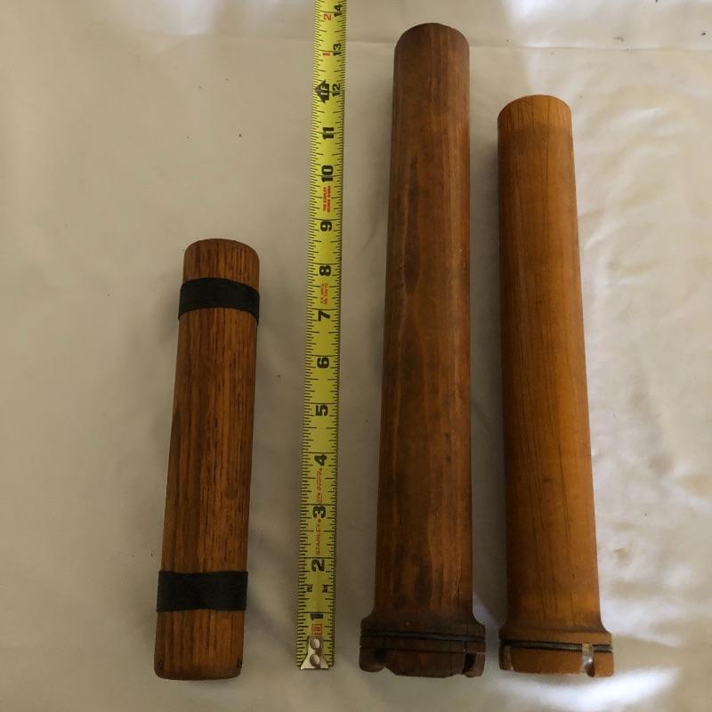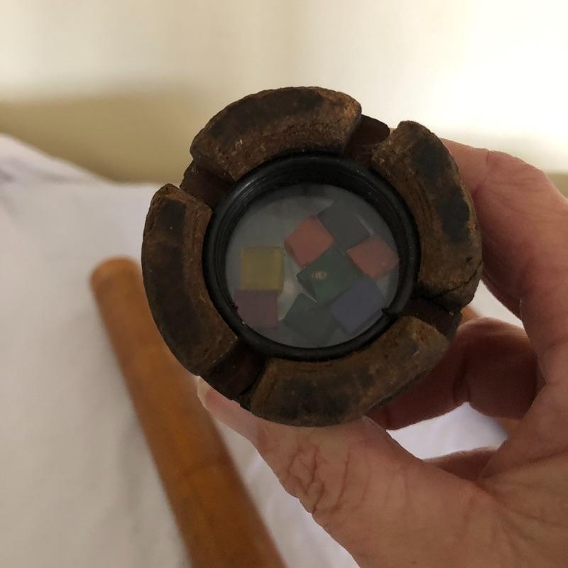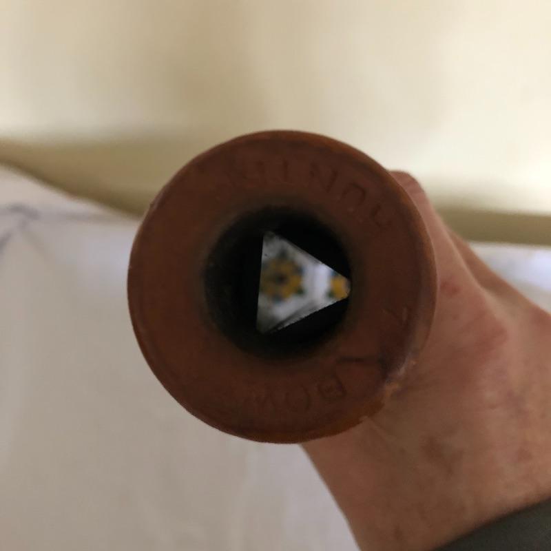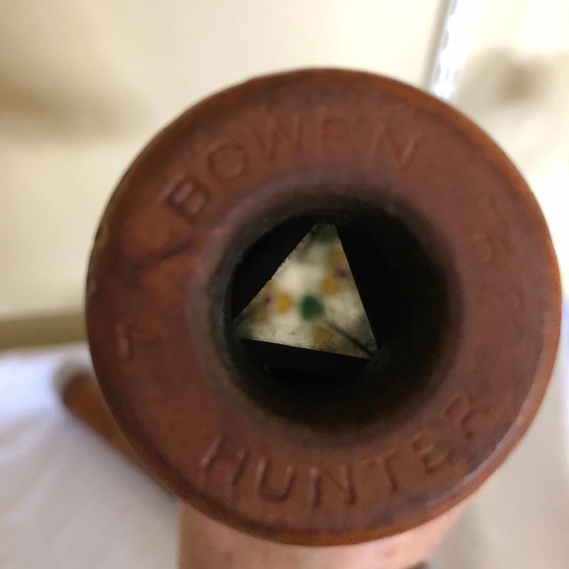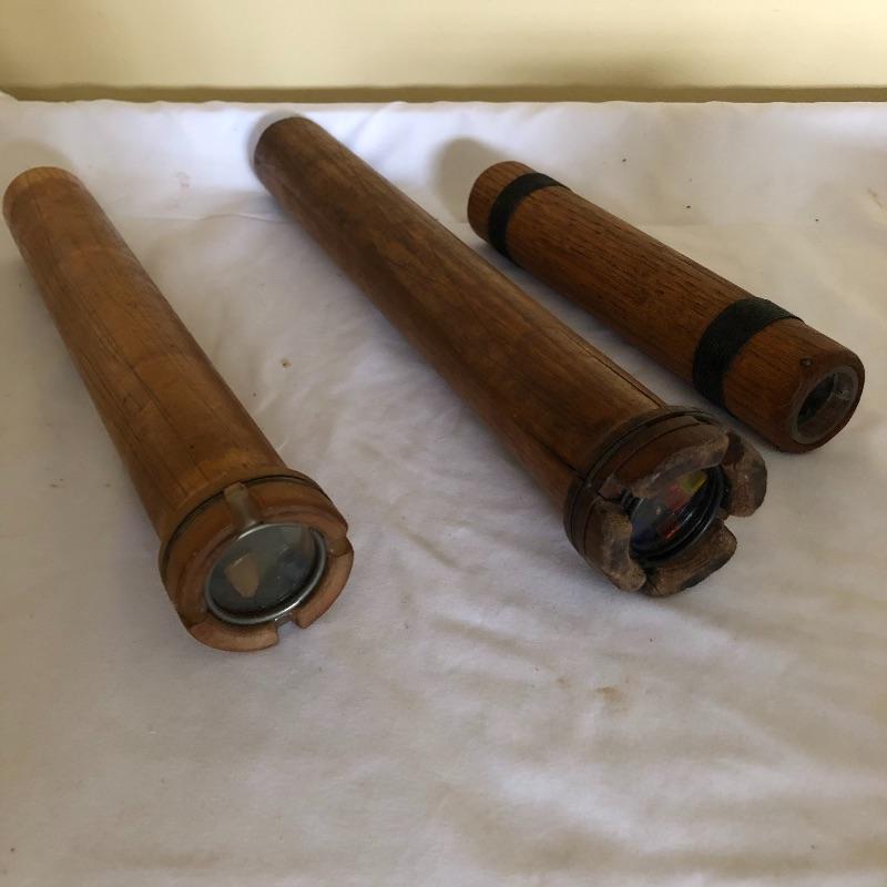 Two of these three antique kaleidoscopes are vintage textile wooden bobbin kaleidoscopes and are marked Bowen Hunter with the numbers 55 and 52 respectively. The third kaleidoscope is shorter and with no marking.