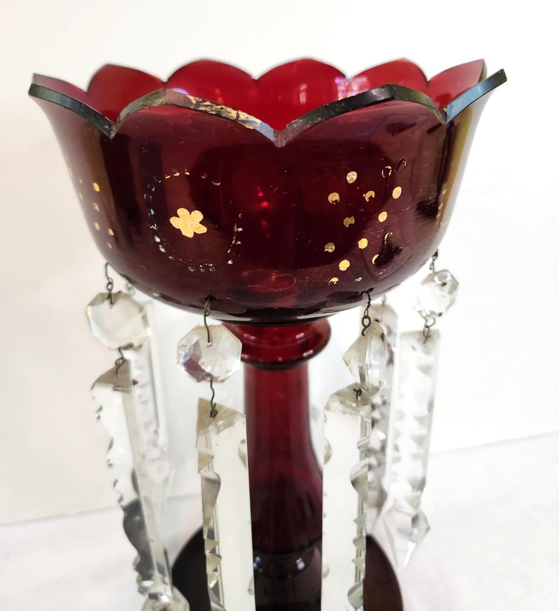 Ruby Red antique Mantle Lustre - 13" tall, 8 long crystals - 7" across - some wear to gold detailing on glass. Antique condition. Pretty.