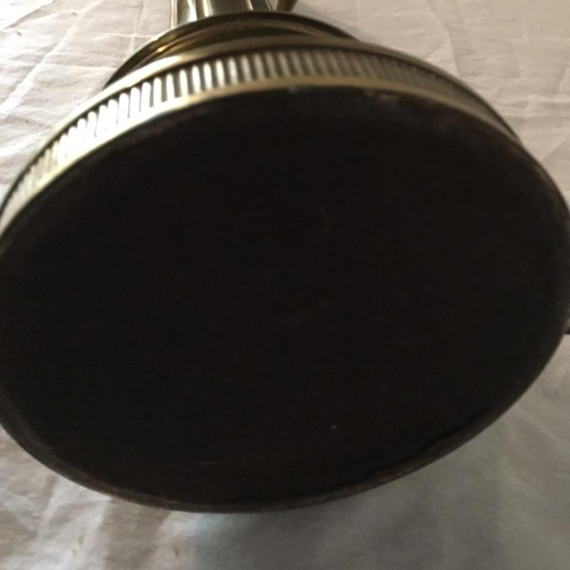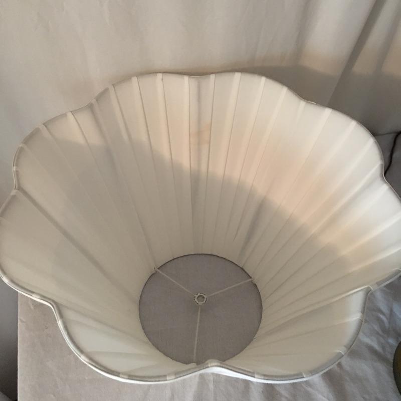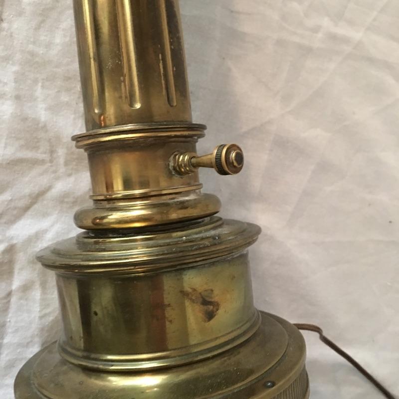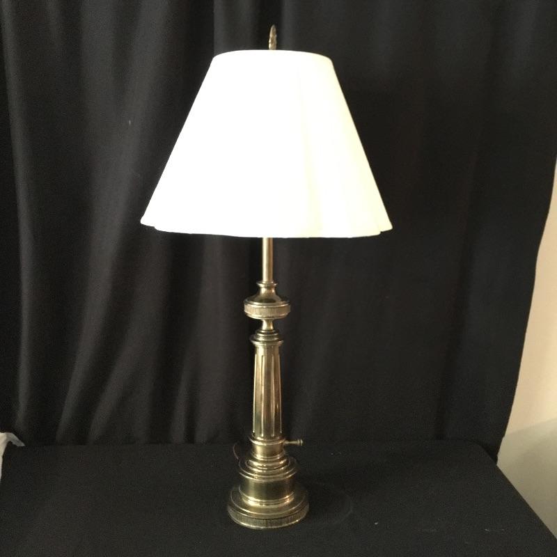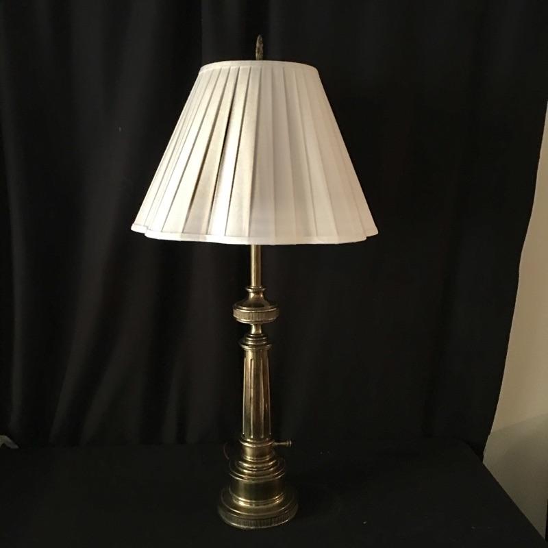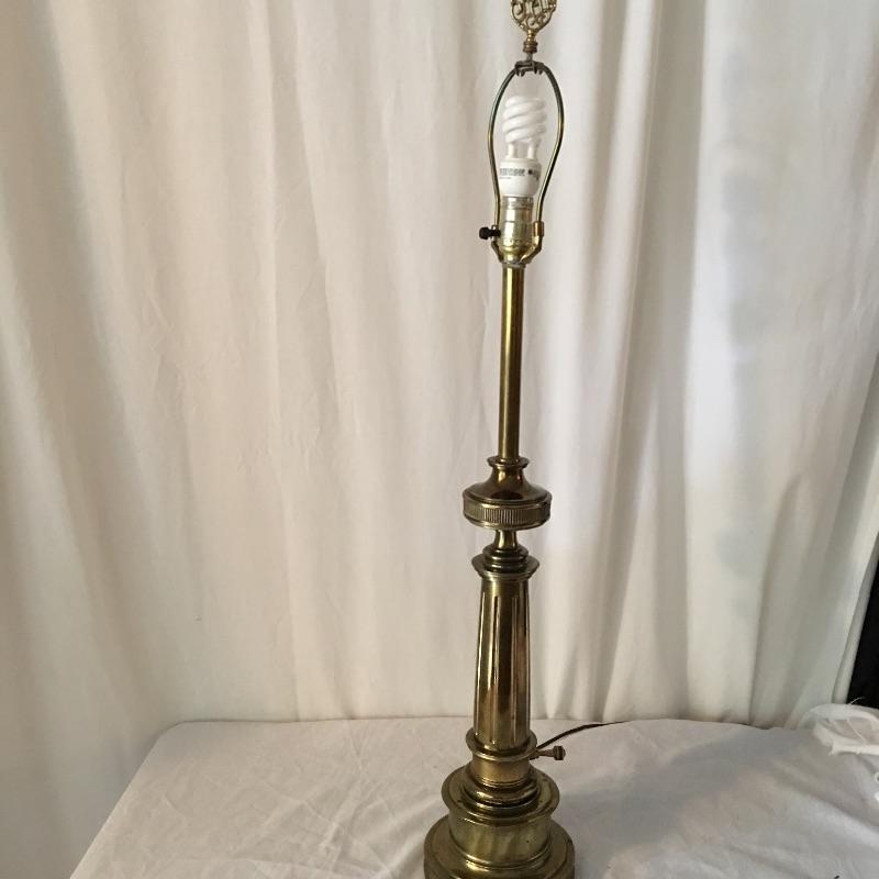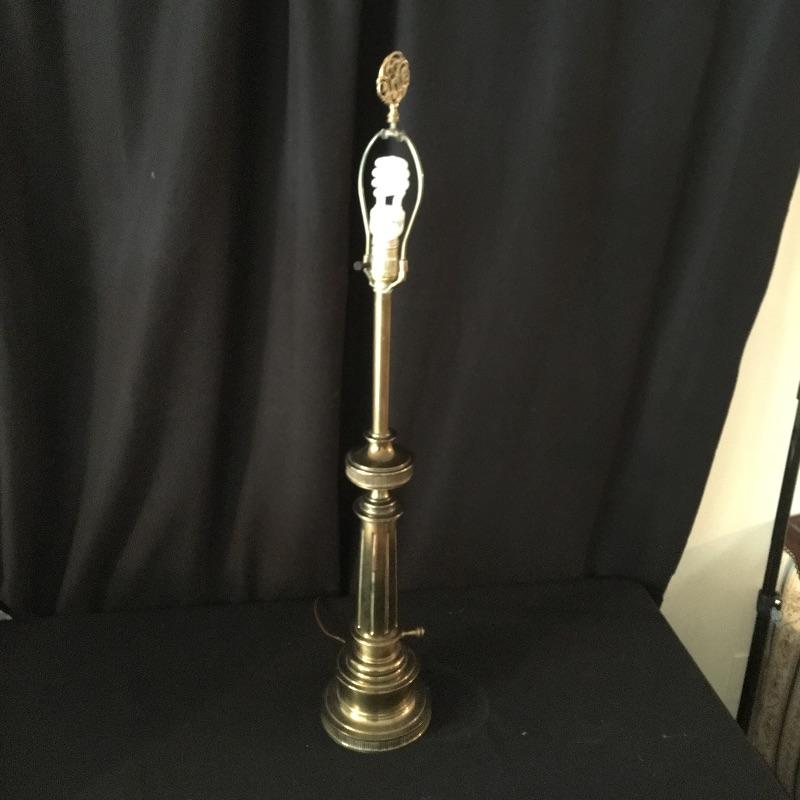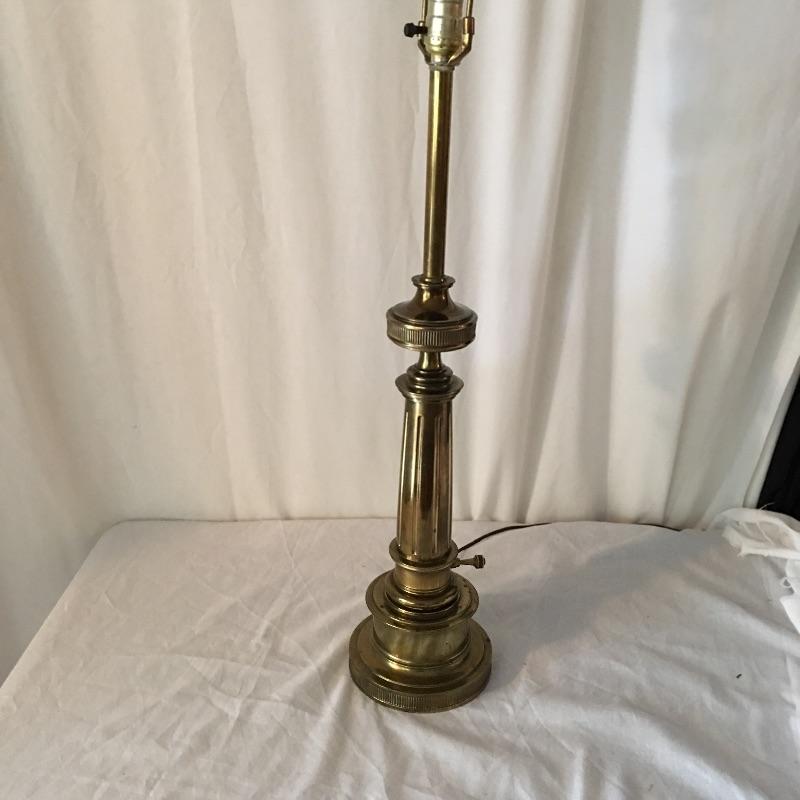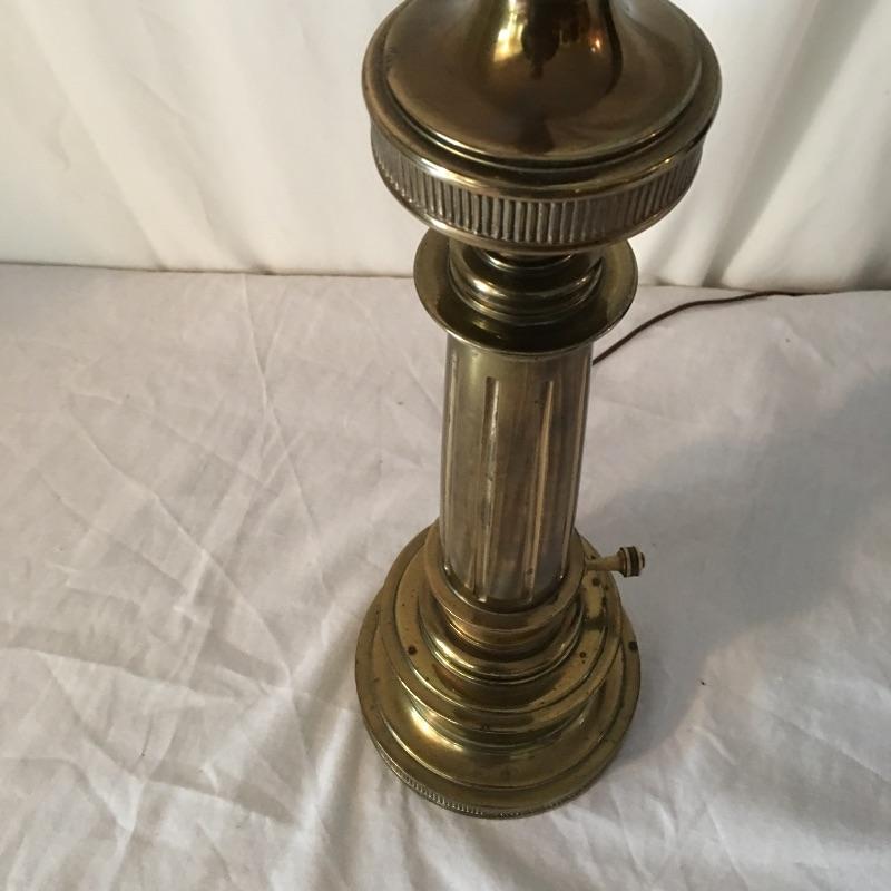 Hadnsome tall Brass table lamp comes with a cream colored shade. Lamp was tested and works. Lamp measures 38” tall with a 7”D base.