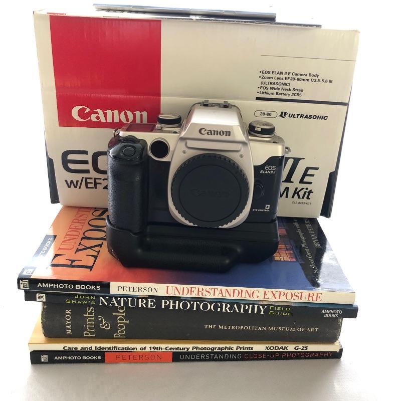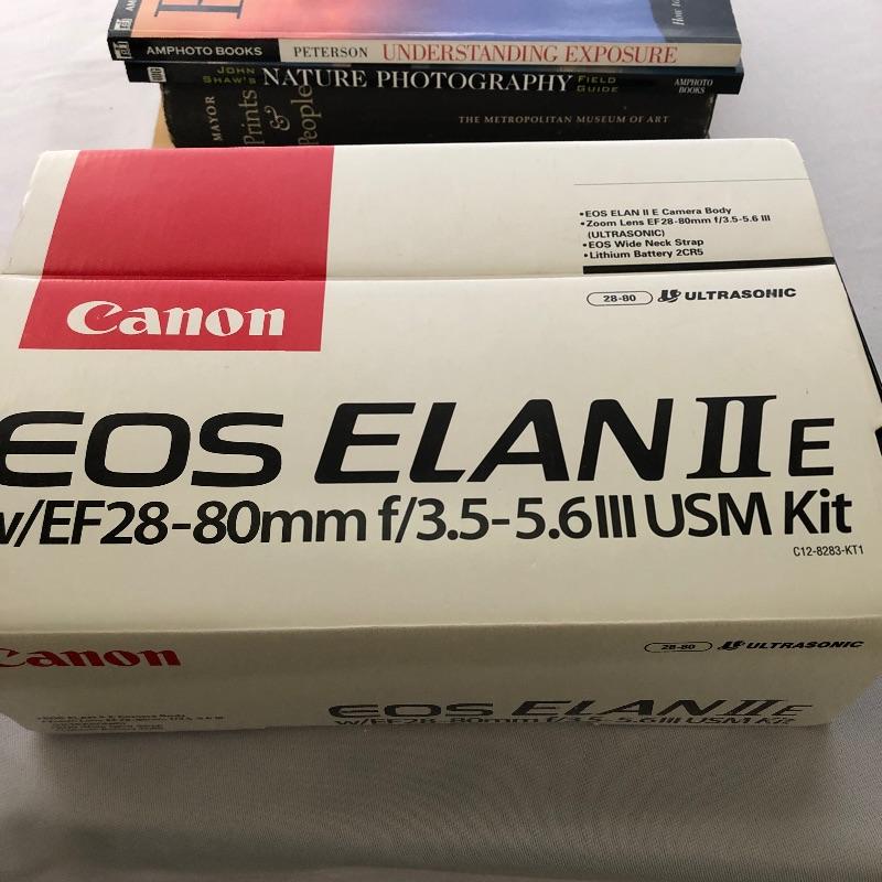 Collector of old film camera? This Canon Elan II E film camera comes with box, manual and some interesting photography books. Unable to test but unit appears to be in good working condition. Shipping available.