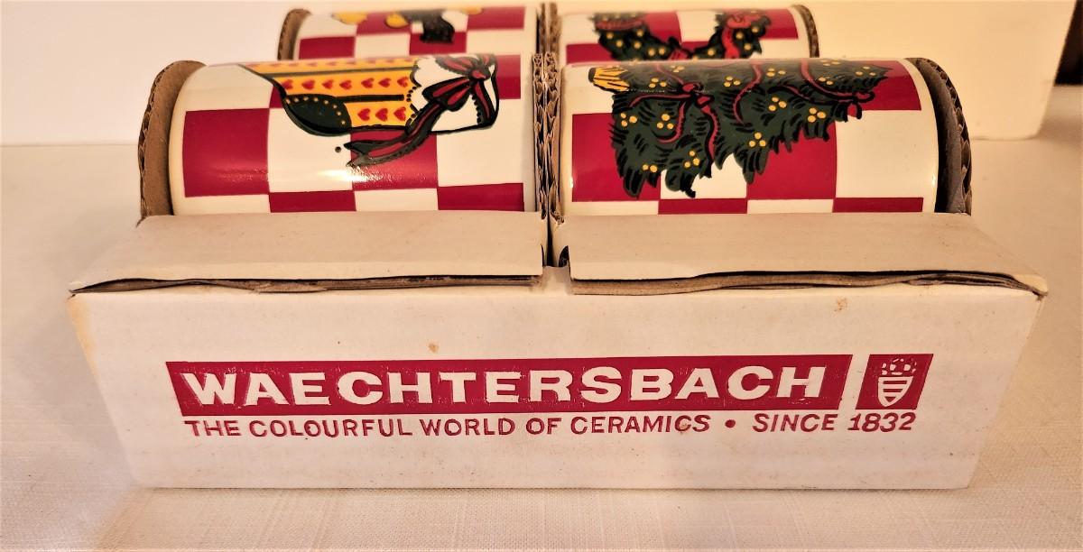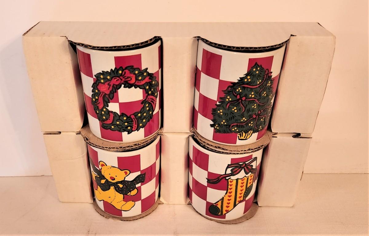 This set of 4 Waechtersbach Christmas glasses dates from the 70's but is new in packaging. Each stands 4" tall. This is a collectible brand - check them out on ebay.