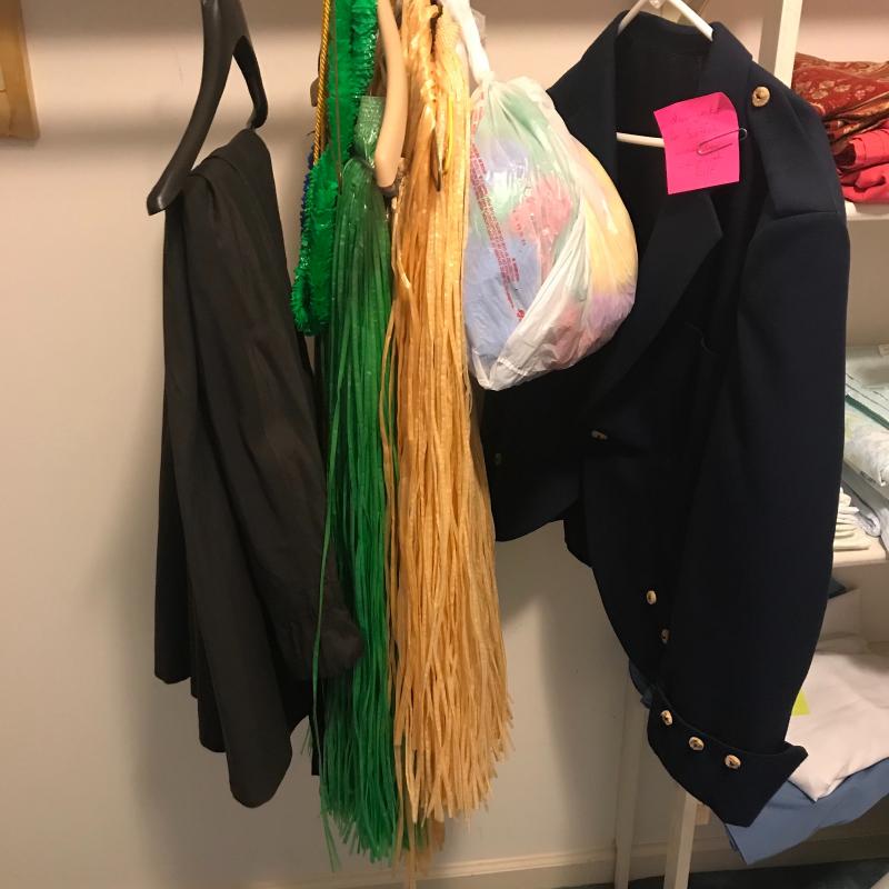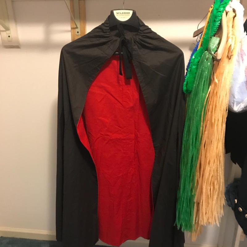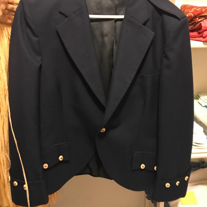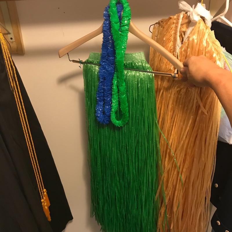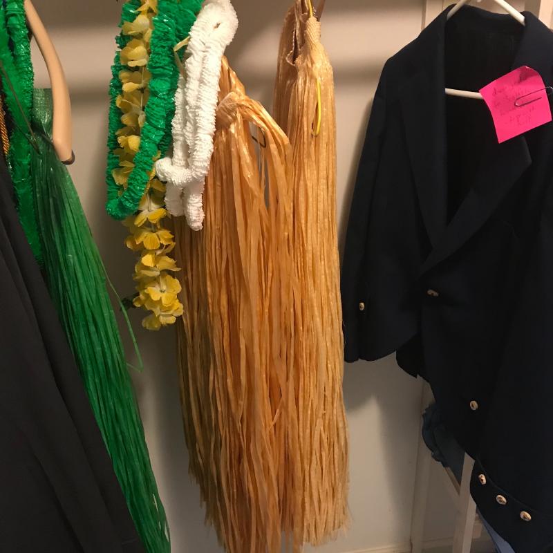 Lot includes black cotton red lined cape, three grass hula skirts and multiple plastic Lai’s. Also includes a formal Terylene Jacket to go with Scottish kilt. No kilt included. Shipping available.