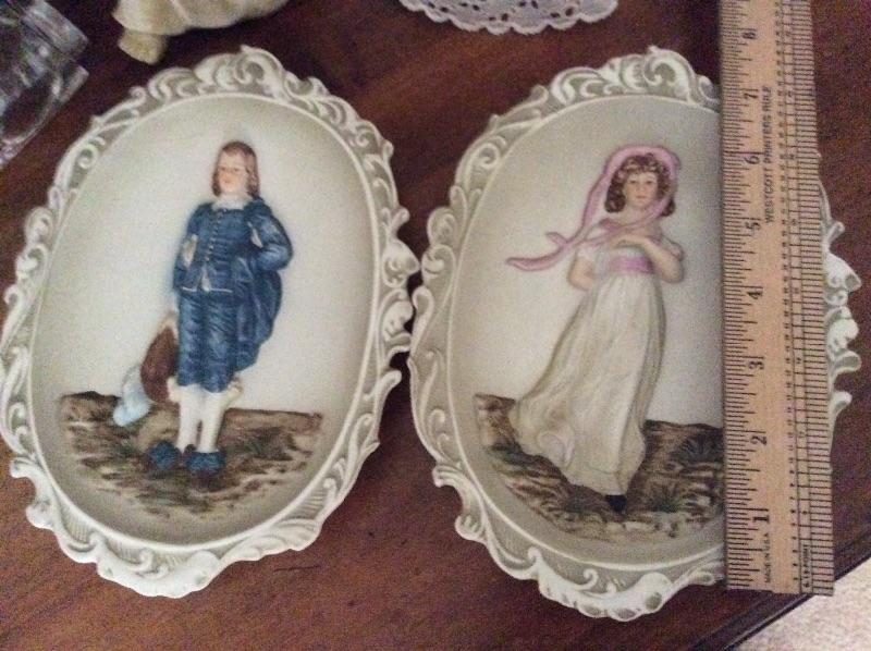 Lot 113: Vintage Lefton plaques of Blue Boy and Pinkie, angels, lamps, seashells, vintage Avon collectables, milk glass basket And more.