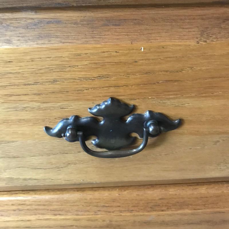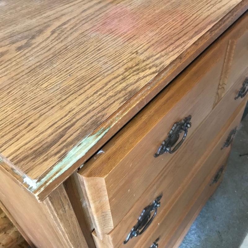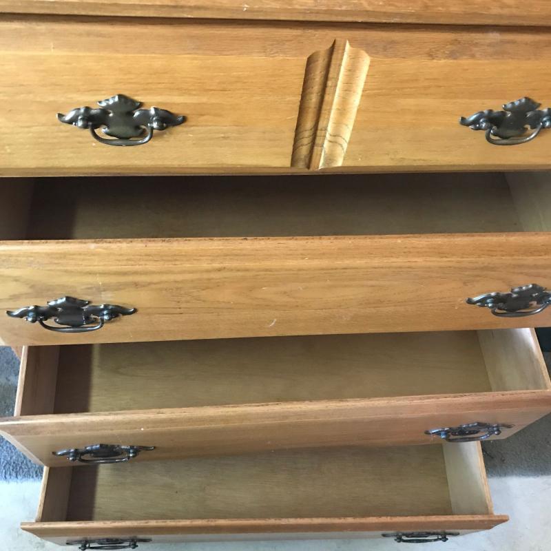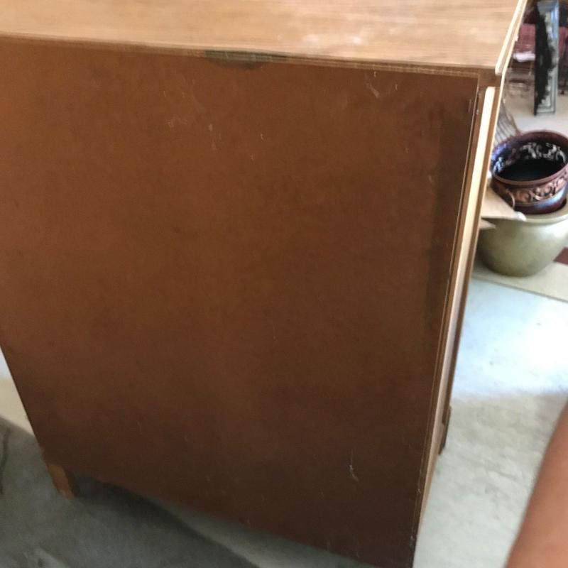 Wooden dresser with veneer top and four drawers. Approx. 33” x 17.5” x 40.5”. No shipping