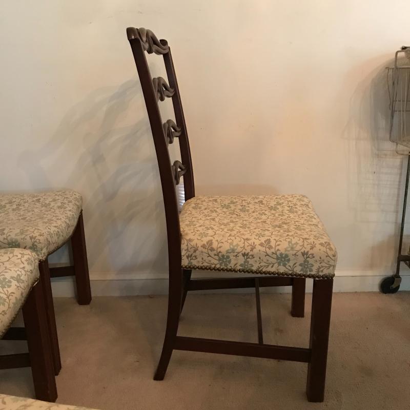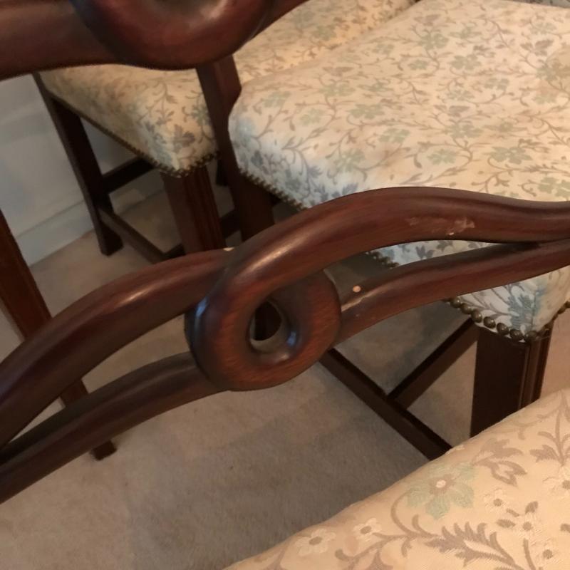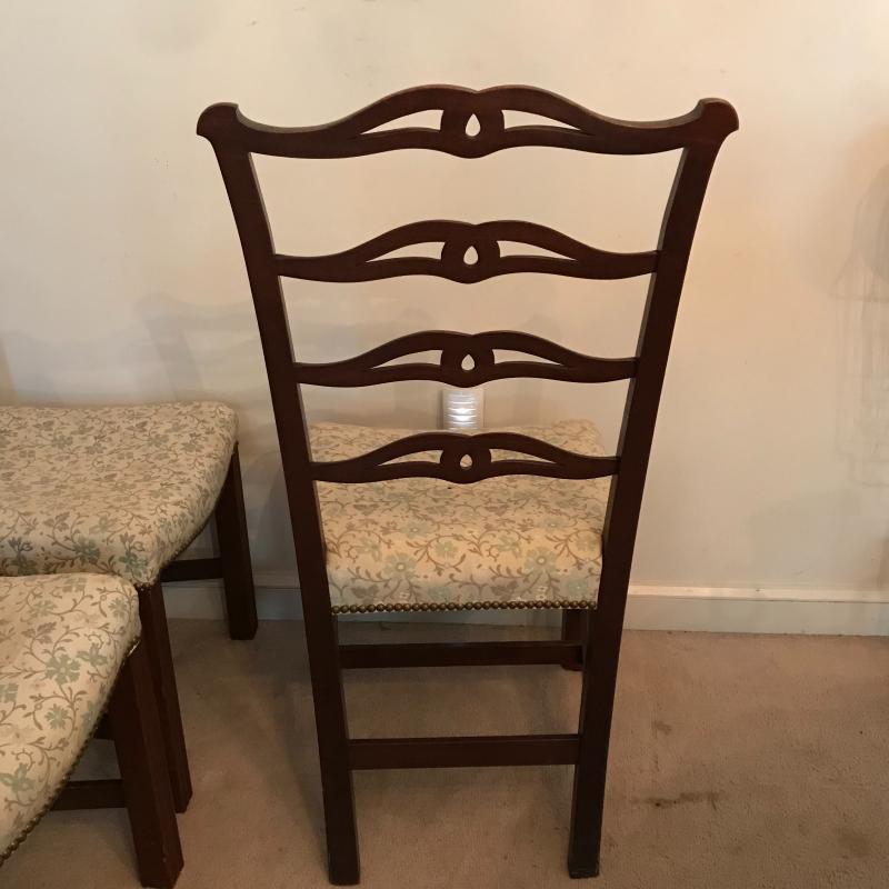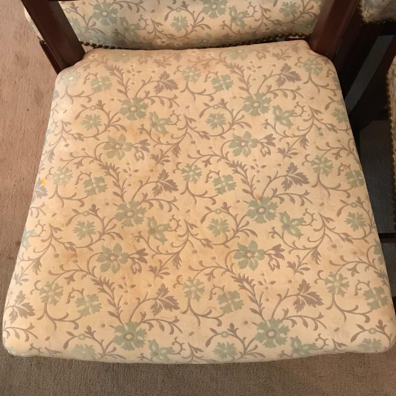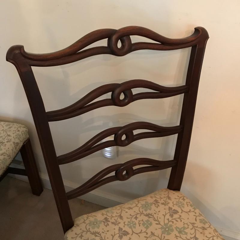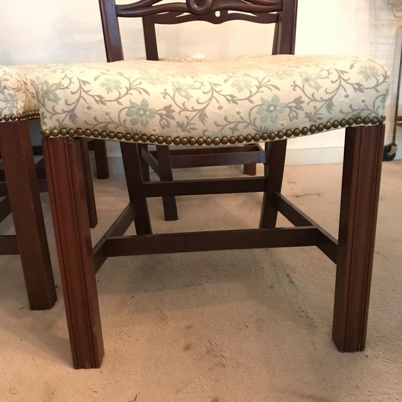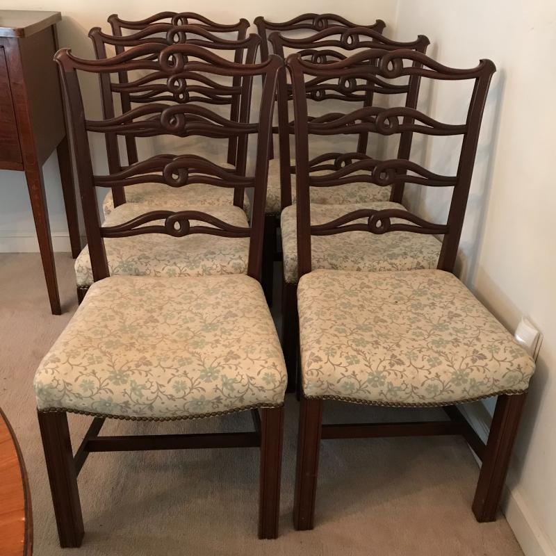 Six attractive dark wood antique chairs to add elegance to any dining area. Each measure 19” x19” x39”. Cushions show some wear and stains, see photos. No shipping.