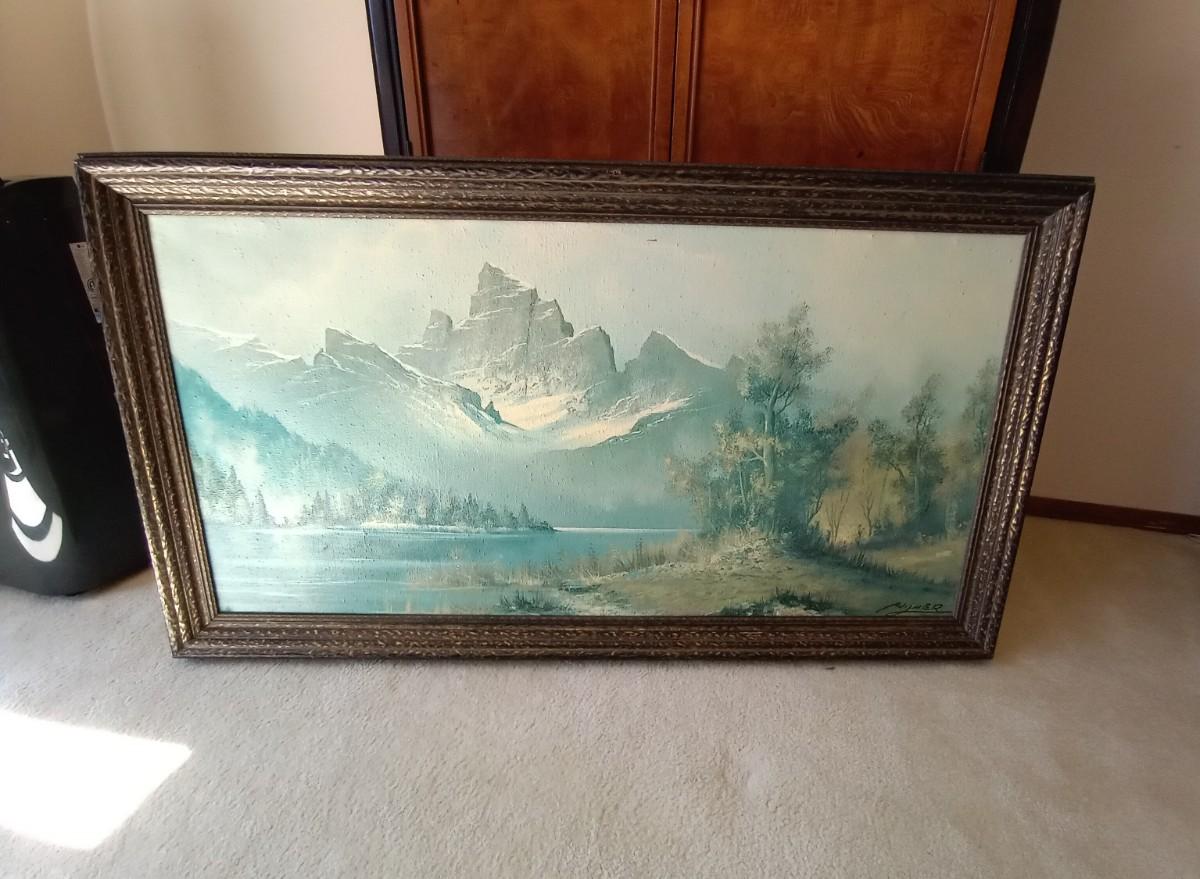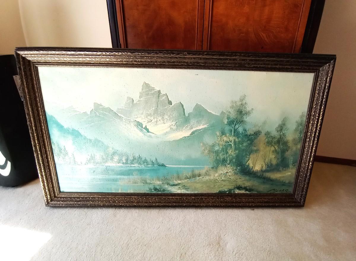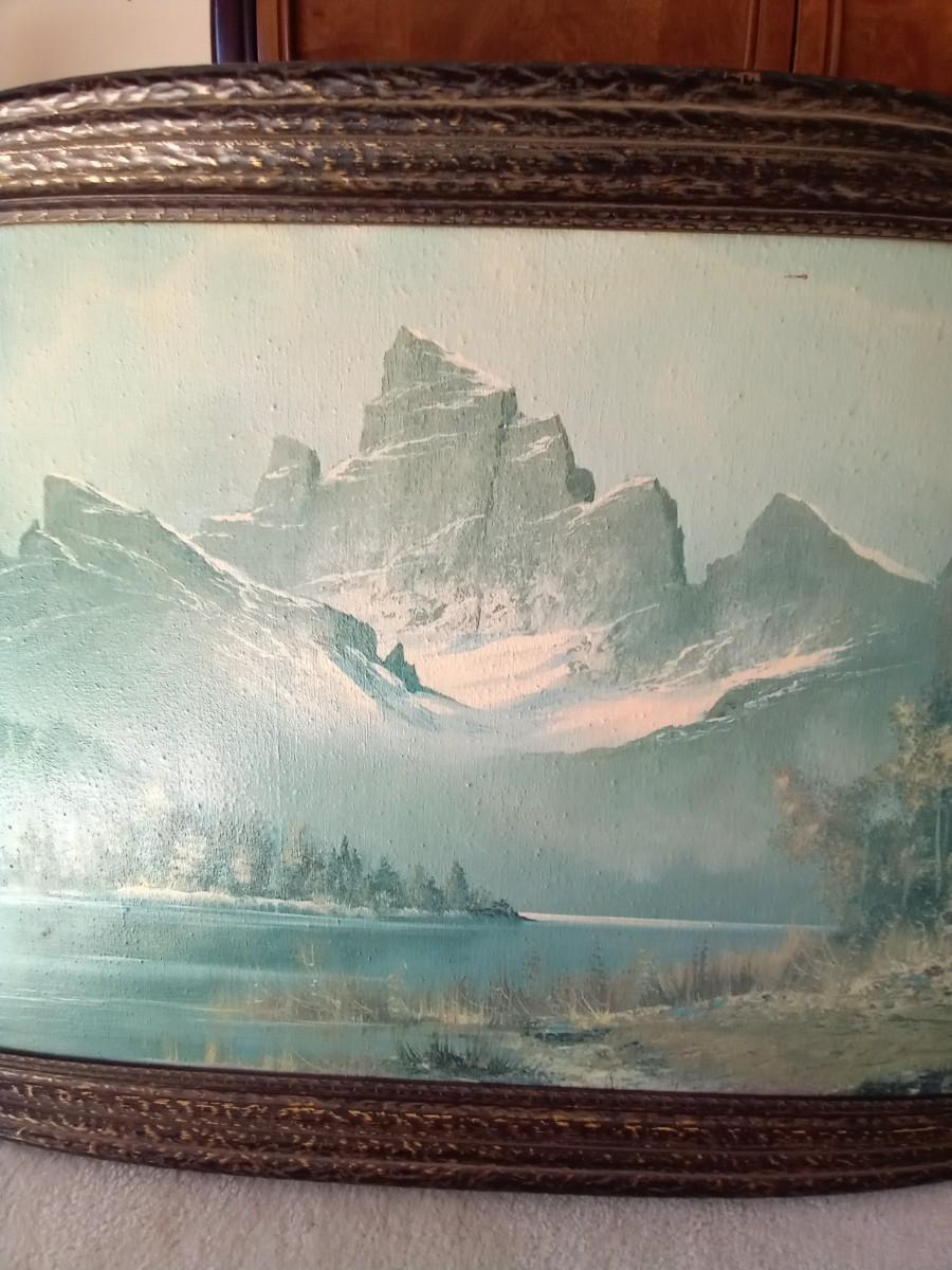 ORIGINAL OILETTE OIL PAINTING "TOWERING PEAKS" BY WILMER MEASURES 53X30