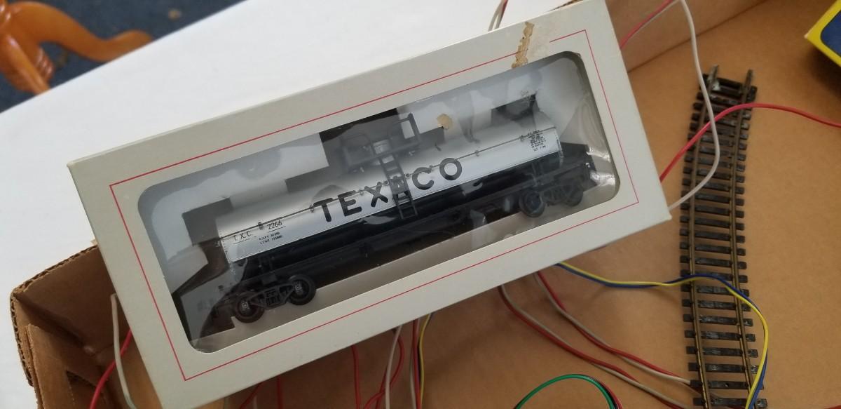 HO Scale Santa Fe Locomotive in box with 3 cars (also in original boxes) - Texaco Tank Car, Double Box car, and Open Hopper, along with some track.