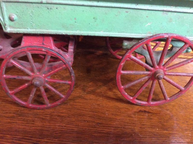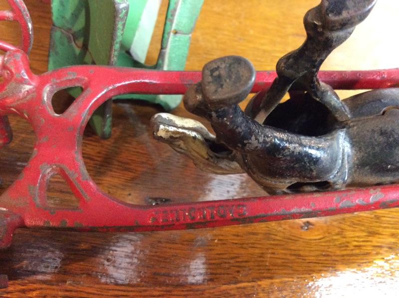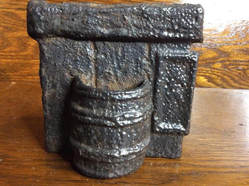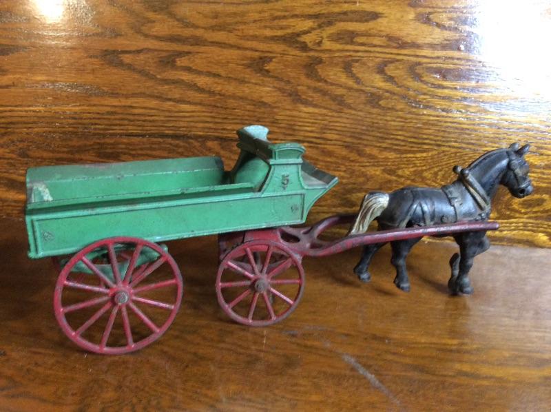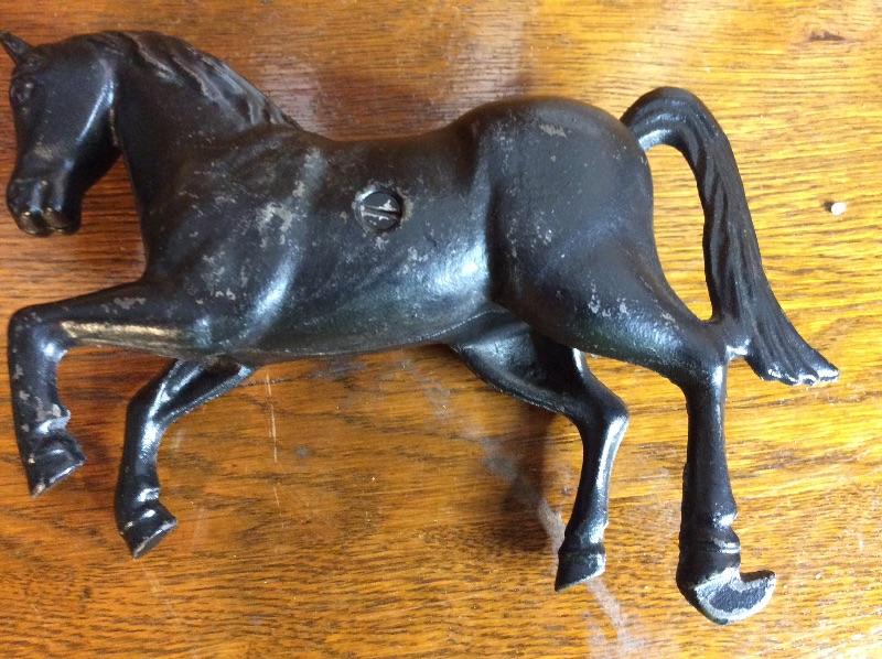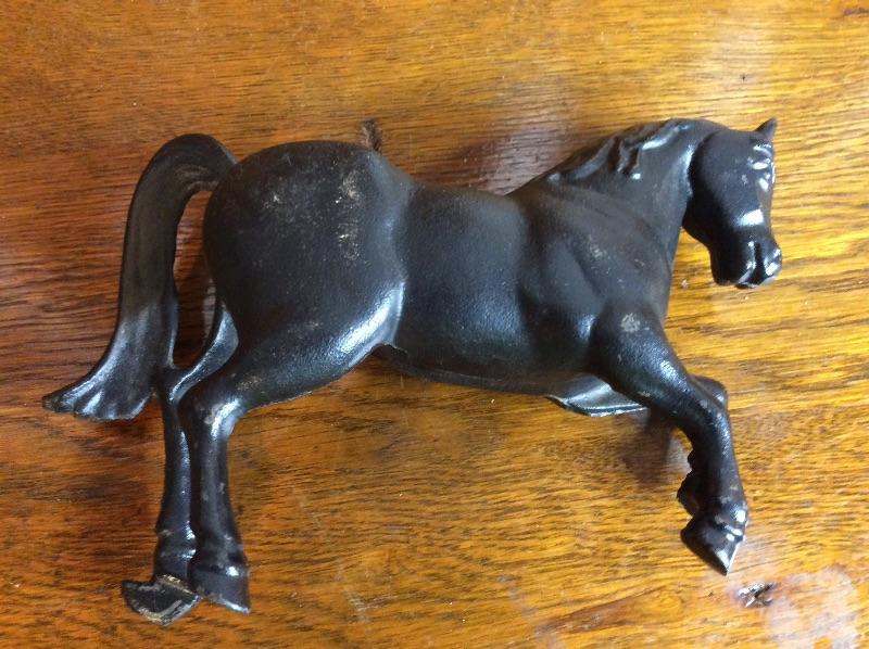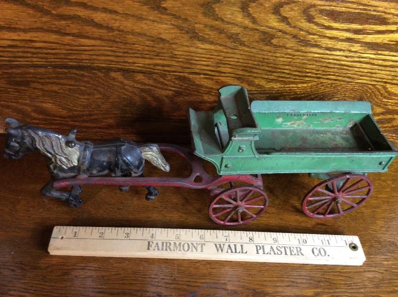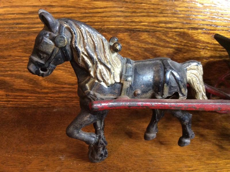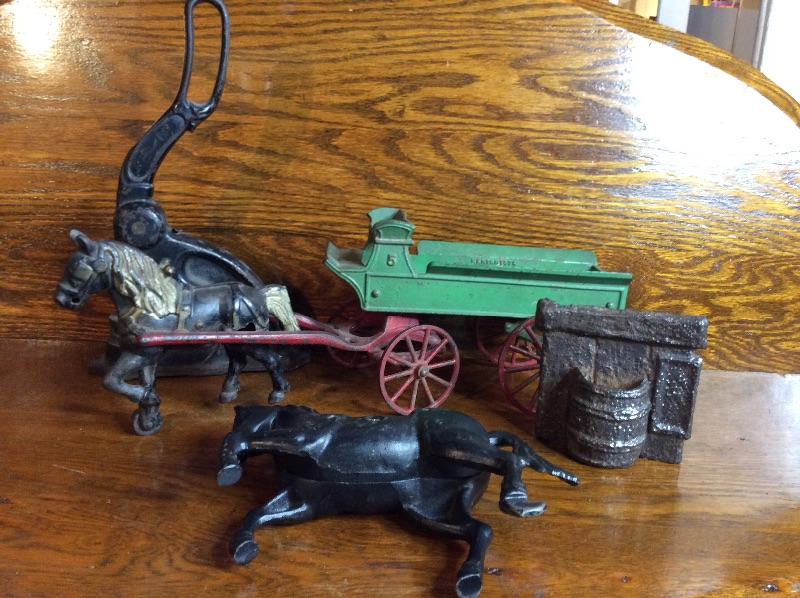 Antique cast iron horse and wagon by Kenton Toys, a horse bank that does not stand, should be attached to a wagon or carriage, a match holder and a vintage notary press. Please see measurements, and all pictures for condition. Thank you for looking and have fun bidding.