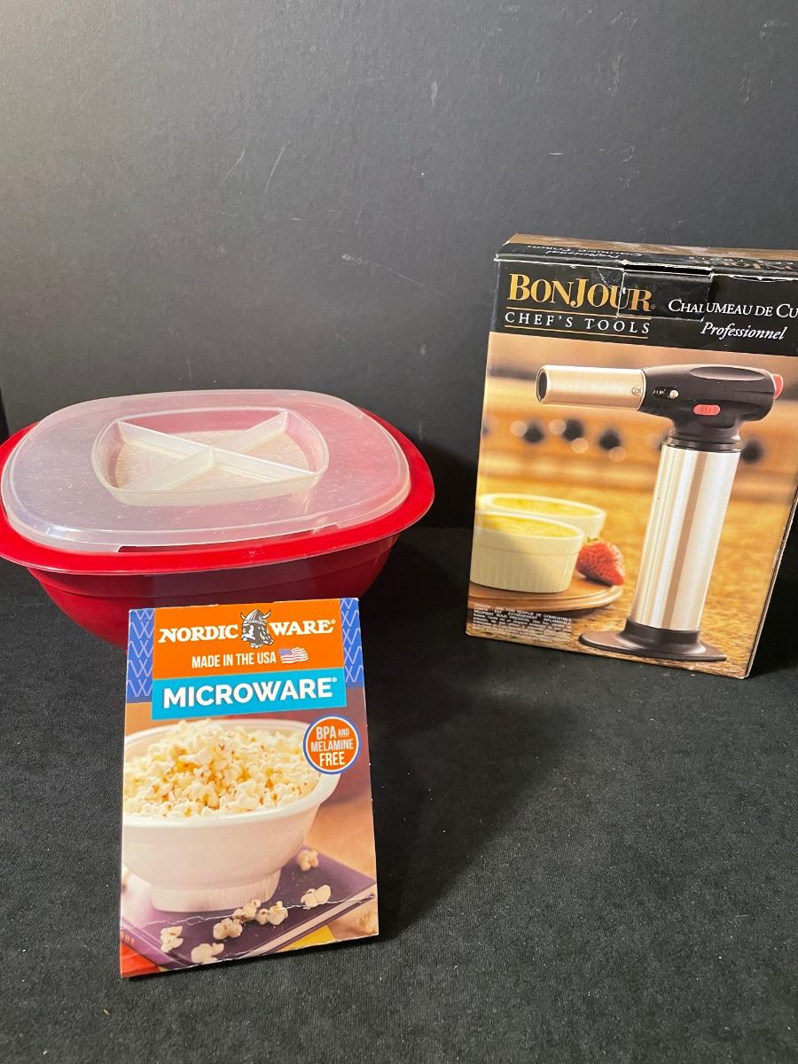 Includes Nordic Ware microwave popcorn maker and a Bonjour kitchen torch.
