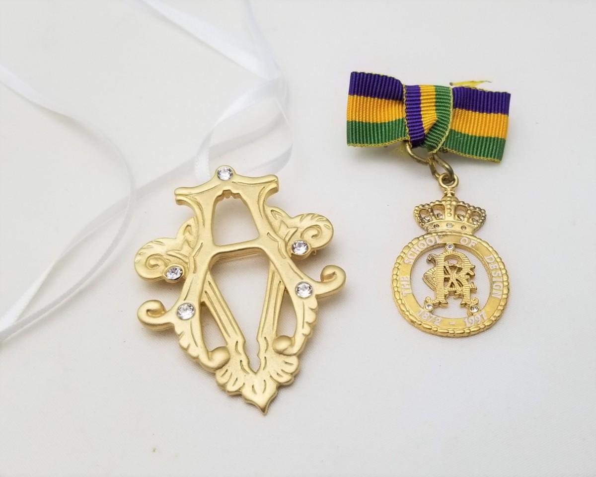 Ladies Ducal from the Rex ball of 1997 and a hard to find favor from the Comus Queen in 2017, designed by Adler. Can be worn as a brooch or a pendant. Letters A and V - the V is actually the Roman Numeral "5", which is the number of members of her family who have been Comus royalty. It's 1.5" long. Both in excellent condition.