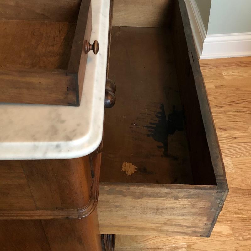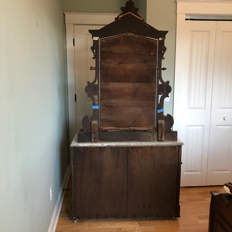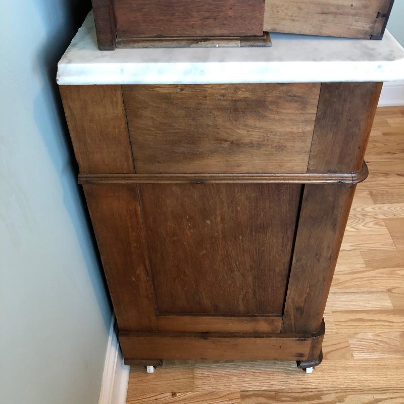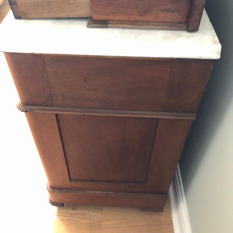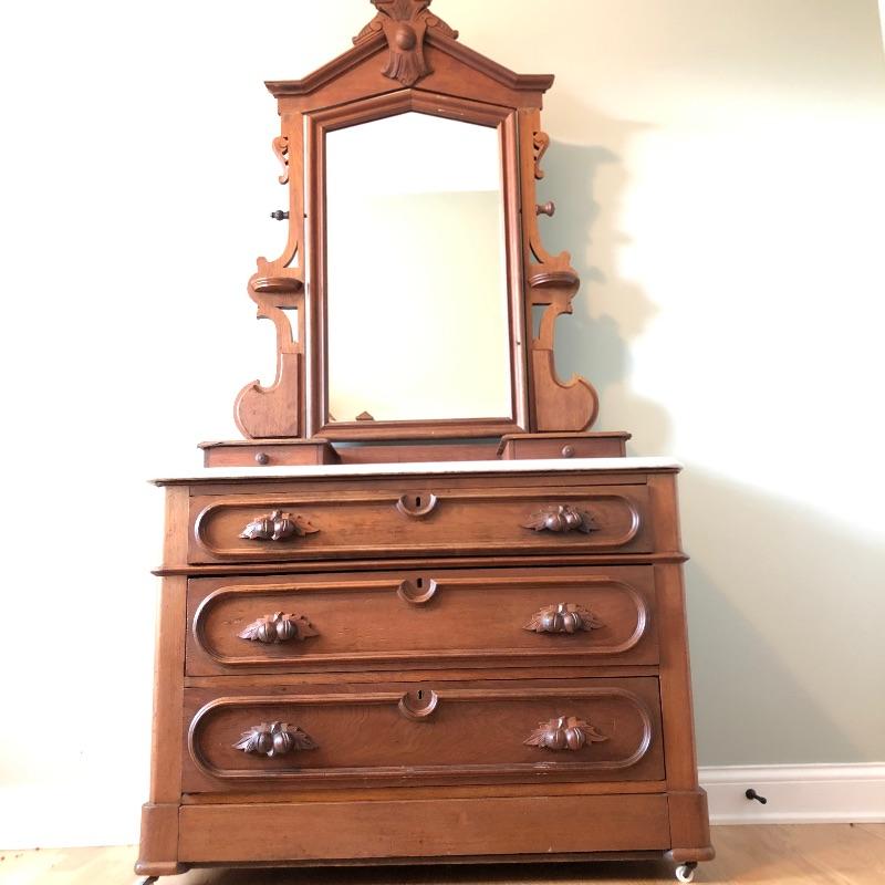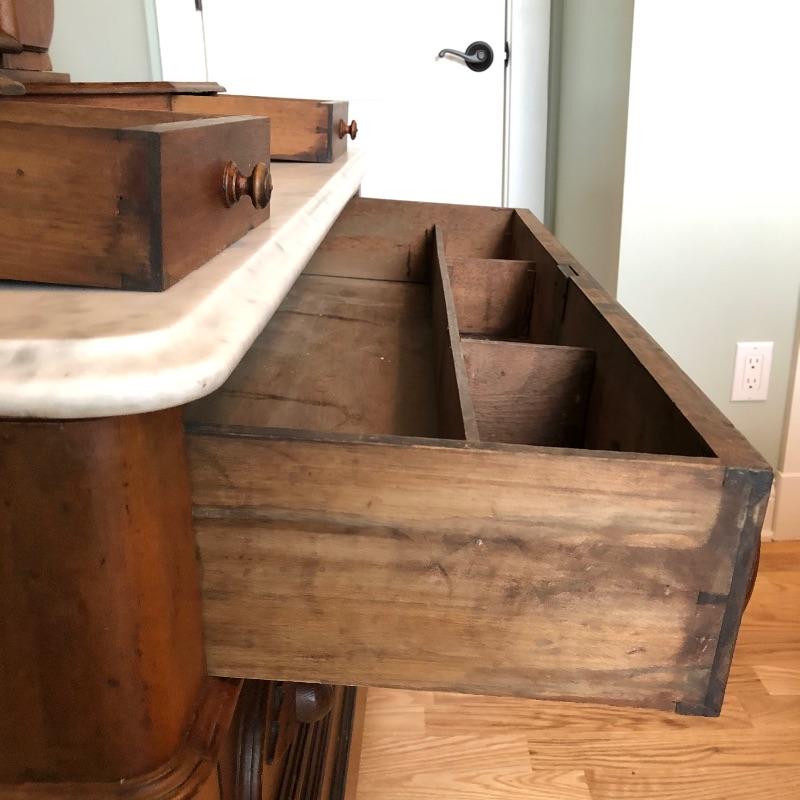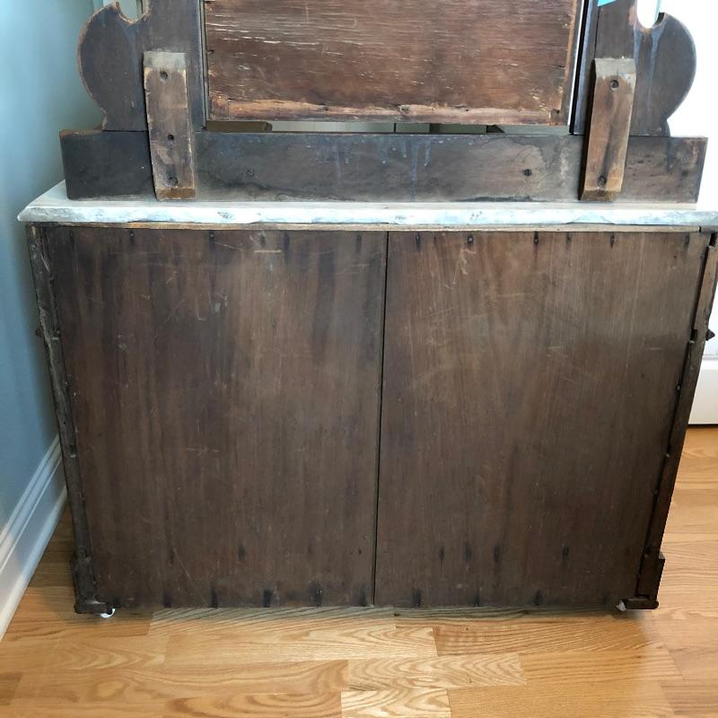 The classic detail truly makes this a timeless piece of furniture and the casters on the bottom make it easy to move. There are minor blemishes throughout from its age -see photos. The marble top is not permanently attached to the chest of drawers and the mirror which includes the 2 small side drawers is not attached to the marble top so you have options. No keys for drawers.