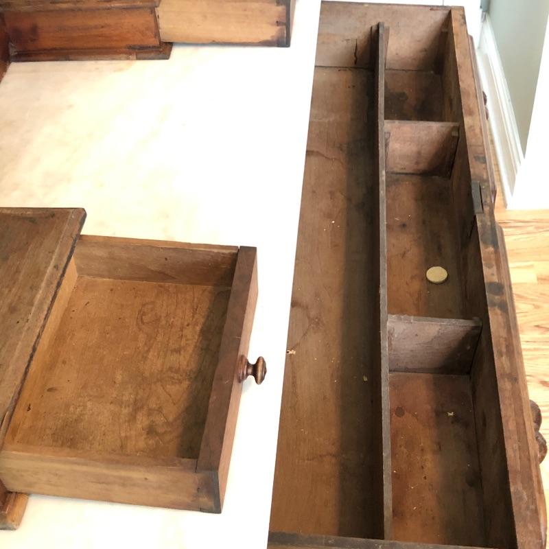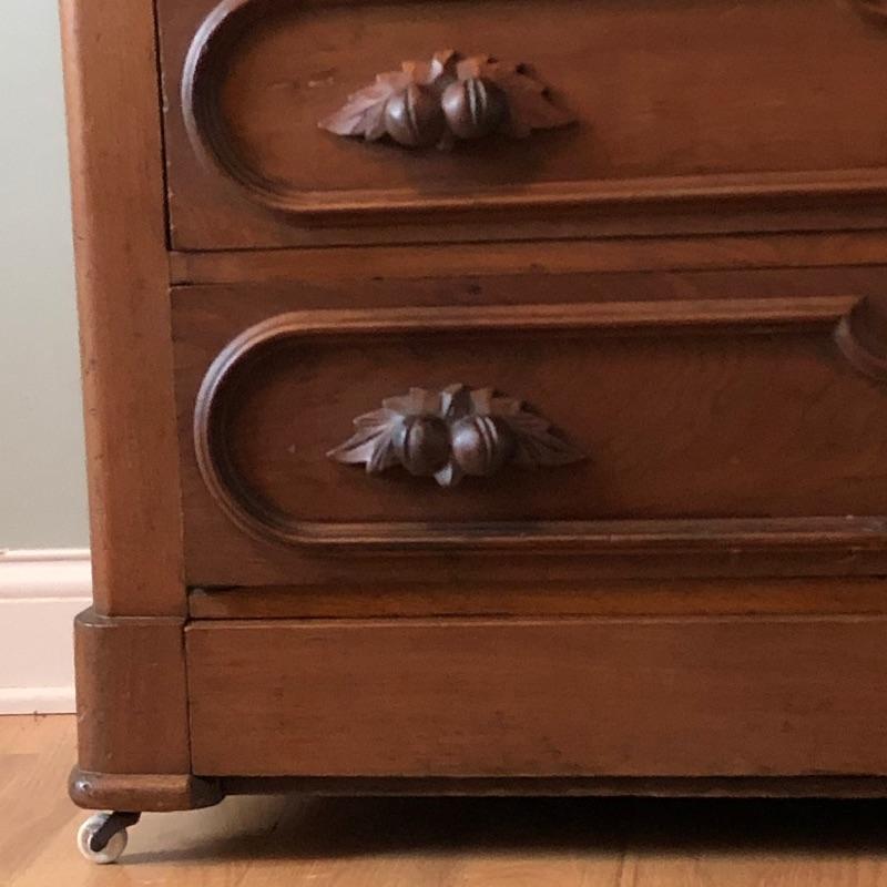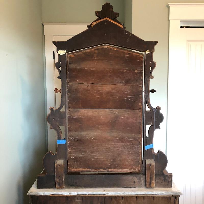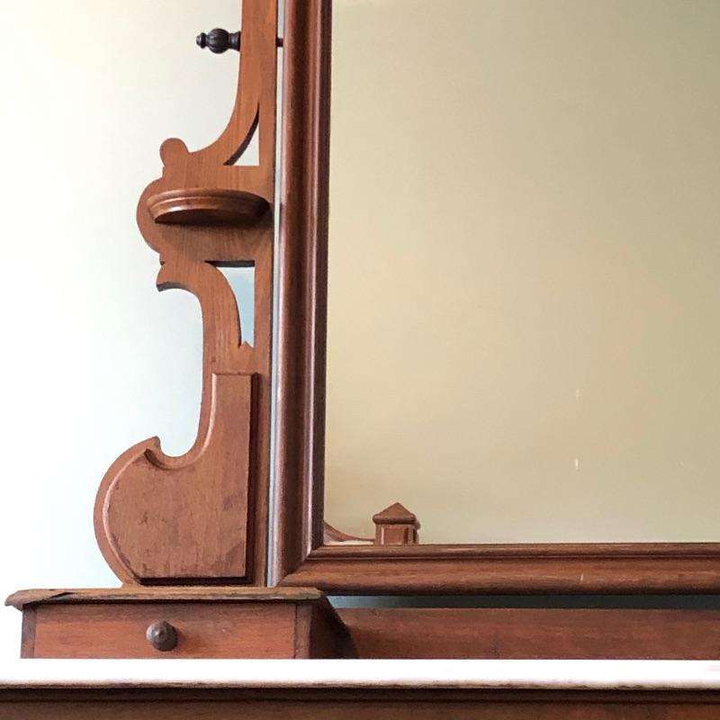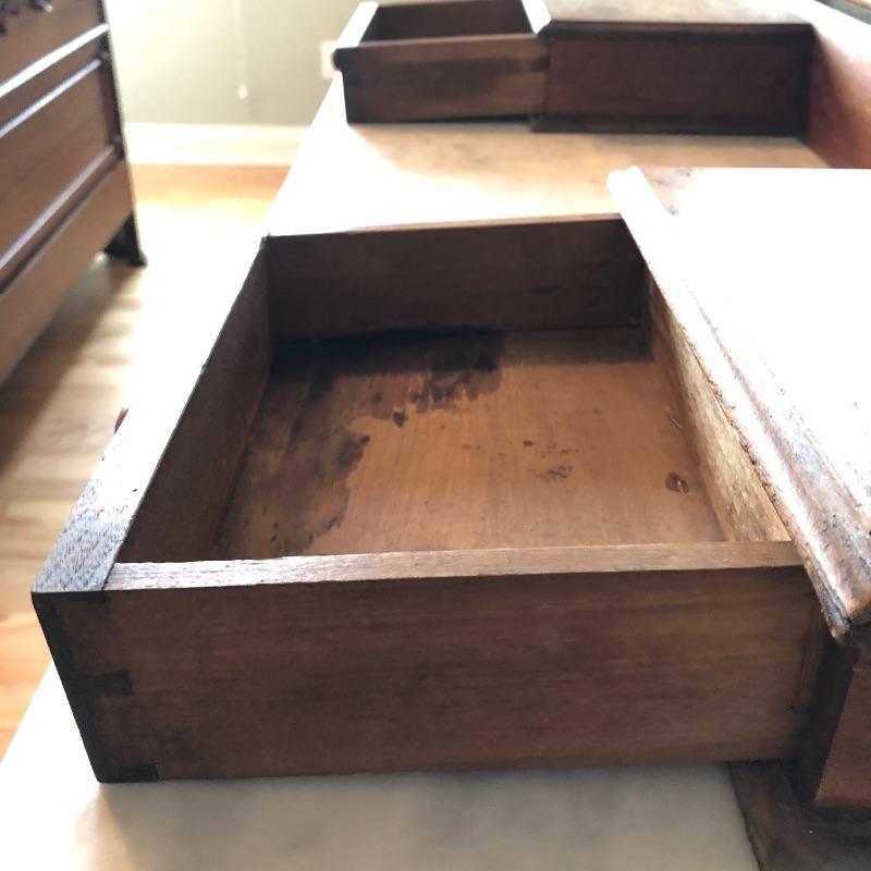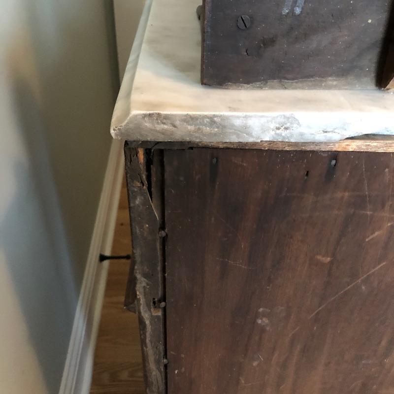 The classic detail truly makes this a timeless piece of furniture and the casters on the bottom make it easy to move. There are minor blemishes throughout from its age -see photos. The marble top is not permanently attached to the chest of drawers and the mirror which includes the 2 small side drawers is not attached to the marble top so you have options. No keys for drawers.