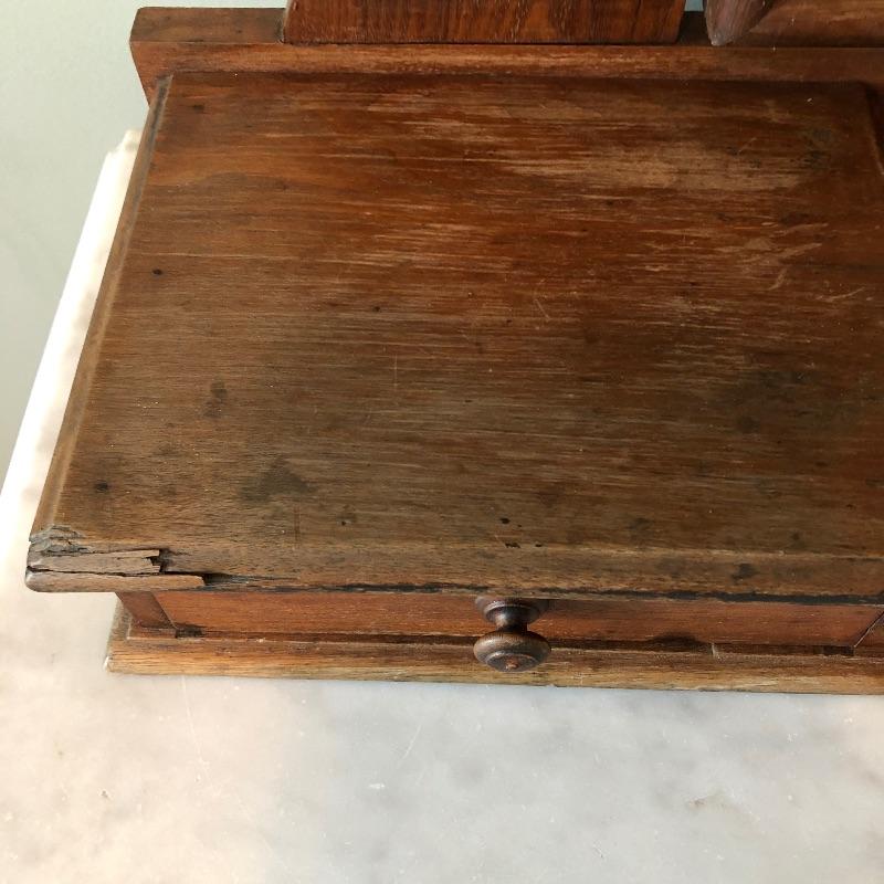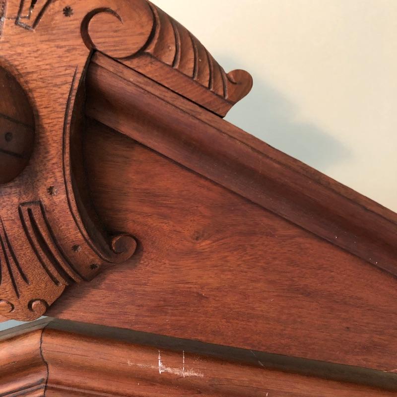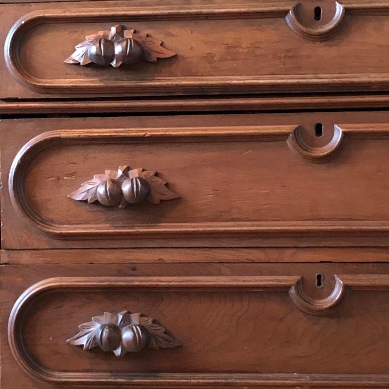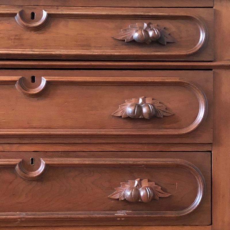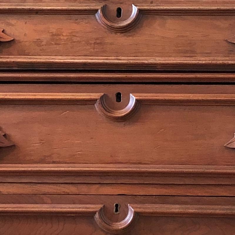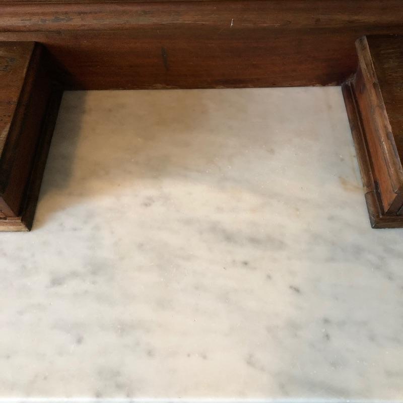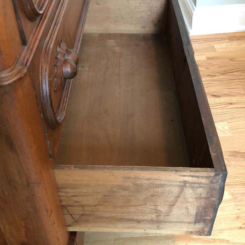 The classic detail truly makes this a timeless piece of furniture and the casters on the bottom make it easy to move. There are minor blemishes throughout from its age -see photos. The marble top is not permanently attached to the chest of drawers and the mirror which includes the 2 small side drawers is not attached to the marble top so you have options. No keys for drawers.