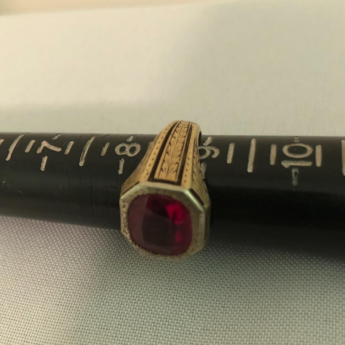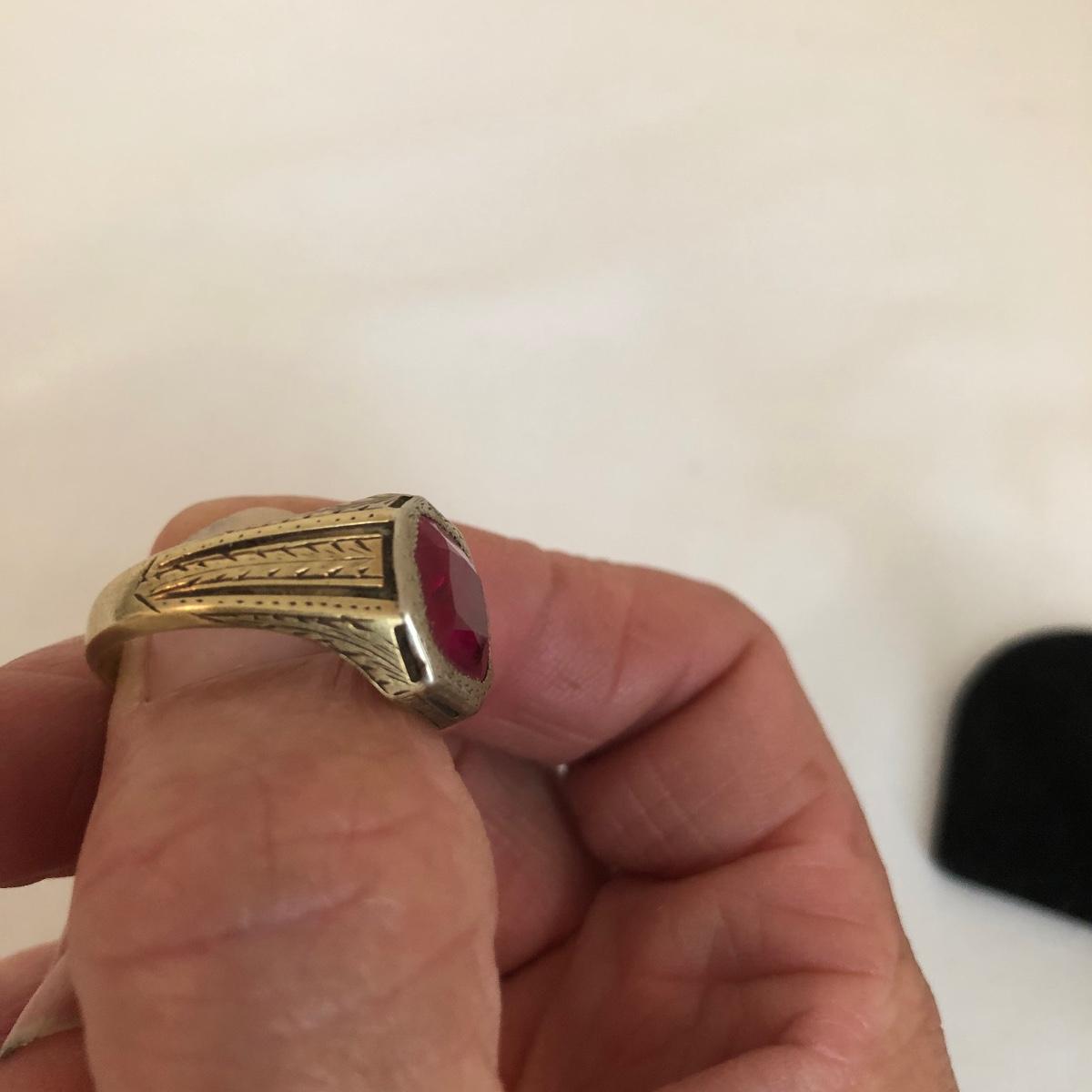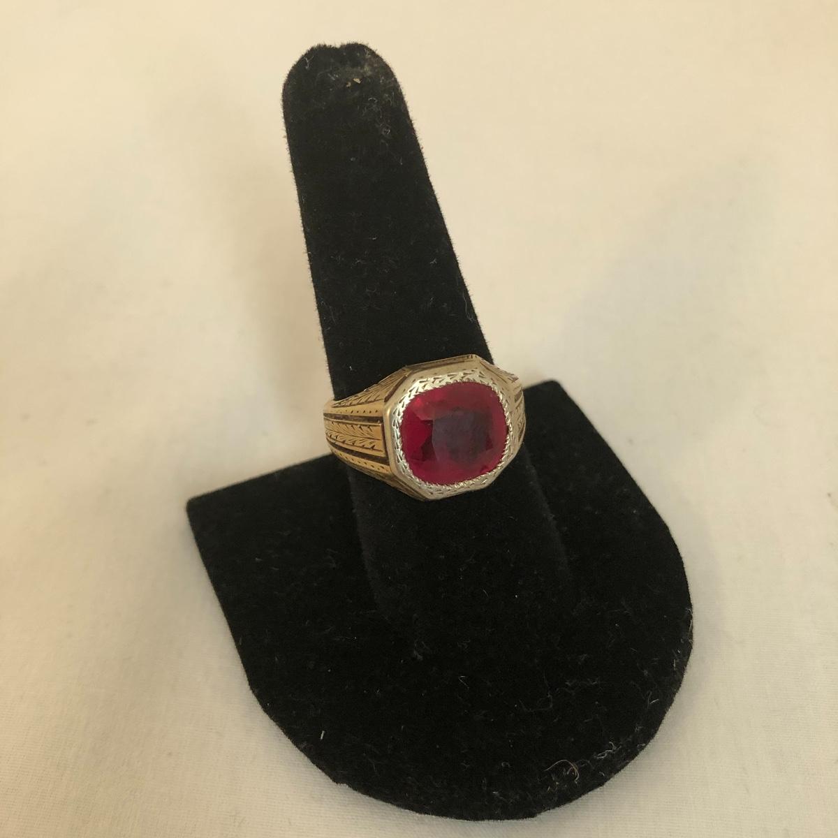 This handsome 14K ring has what appears to be a Ruby or garnet stone but as always we can make no guarantees. Either way it is an eye catching ring. See image for size.