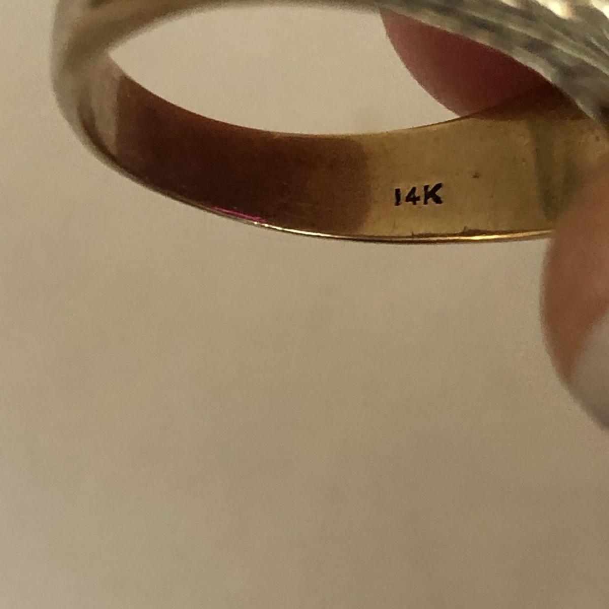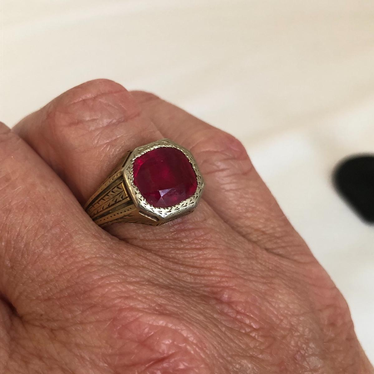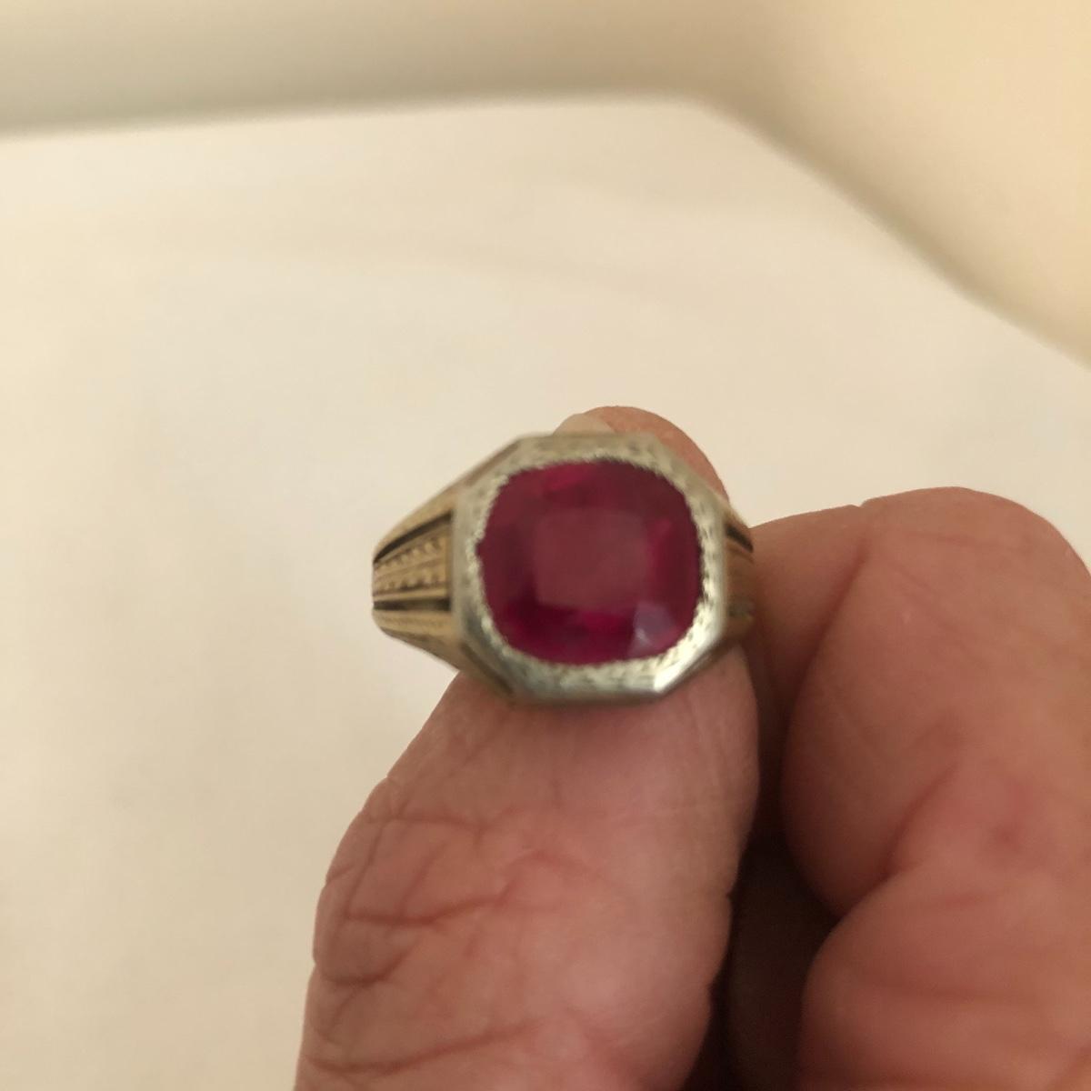This handsome 14K ring has what appears to be a Ruby or garnet stone but as always we can make no guarantees. Either way it is an eye catching ring. See image for size.