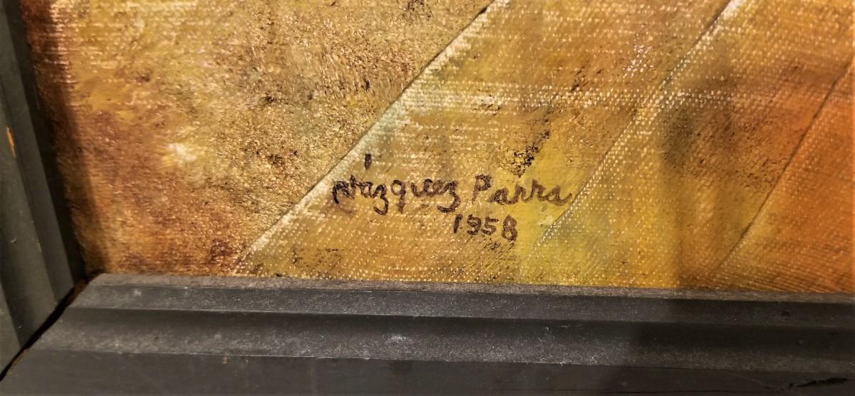 This original oil on canvas is dated 1958 and was painted by Listed Artist Nazquez Parra (1927-1984). He was known for Mexican Market scenes and stylized figure painting. Lots of auction results, usually in the $200-500 range. This piece measures 22.5 x 18.25. This is a classic example of his work during his heyday.