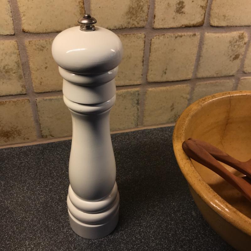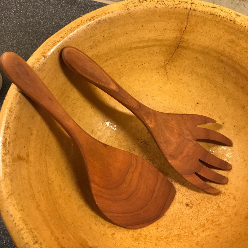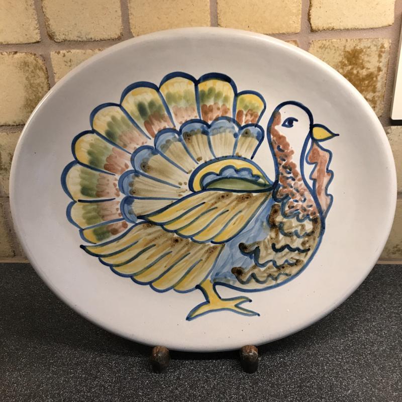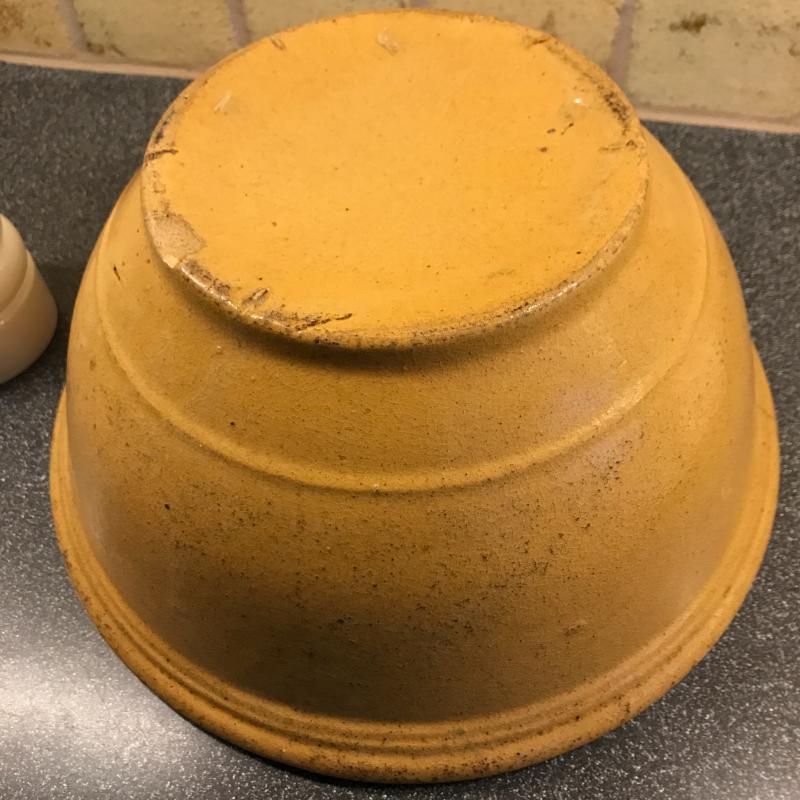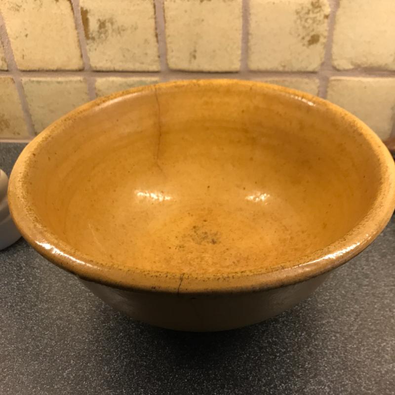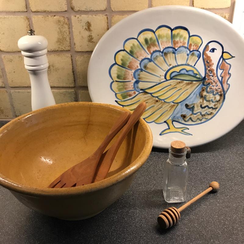 This lot has several fun pieces including a turkey platter by Louisville Stoneware (15.5”l x 13”w), a glass honey bottle and stick (4.5”h), a pepper mill, nice wooden salad tongs, and a large vintage yellow ceramic mixing bowl (11.5”d x 5”h). The bowl shows its age with a couple of cracks on sides but is still functional. Shipping or local pick up in Asheville.