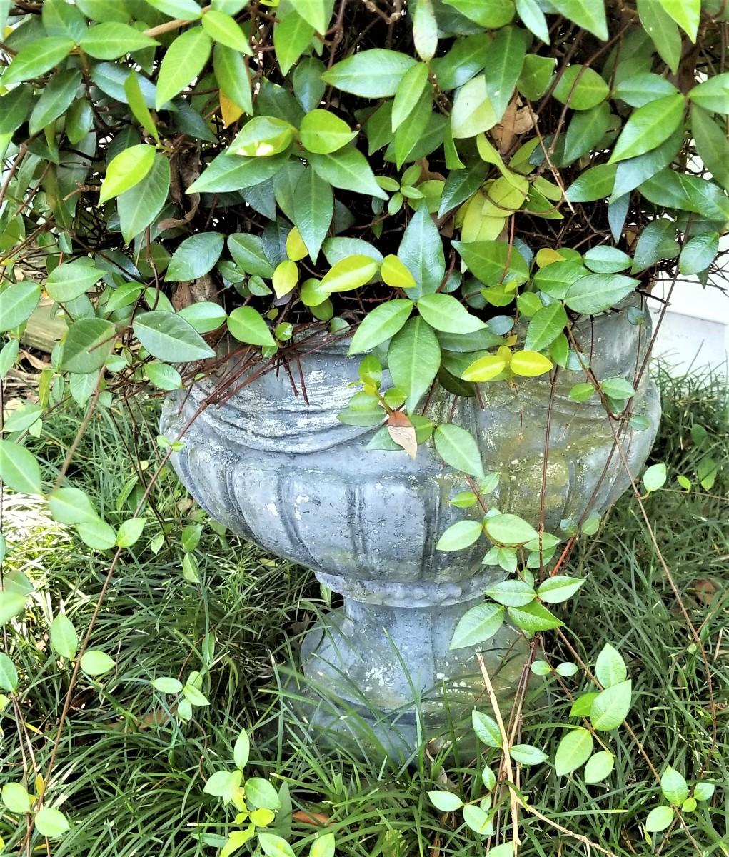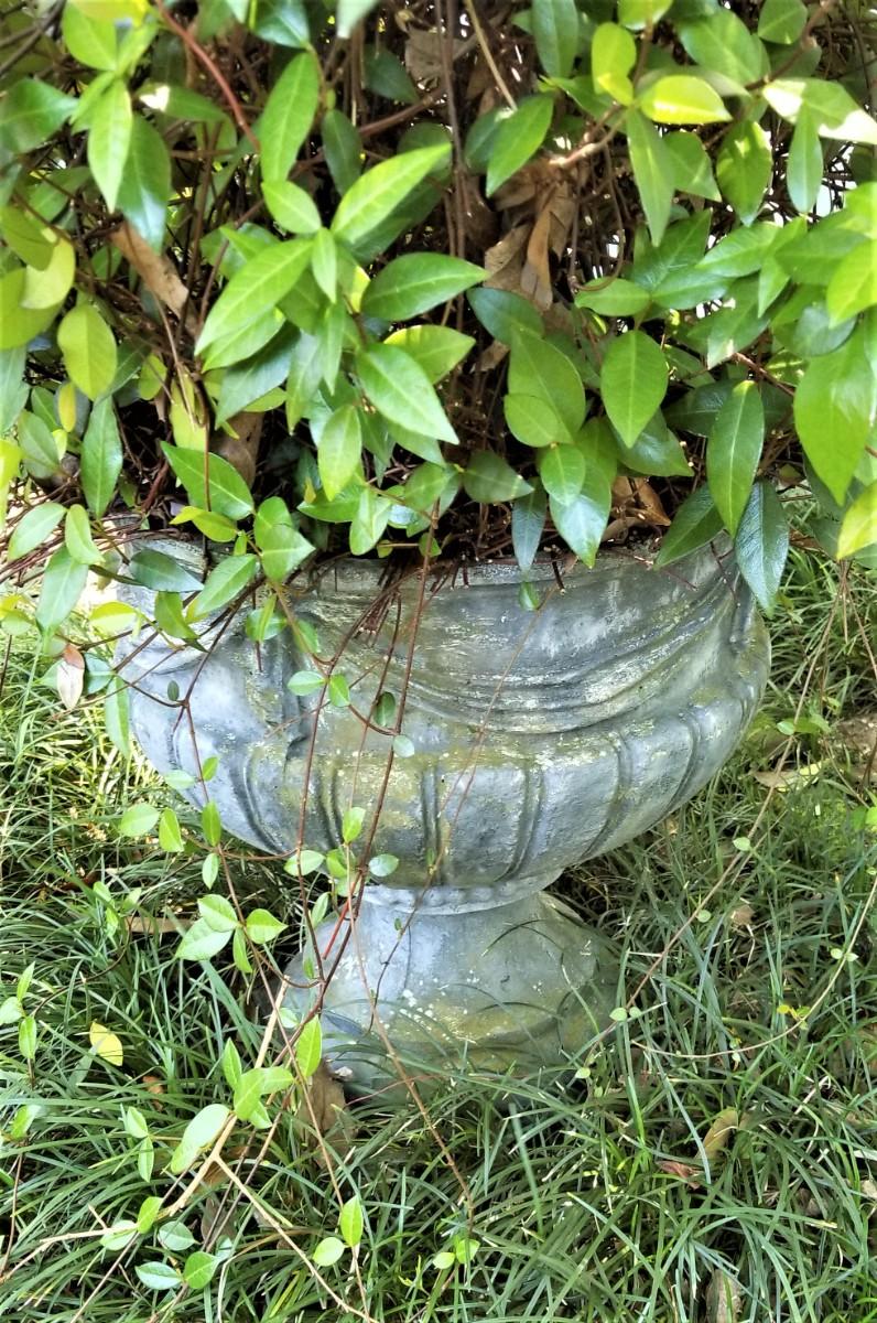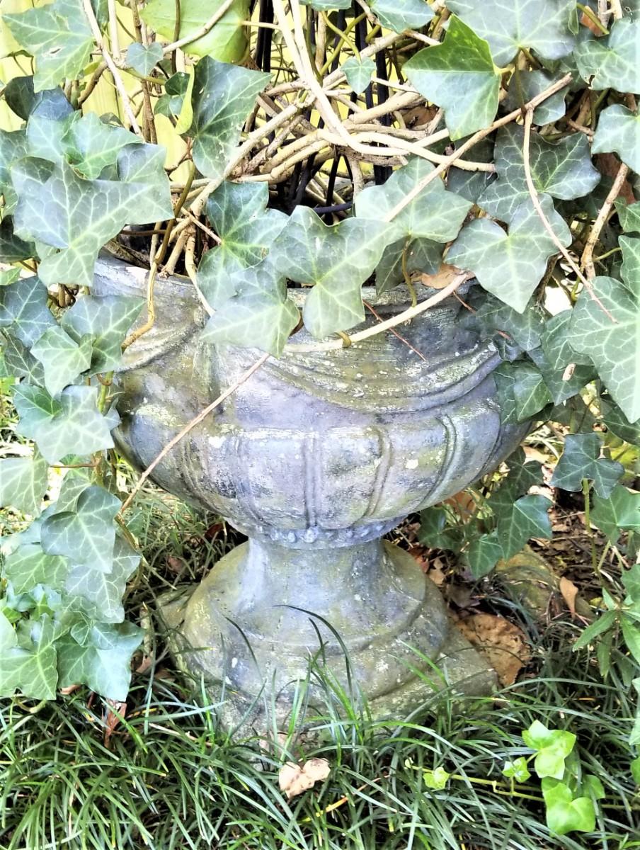 Two identical vintage concrete planters - urns. Both have plants growing in them. You will have to move these yourself. Very heavy. Each measures 17.5" tall, 15" across.