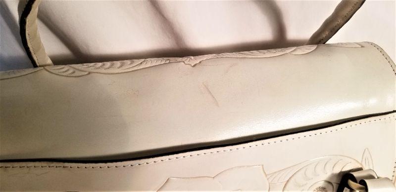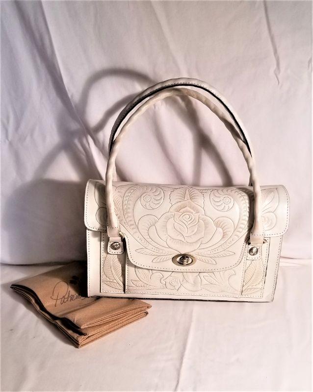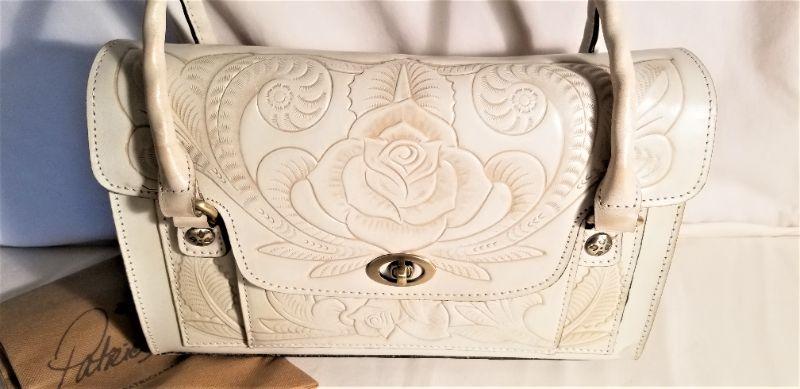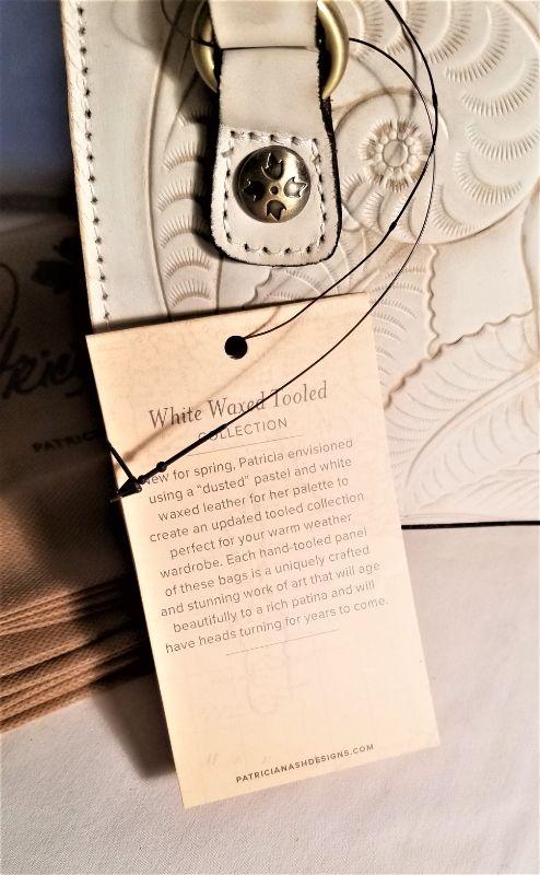 Lovely Patricia Nash tooled leather handbag - still has tag attached. Comes with original storage bag. Measures 12.5" across, 9" tall, 15" with handle. Note one scuff on the bag (see photo).