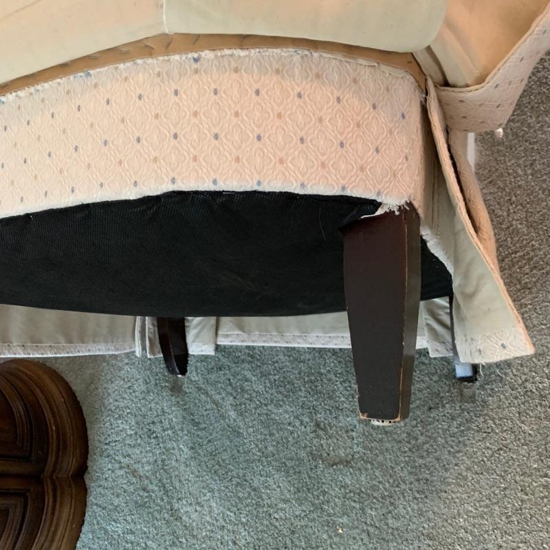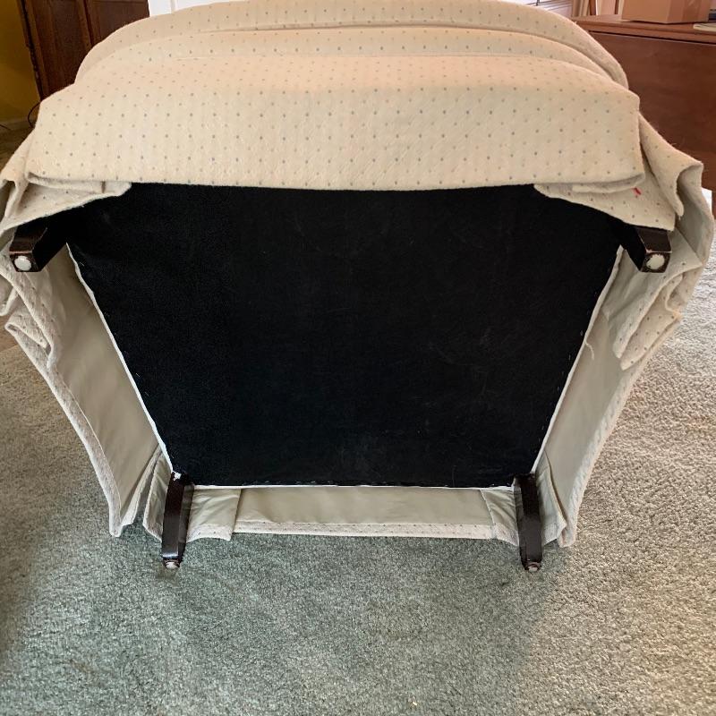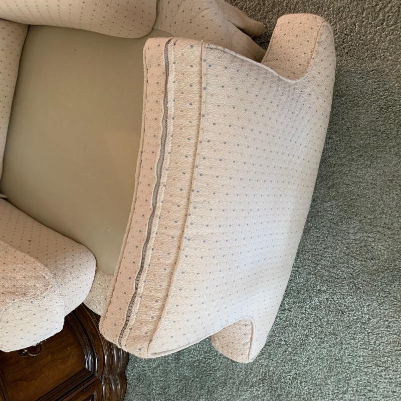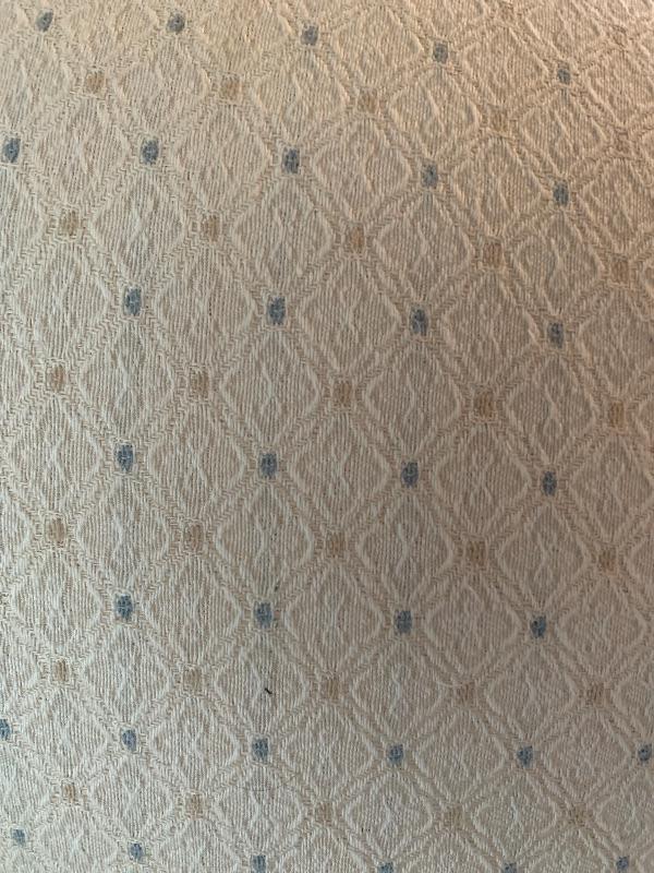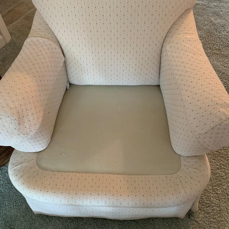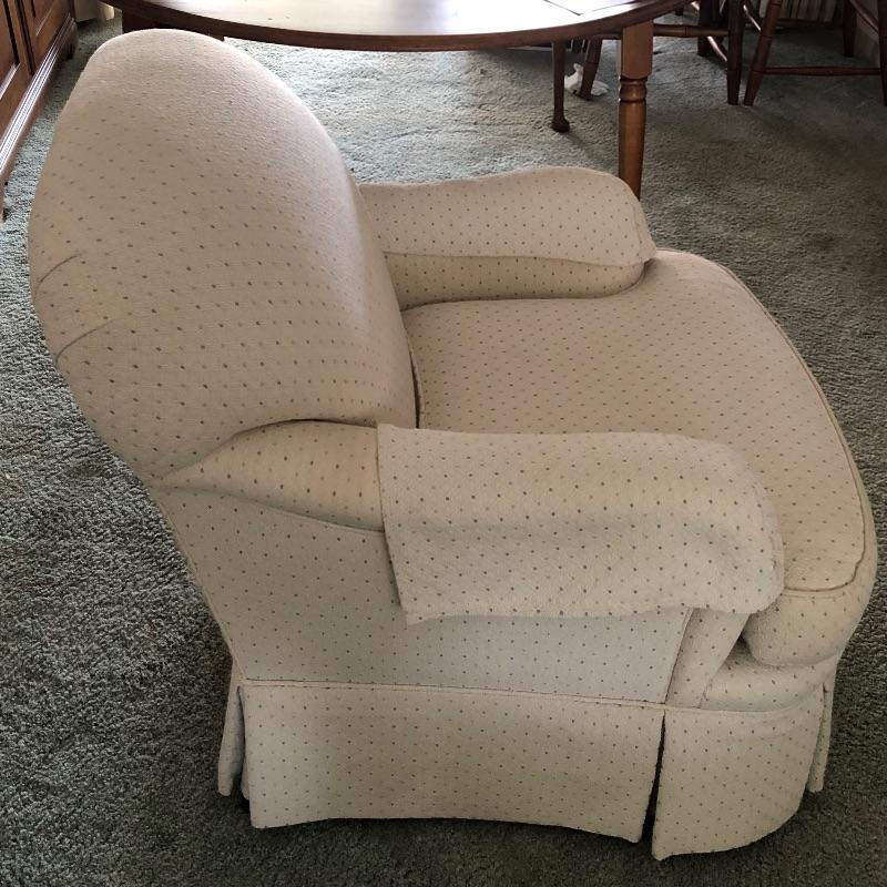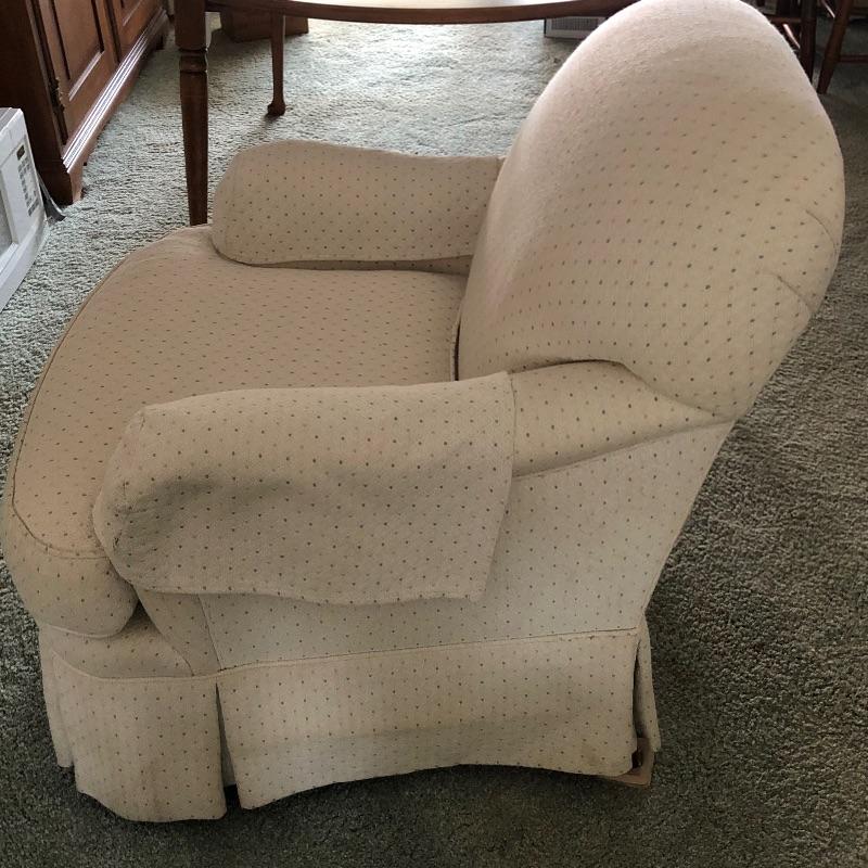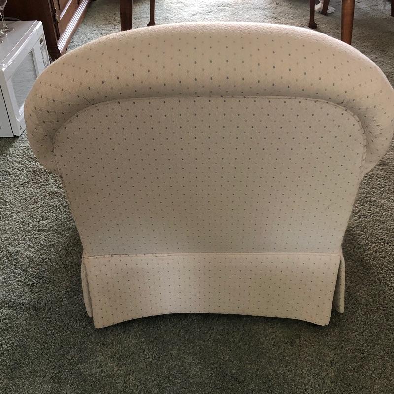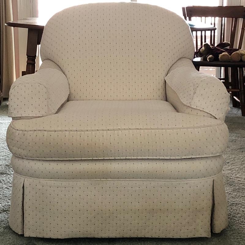 This cream club chair with subtle texture and pattern of muted blue and tan polka dots is in excellent condition. Photos show shadows no stains found.