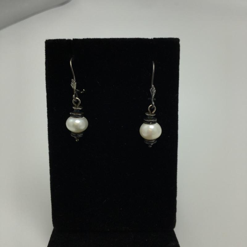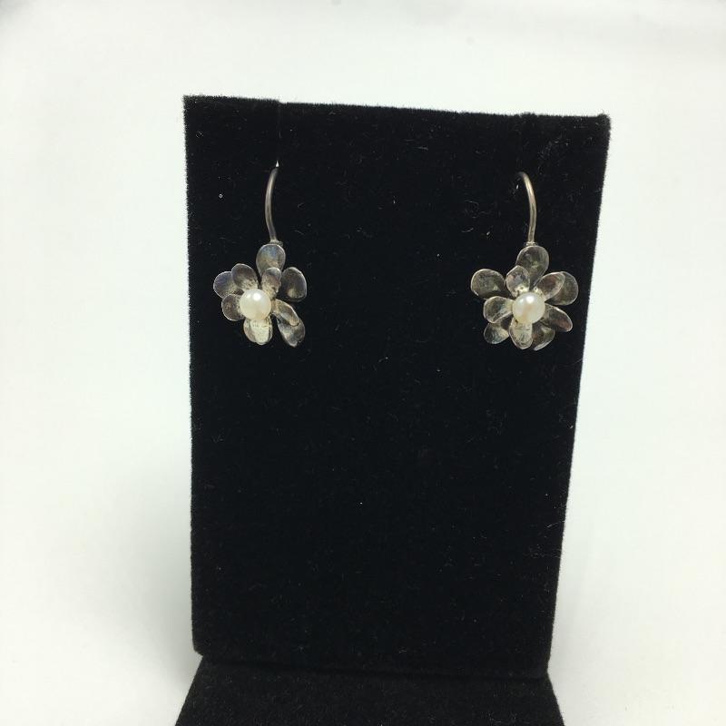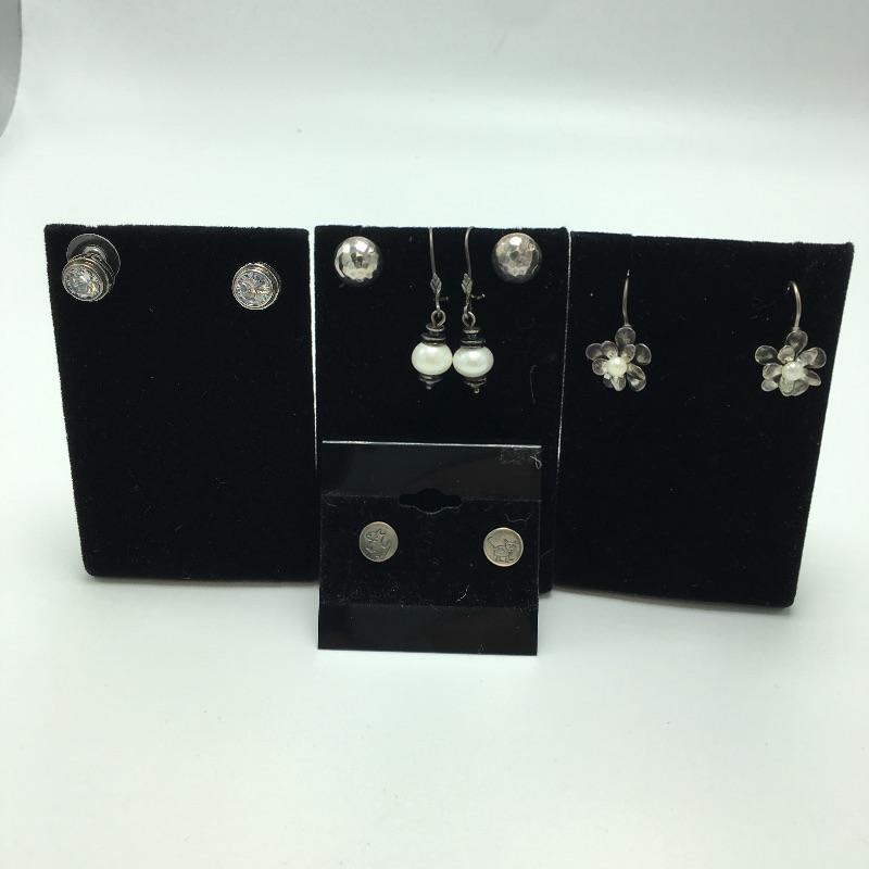 Selection of Silpada earrings includes cat and dog sterling silver earring, sterling silver flower earrings with white freshwater pearl centers on locking French wires, hammered sterling silver earrings on posts, freshwater pearl and sterling silver earrings on locking French wires and cubic zirconia earrings set in scrolling sterling silver on posts.