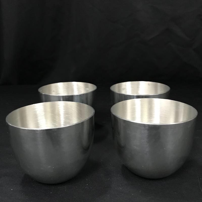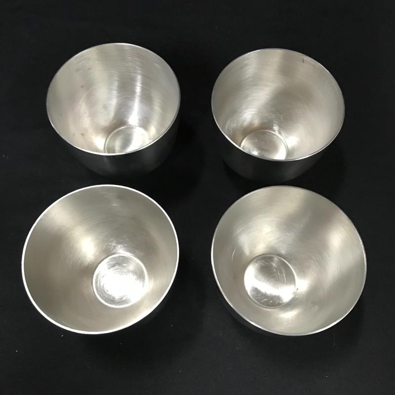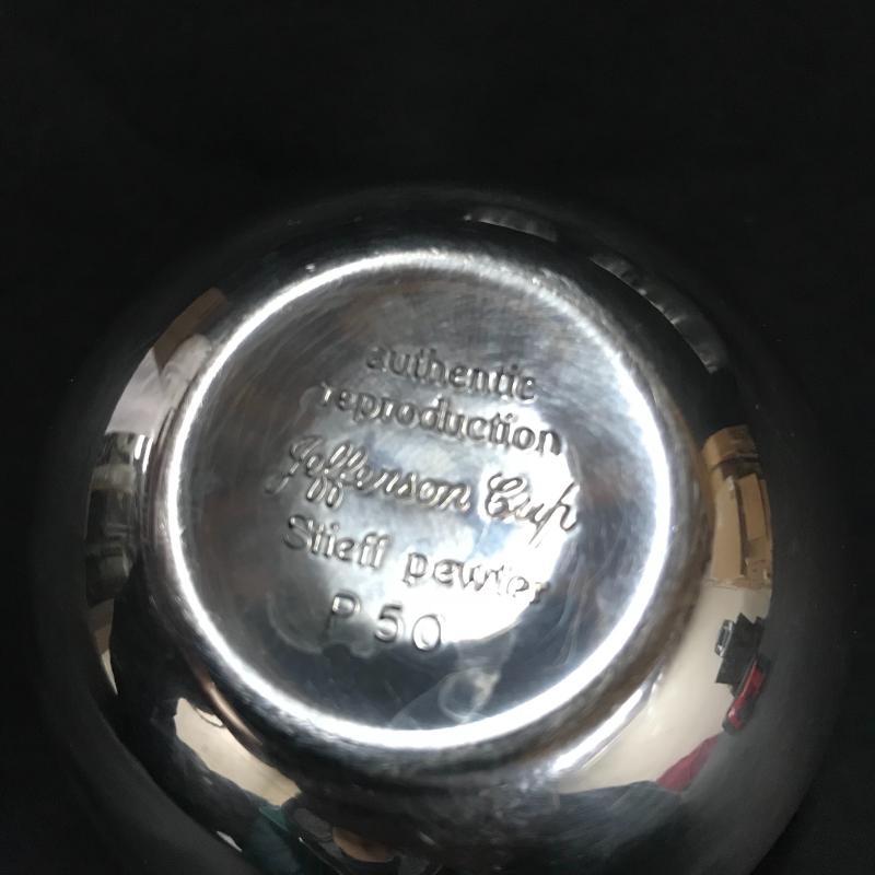Set of four Stieff pewter cups, approx. 2.5” tall. Markings on bottom read “Authentic Reproduction Jefferson Cup, Stieff Pewter P 50.” Shipping available or local pickup in Asheville, NC.
