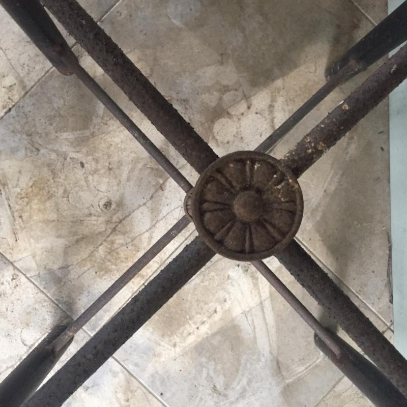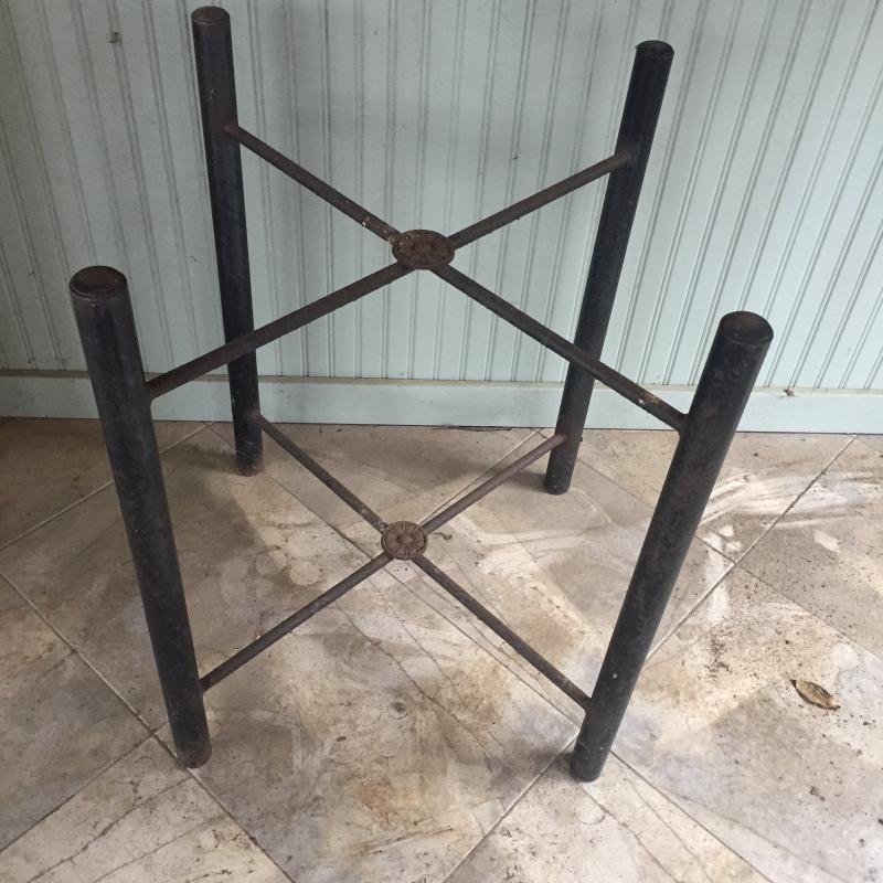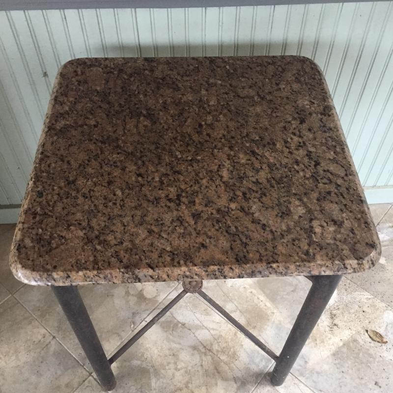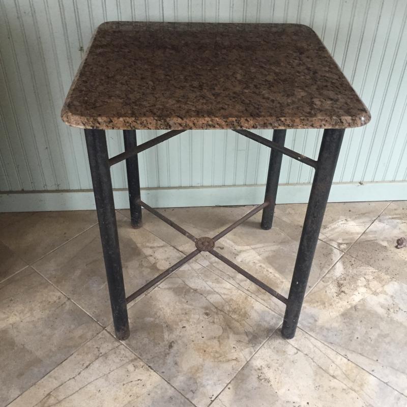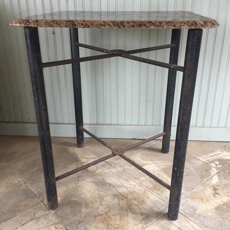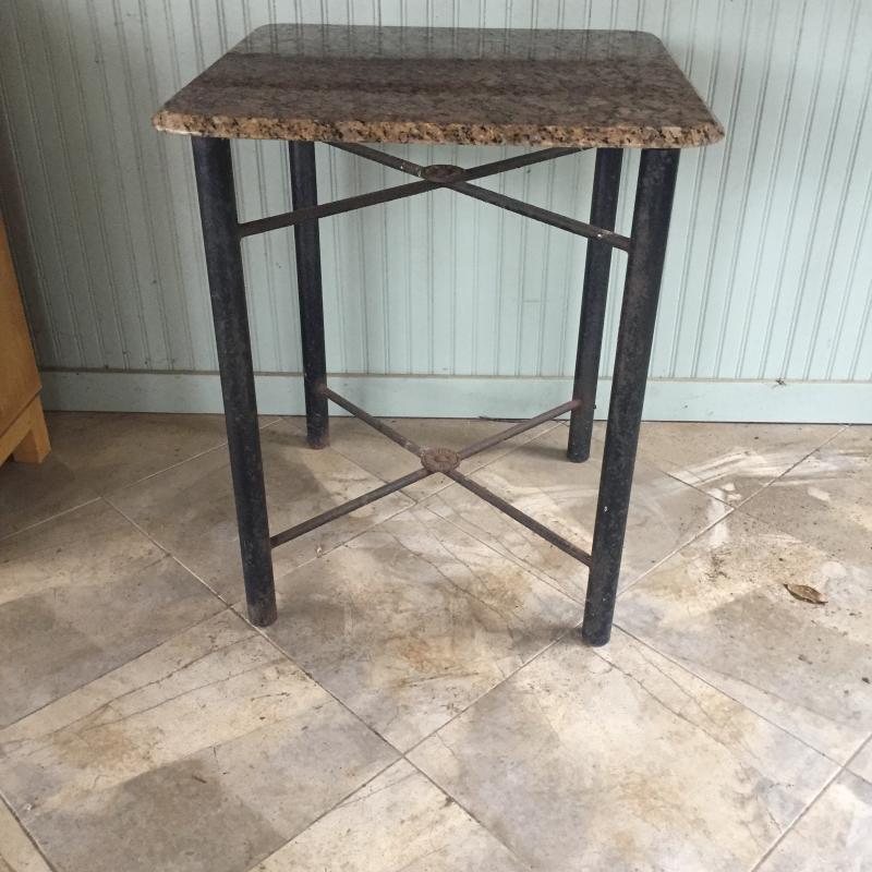 Attractive stone topped table with metal base. Base has surface rust but is solid. A little paint and have a good as new table. Top can be removed. Table measures 24.5” x 25.5” x 30.5”.