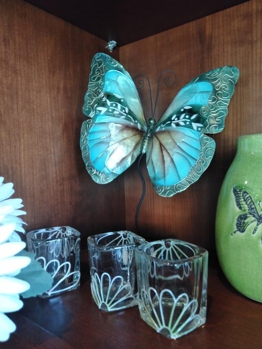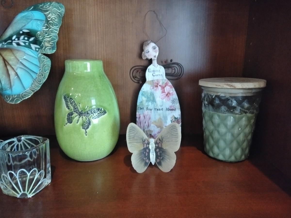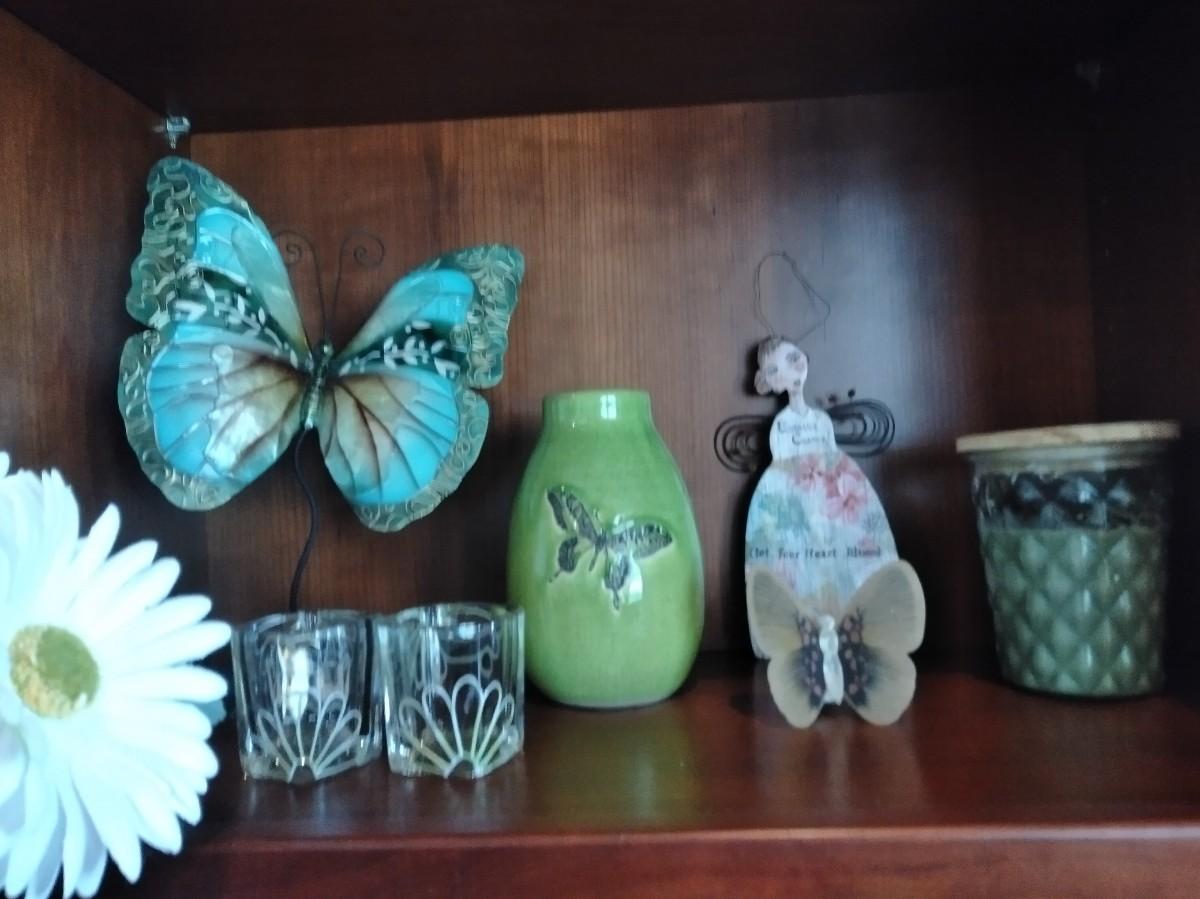 TALL FAUX FLOWERS IN COLORED VASE, LARGE BUTTERFLY ON STAND, THREE FLORAL CANDLE HOLDERS, BUTTERFLY ON GREEN VASE, AND MORE