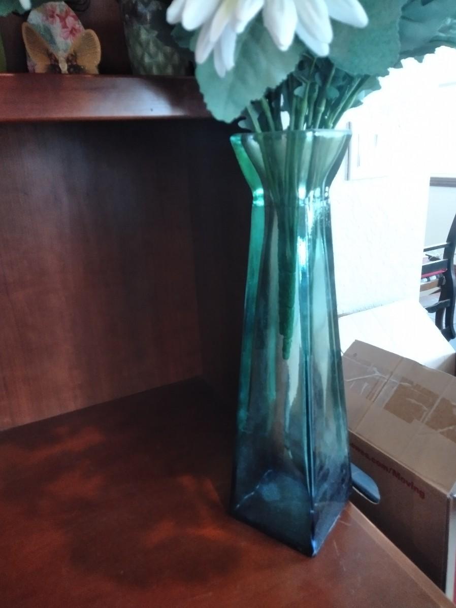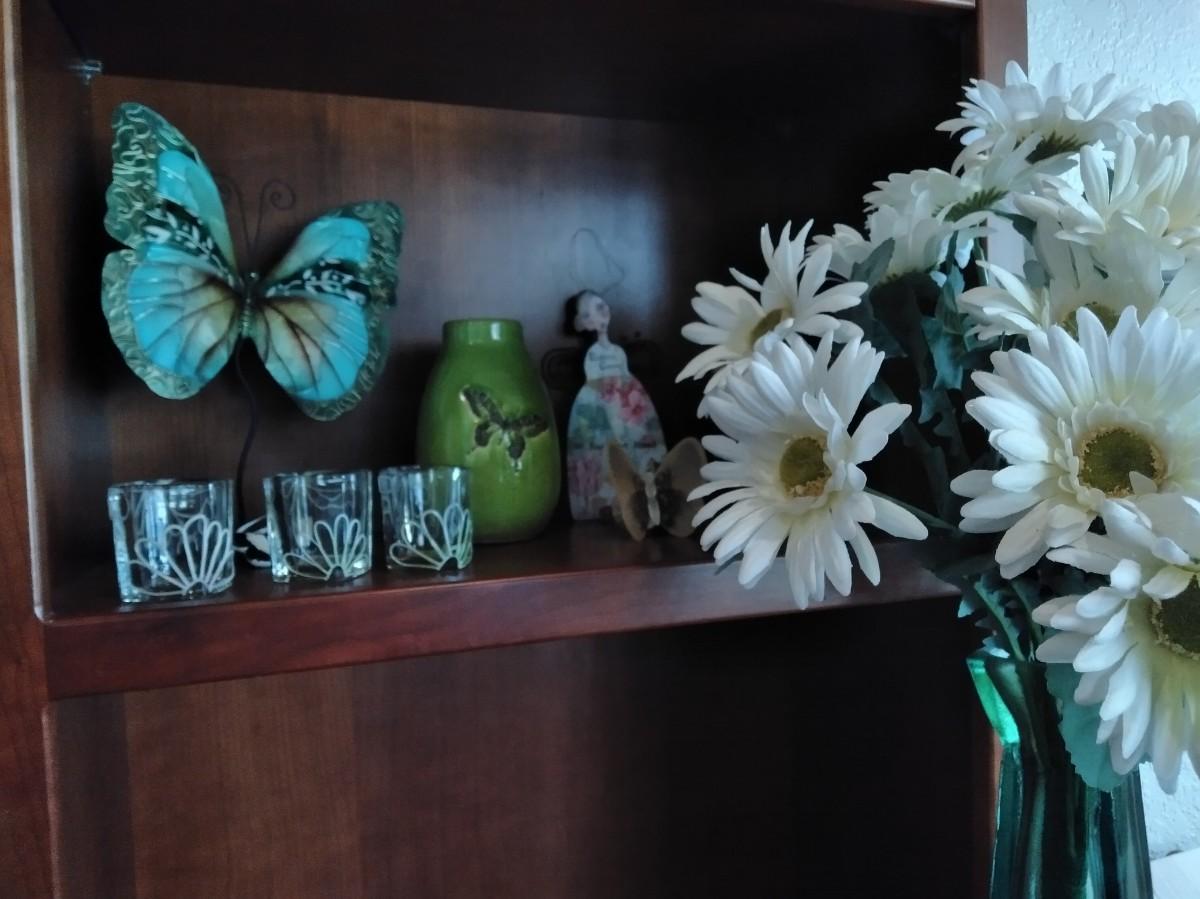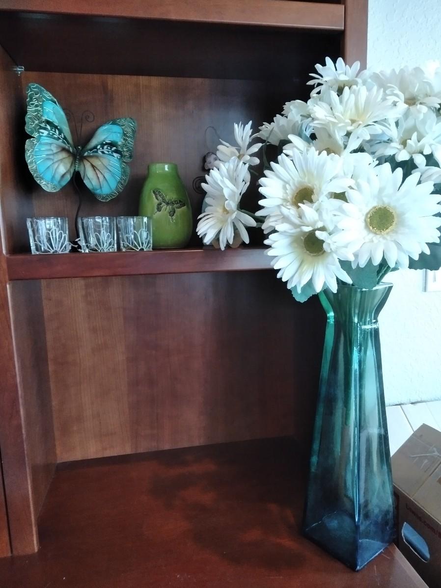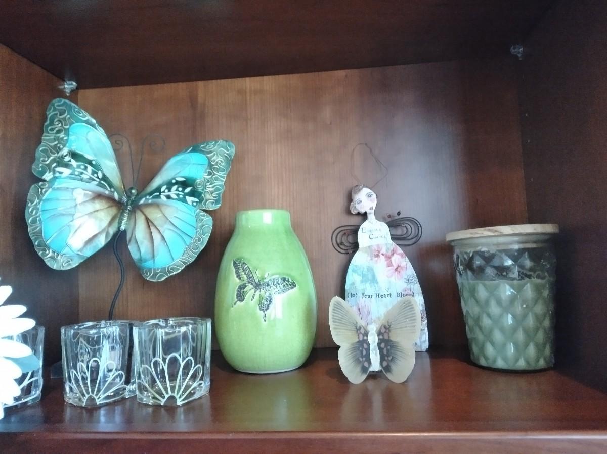 TALL FAUX FLOWERS IN COLORED VASE, LARGE BUTTERFLY ON STAND, THREE FLORAL CANDLE HOLDERS, BUTTERFLY ON GREEN VASE, AND MORE