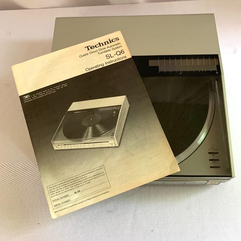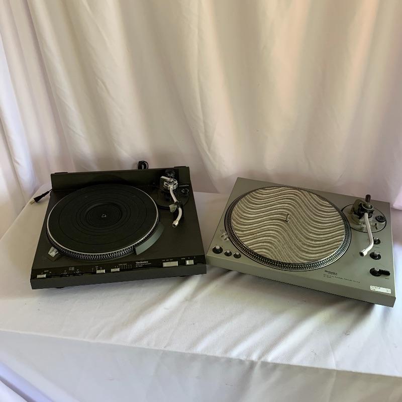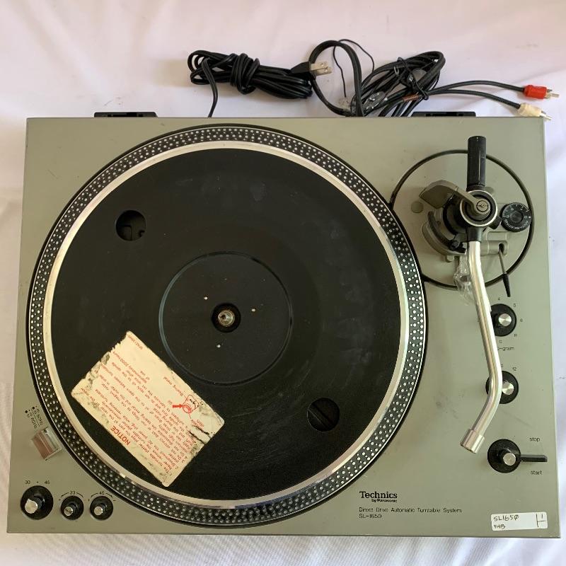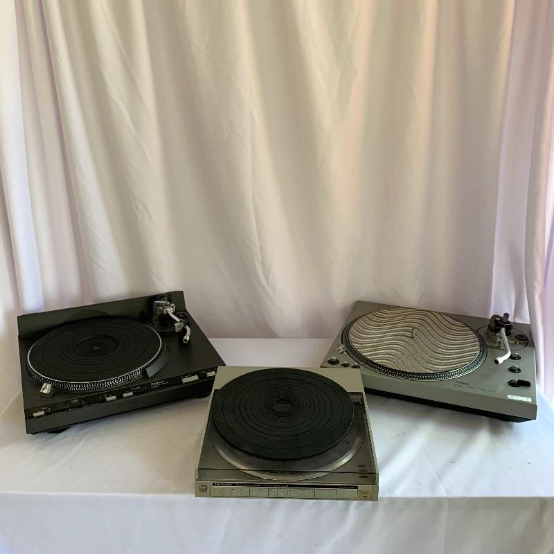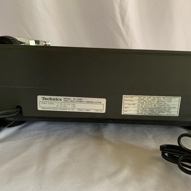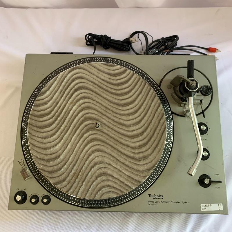 This lot includes three Technics turntables. One is a Technics Direct Drive Automatic Turntable System SL-1650. It powers on and spins when plugged in. It has an anti-skating feature and a memo-gram. The next one is a Technics Direct Drive Automatic SL-3360. It also has an anti-skating feature and a memo-gram. It powers on when plugged in. The third is a Technics Quartz Direct Drive Automatic Turntable System SL-Q6. It does not have an electrical cord to test functionality. It does come with operating instructions.