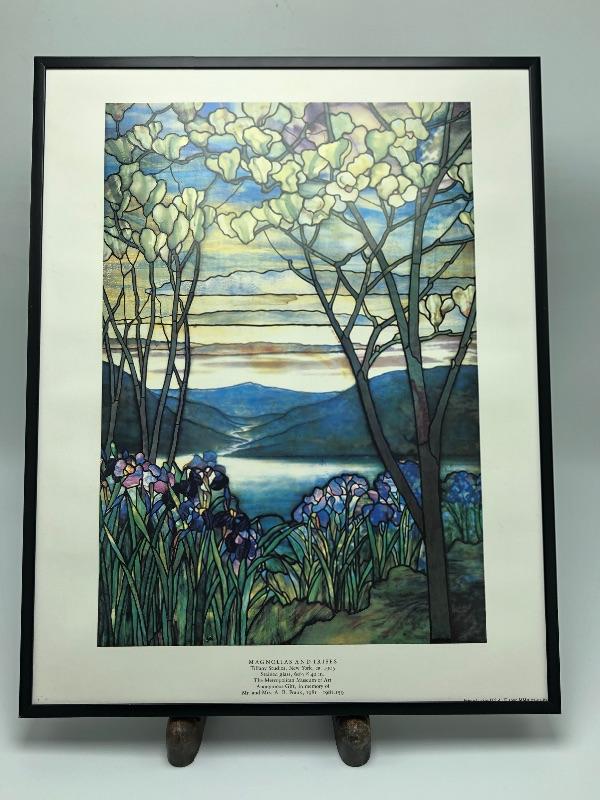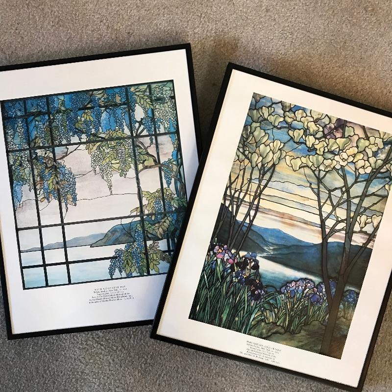 Enjoy this small lovely pair of framed Tiffany artwork that is ready to hang. Tiffany stained glass posters are yours for the holidays or give as a gift to that special someone.