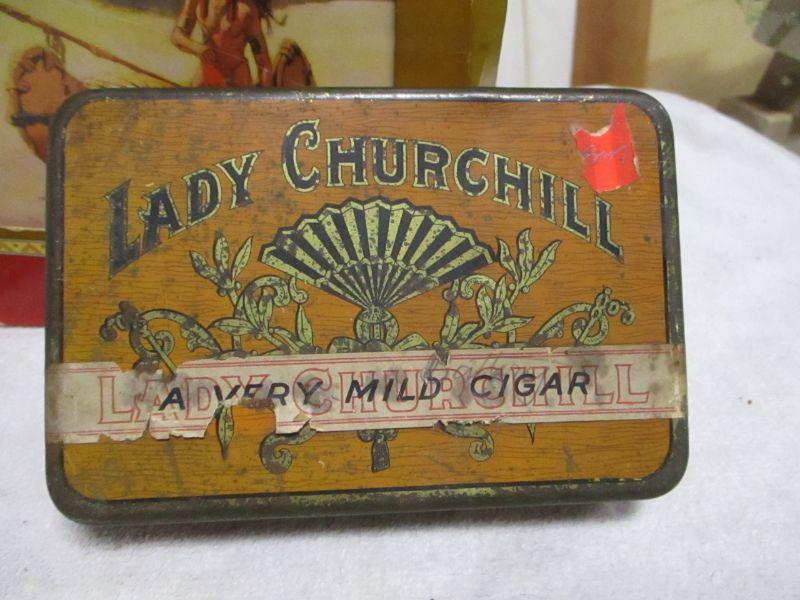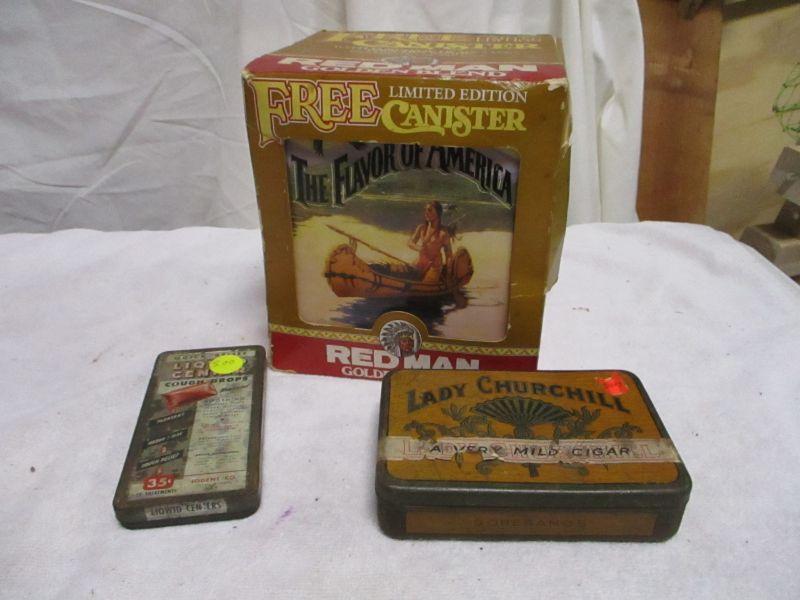 Lot 113 - Tin Canisters - Red Man Lady Churchill Liqwid Cent Cough Drops