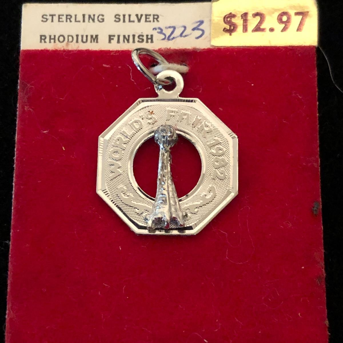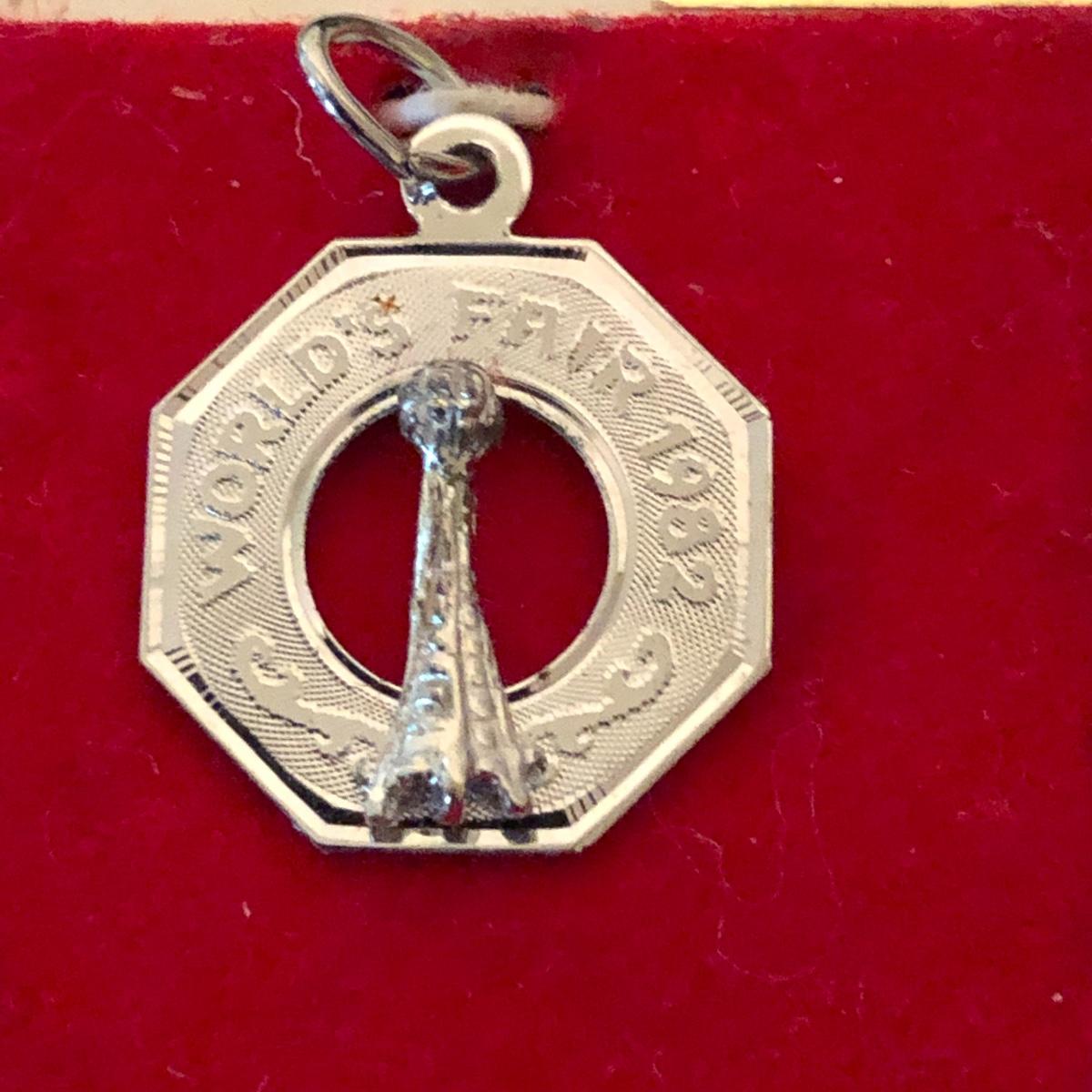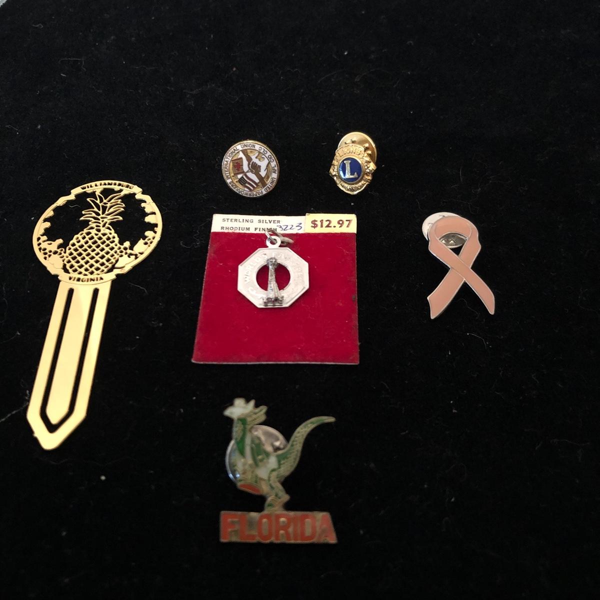 This lot includes one bookmark, four lapel pins and one sterling silver pendant. The sterling silver pendant says, “World Fair 1982.” Shipping Available.