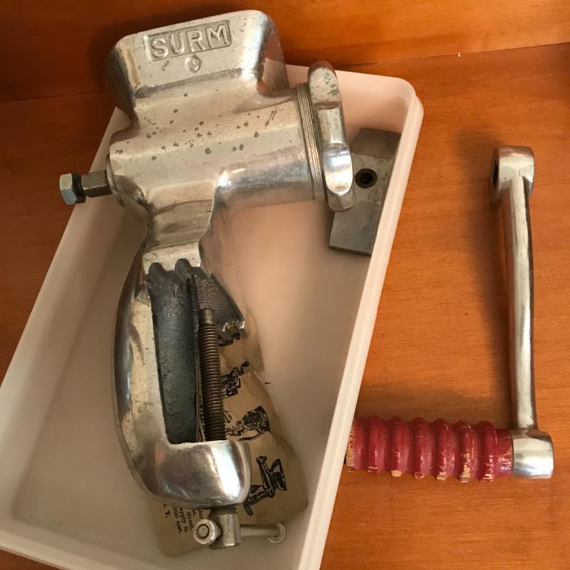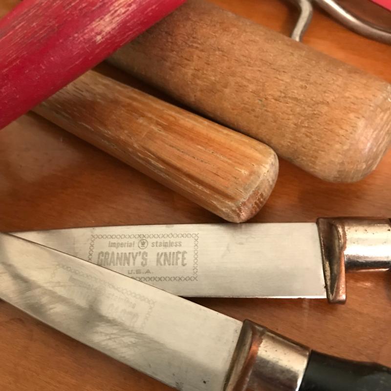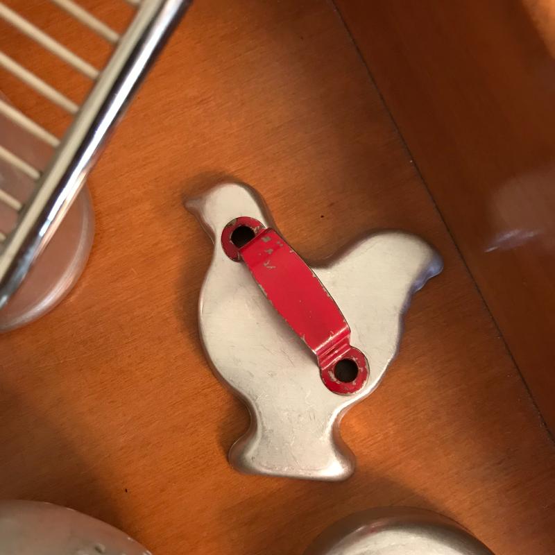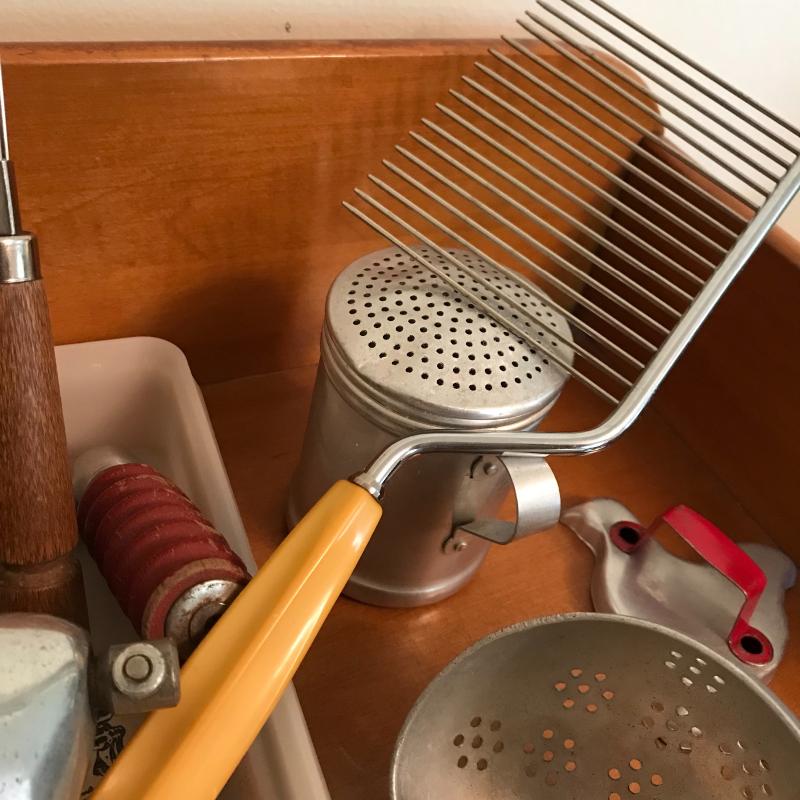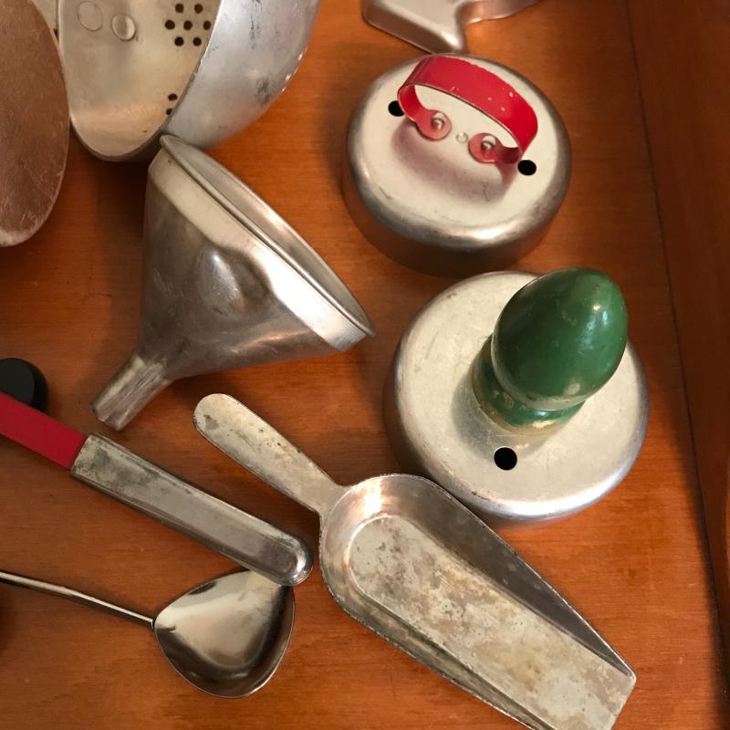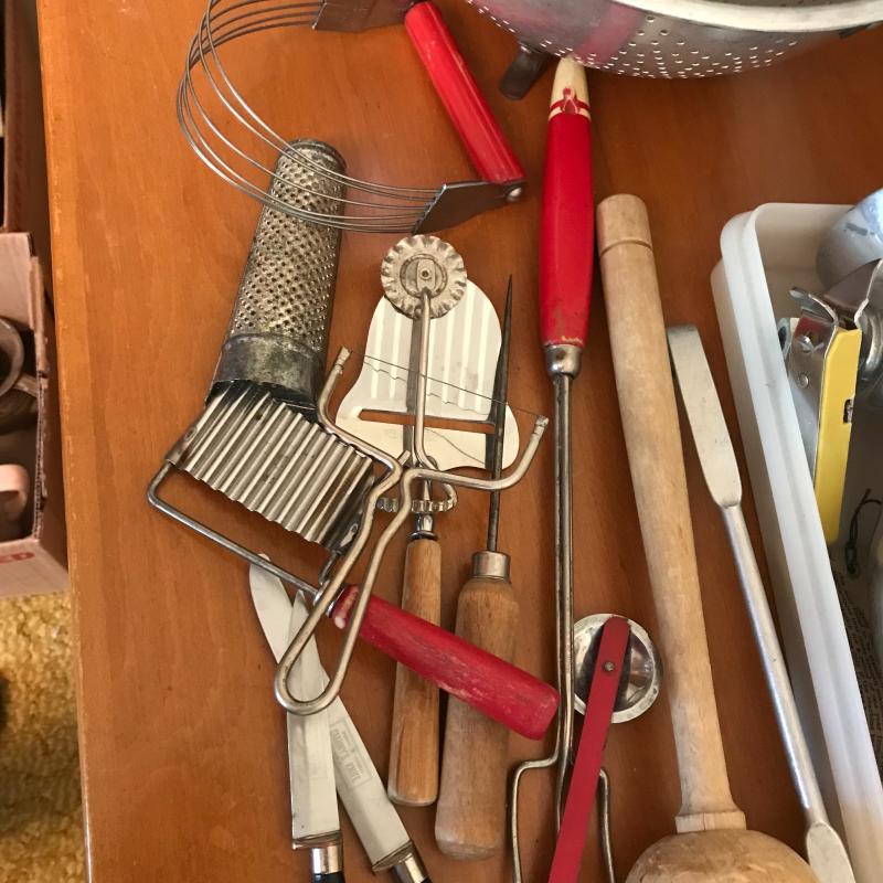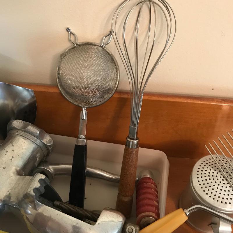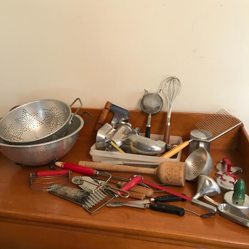 Fun lot of various vintage and newer kitchen items including aluminum colanders, cheese cutters, grater, chicken shaped dough form, meat grinder, and more! See photos. Local pick up only.